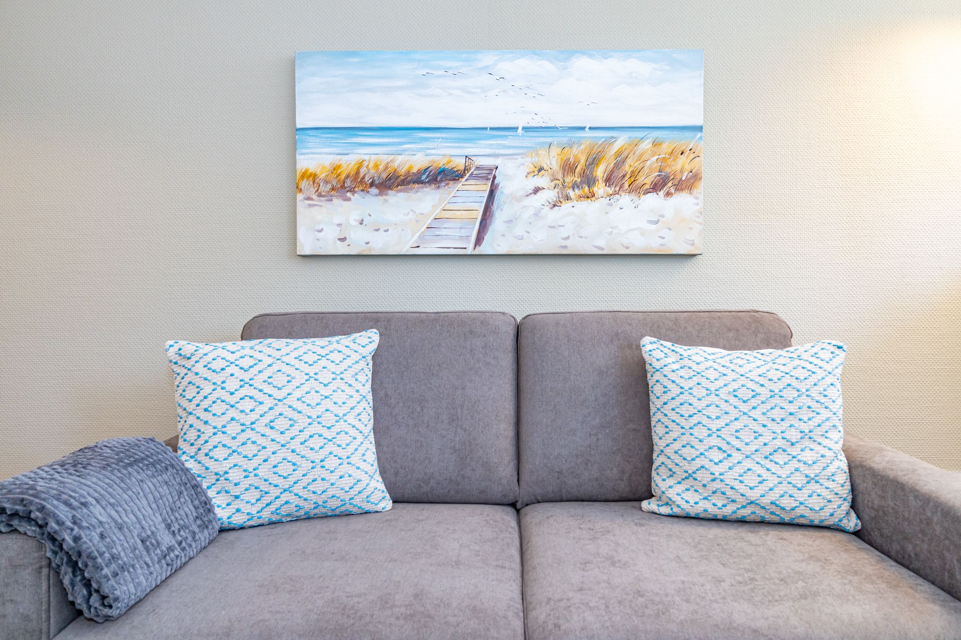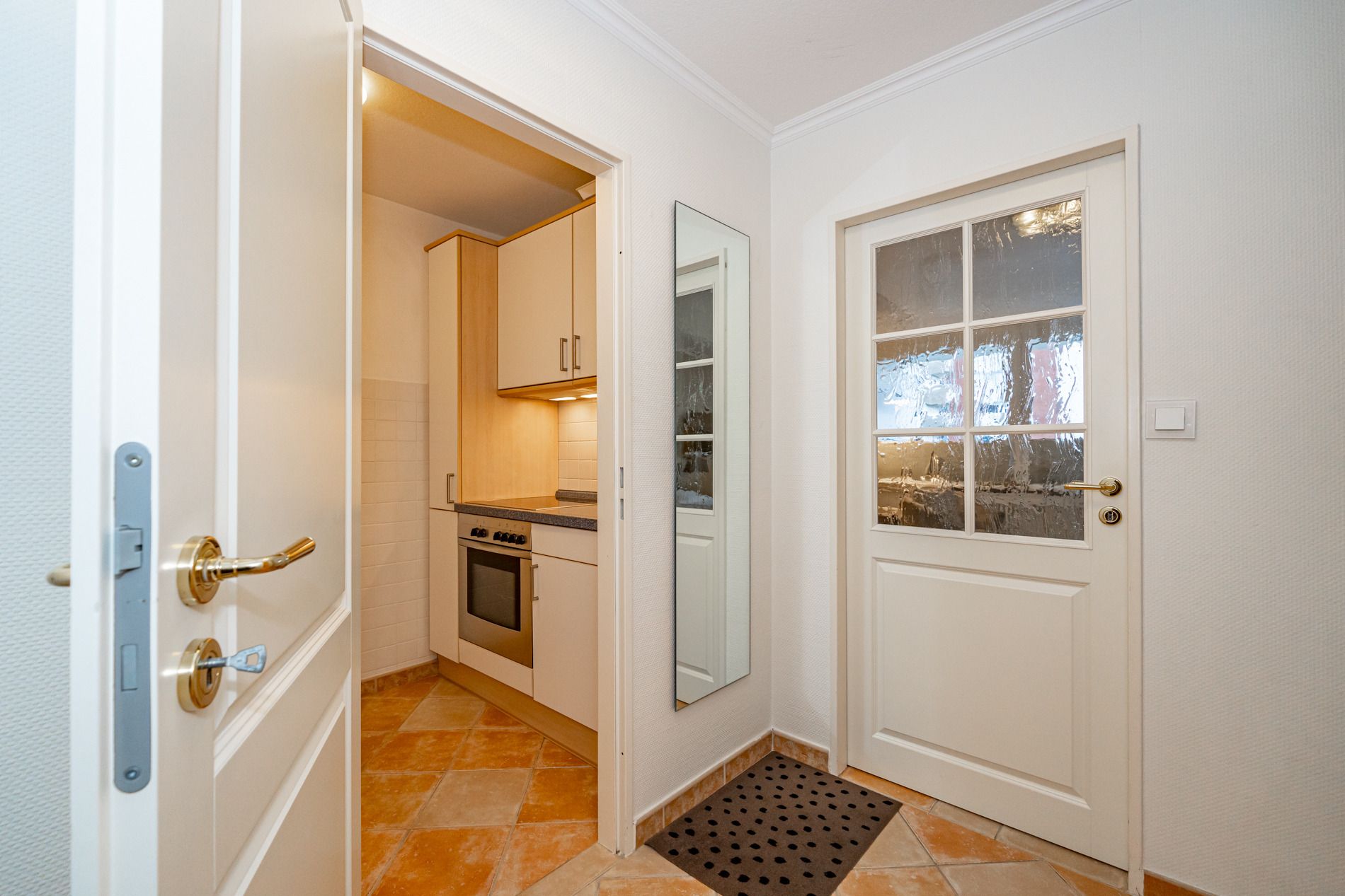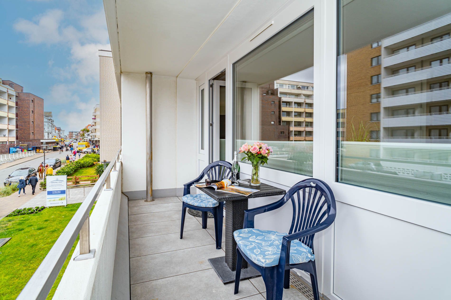 Komfortable, komplett mit Fliesen ausgelegte 1-Zimmer-Nichtraucher-Ferienwohnung (ca. 38 qm) in der 1. Etage zur Landseite mit Ostloggia (Morgensonne, Balkonmöbel vorhanden) für max. 2 Personen.