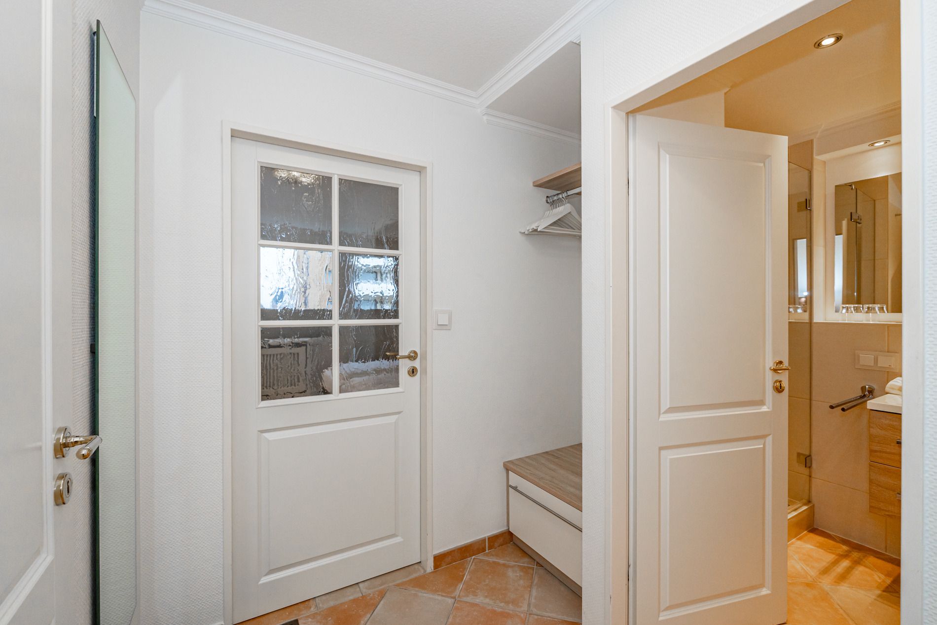 Das neue, helle Badezimmer ist mit einer Dusche mit extraflachem Einstieg, einem Waschtisch, ein WC und einem festinstallierten Fön ausgestattet.