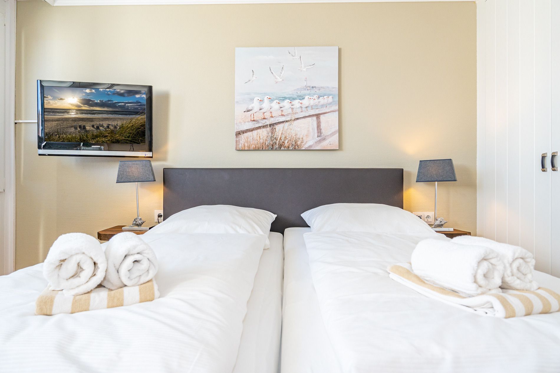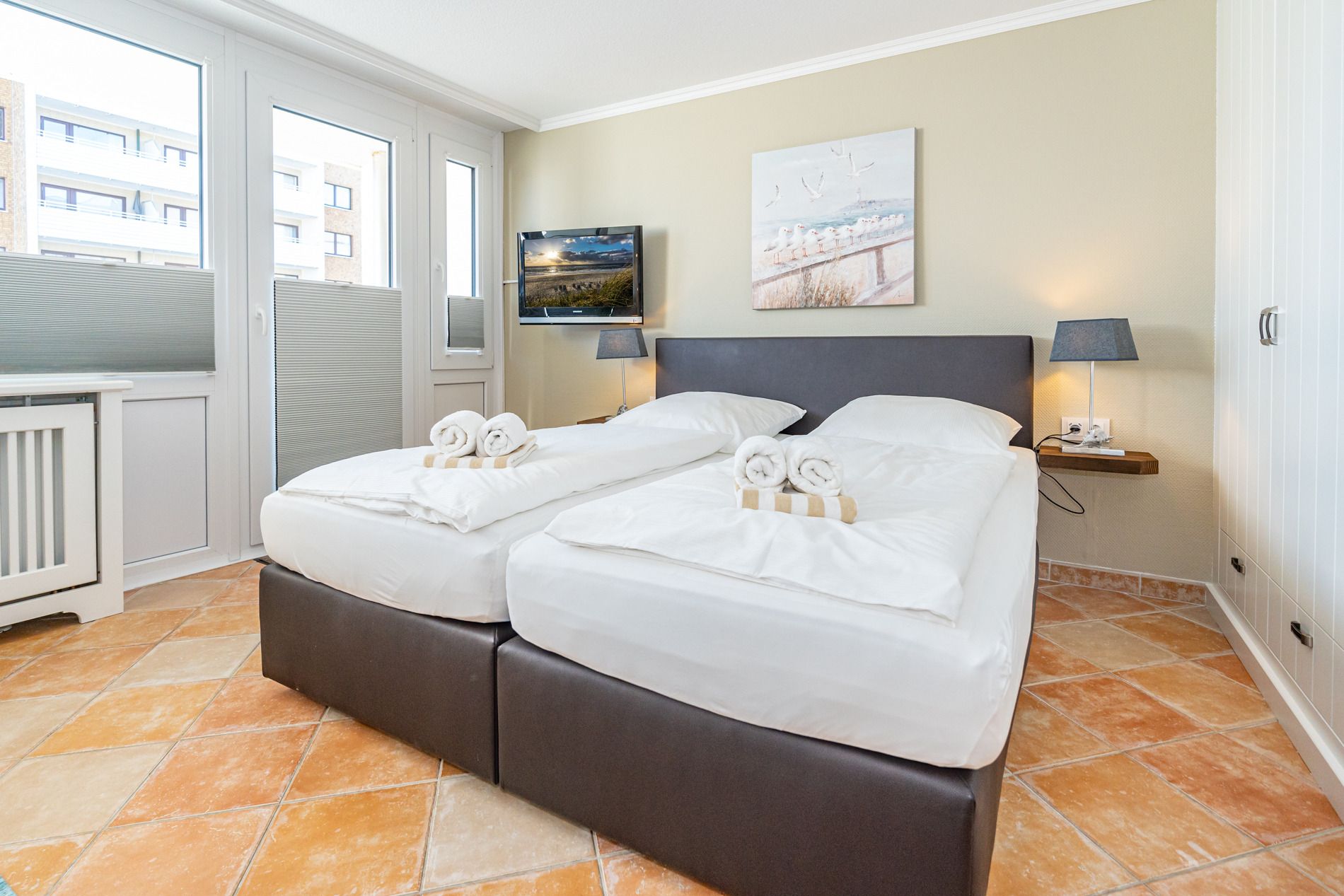 Der Wohn-/Schlafraum besteht aus einer gemütlichen Sitzgarnitur (Zweisitzer und einem Sessel mit Fußhocker), einem neues Boxspringbett (zwei Einzelmatratzen), einem Essplatz, Kabel-Flachbild-TV, Radio.