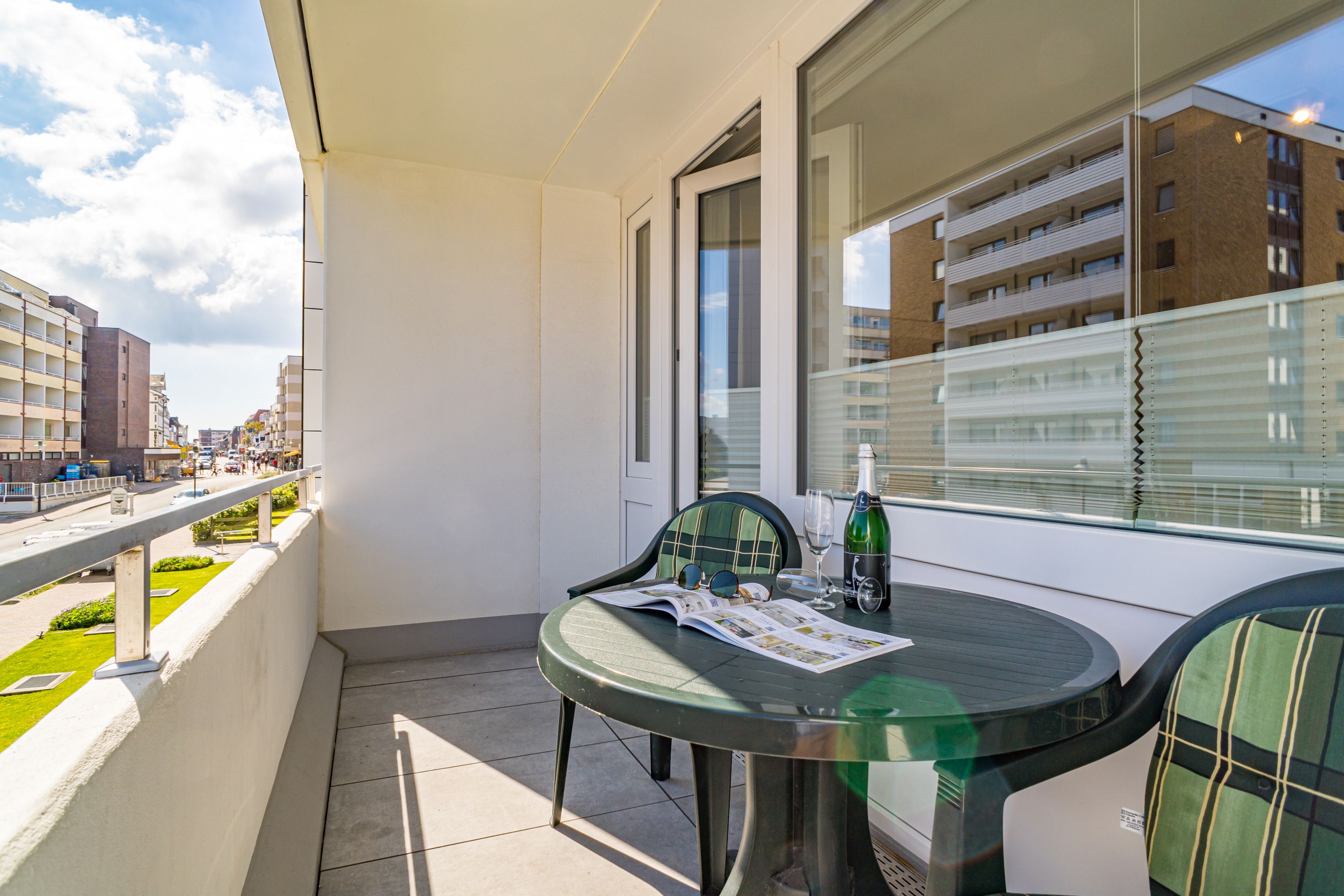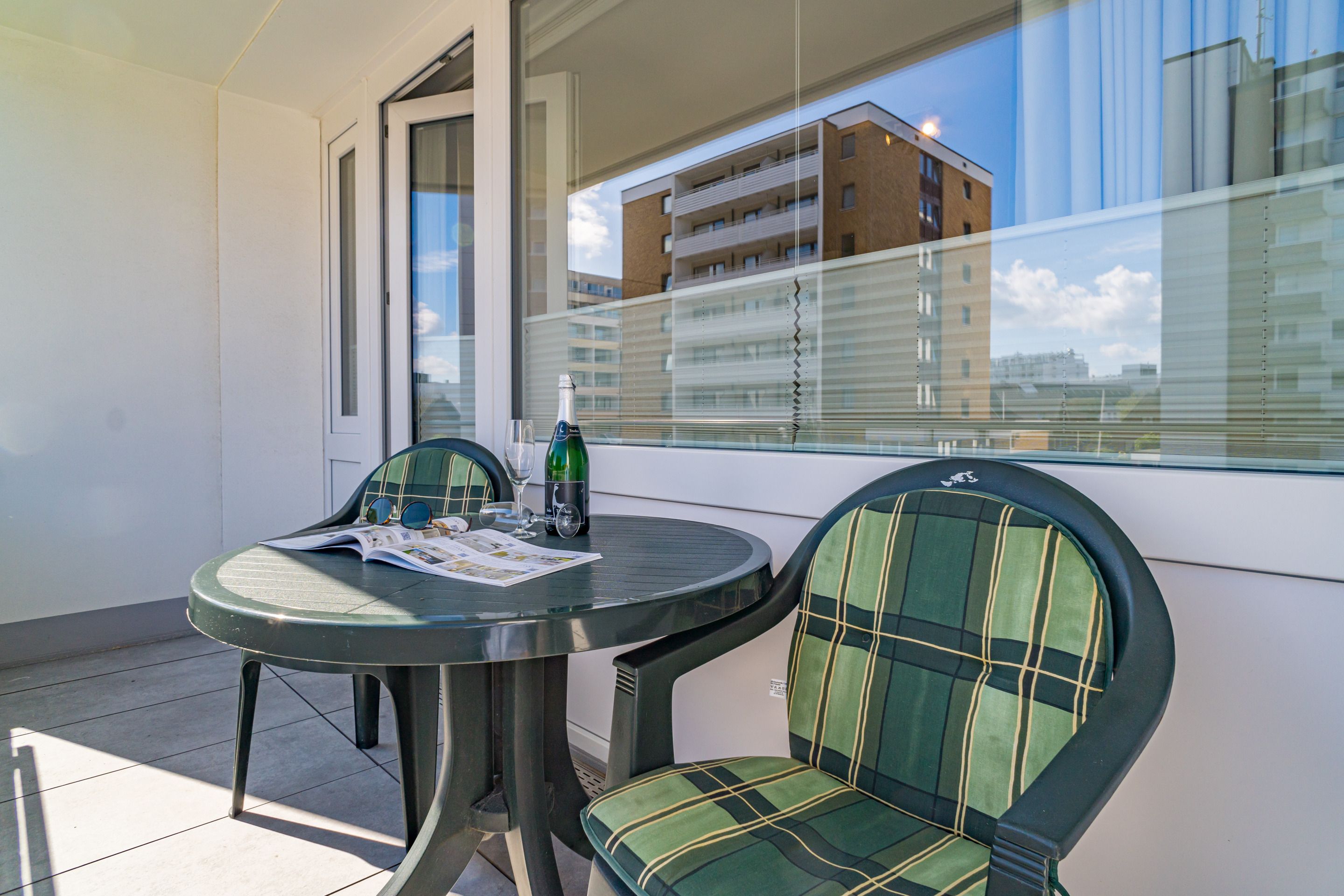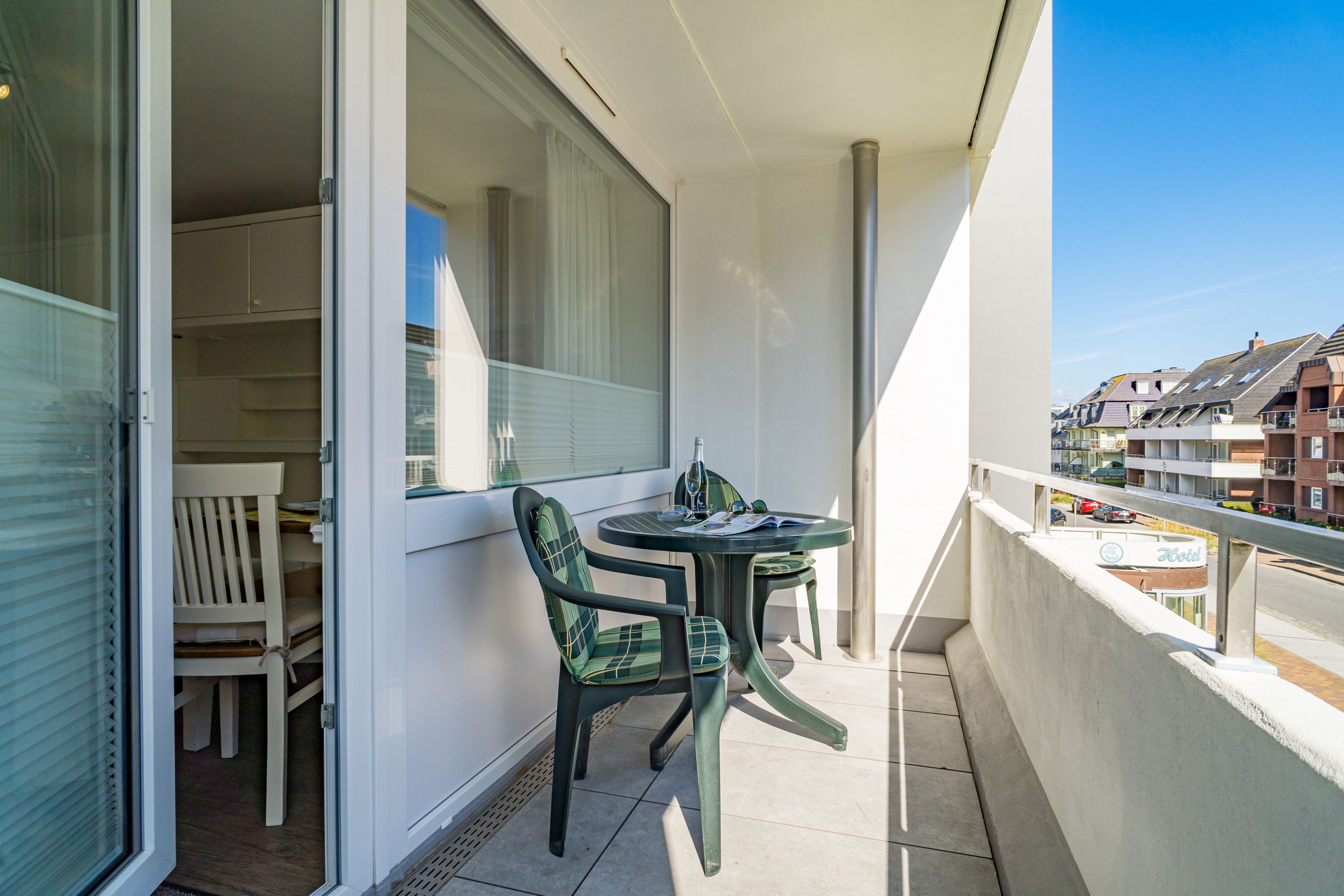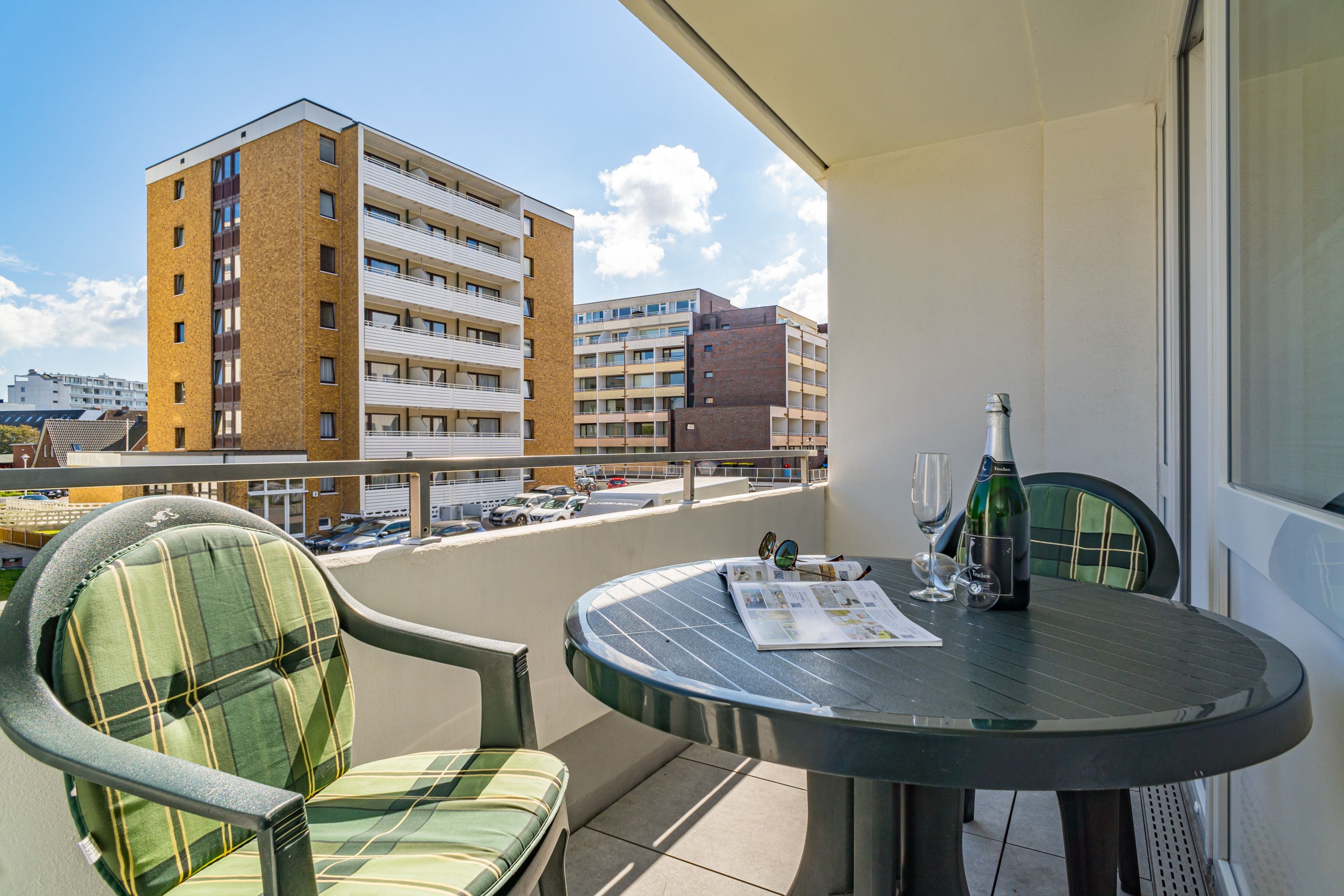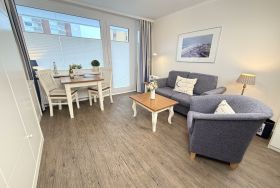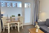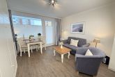 Gemütliche 1-Zimmer-Nichtraucher-Ferienwohnung (ca. 28 qm) in der 1. Etage zur Landseite mit Ostloggia (Morgensonne, mit Balkonmöbeln und Auflagen) für max. 2 Personen.