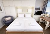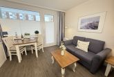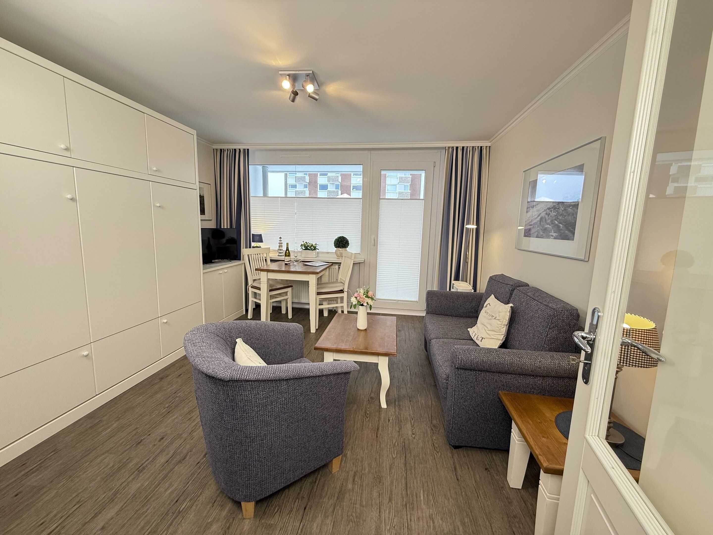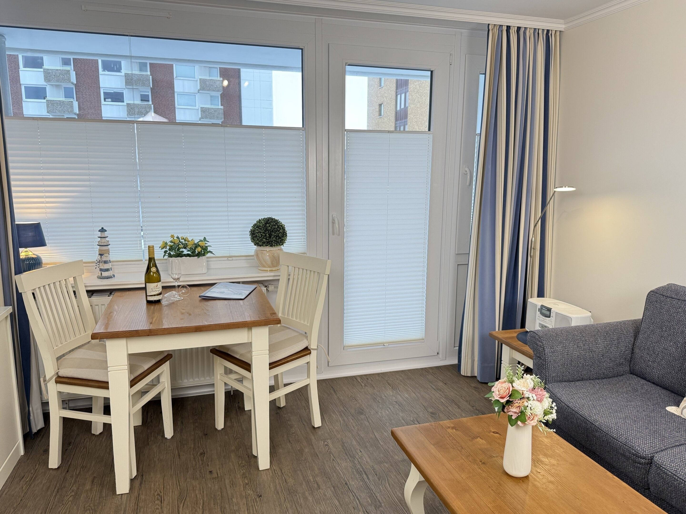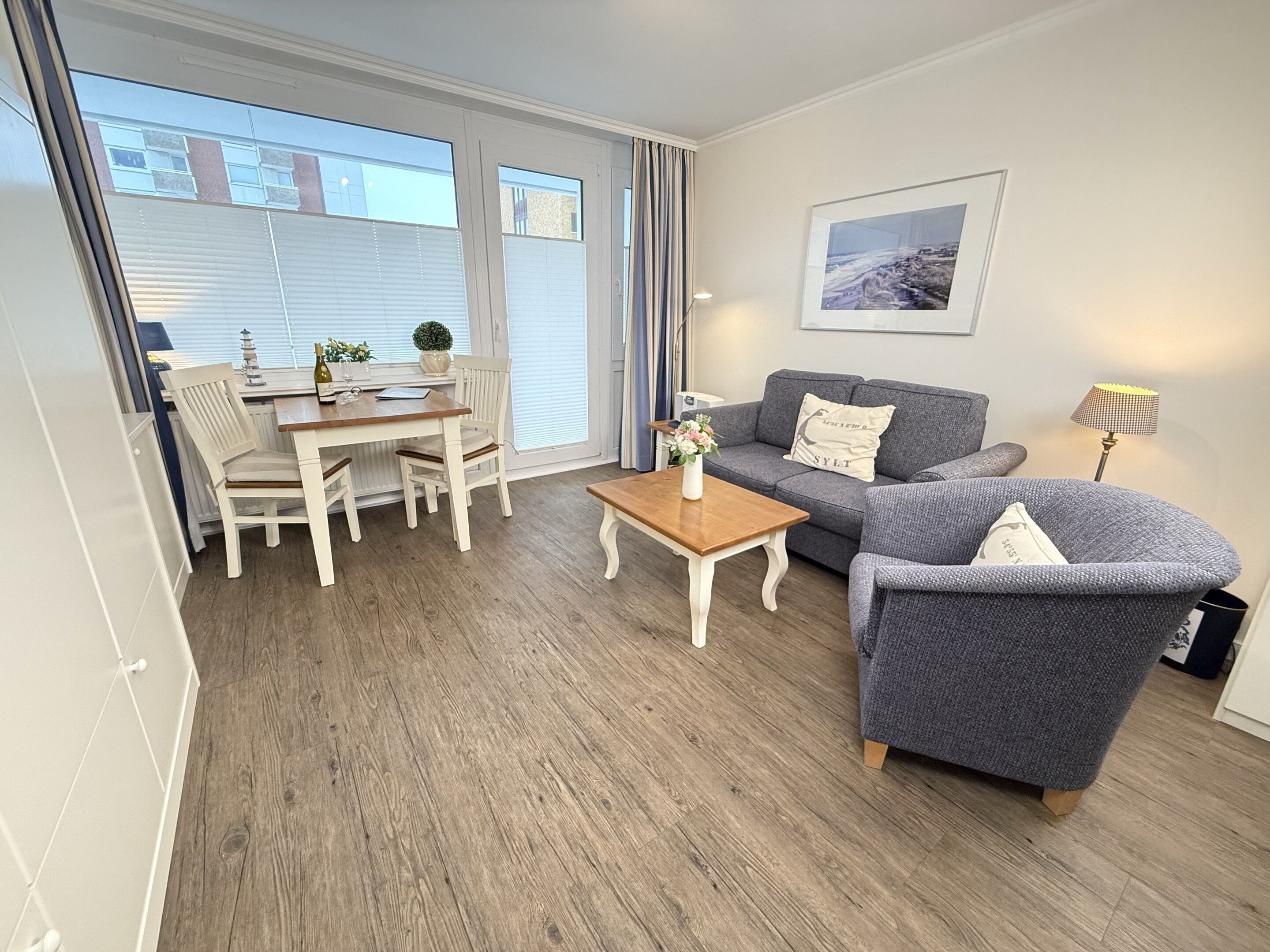 Das Wohn-/Schlafzimmer mit modernem Designerboden in Holzoptik hat ein Doppelschrankbett, eine gemütliche Sitzgarnitur (Zweisitzer und einen Sessel), einem Essplatz am Fenster, digitales Kabel-Flachbild-TV, Radio/CD.