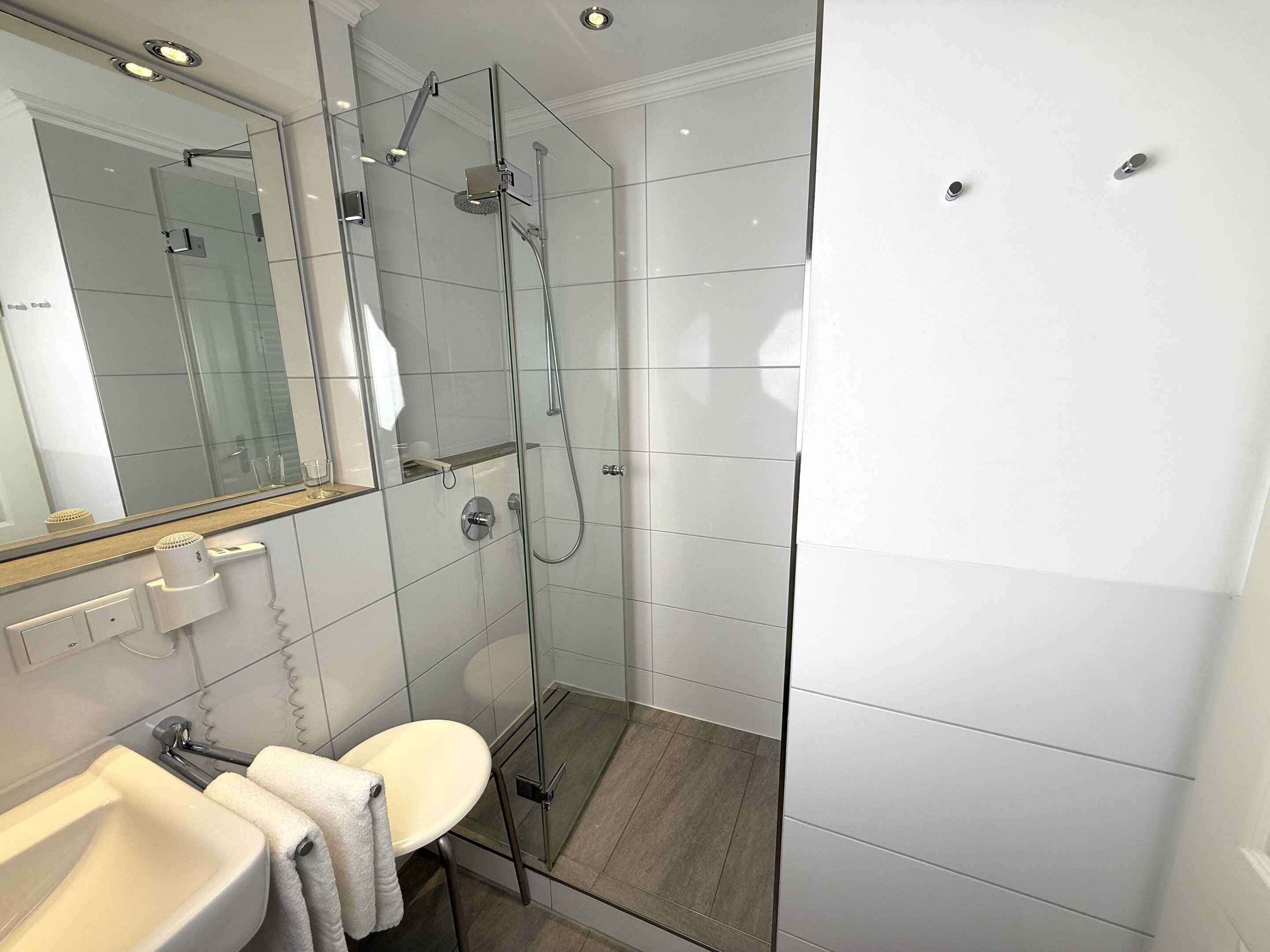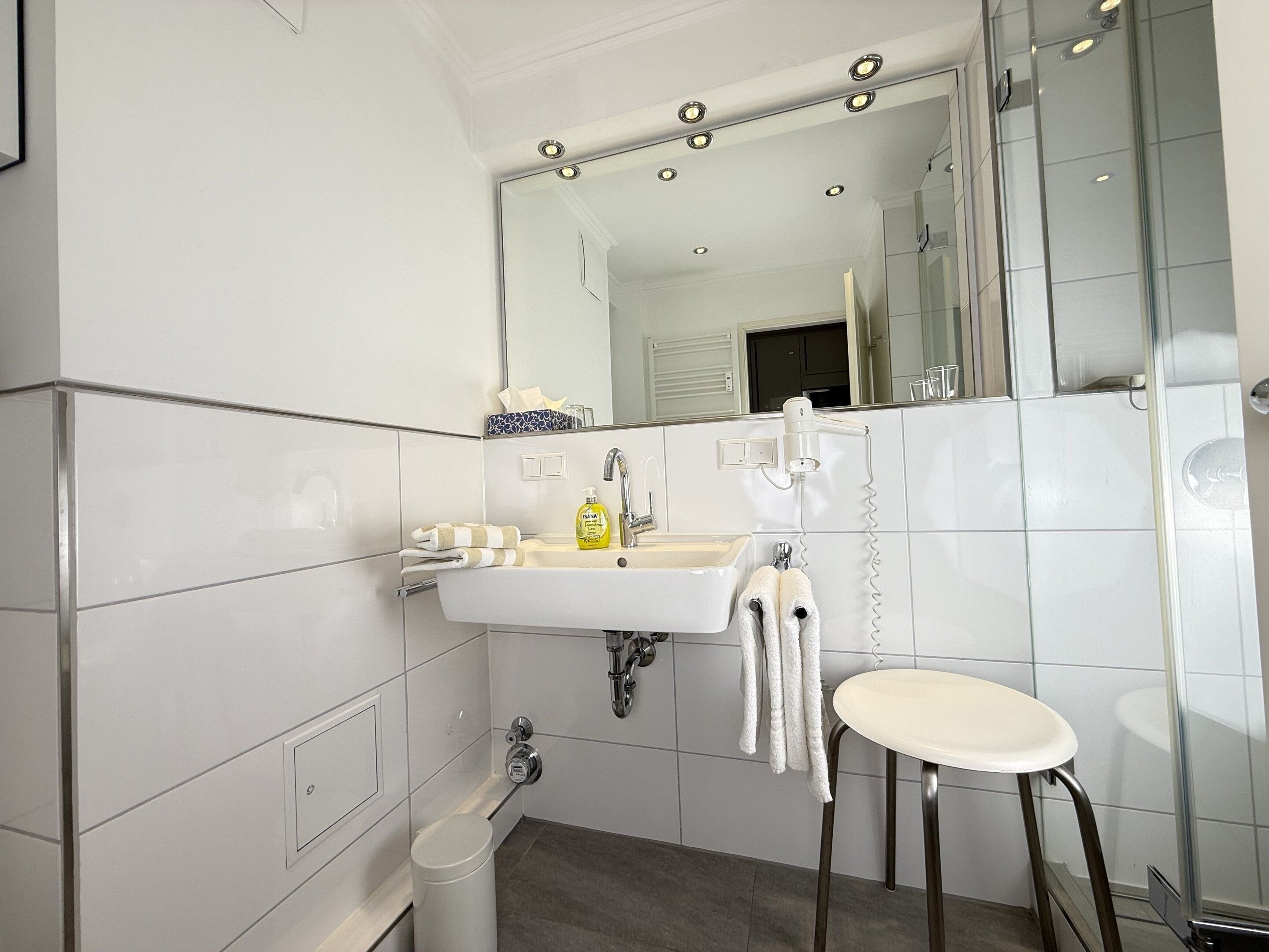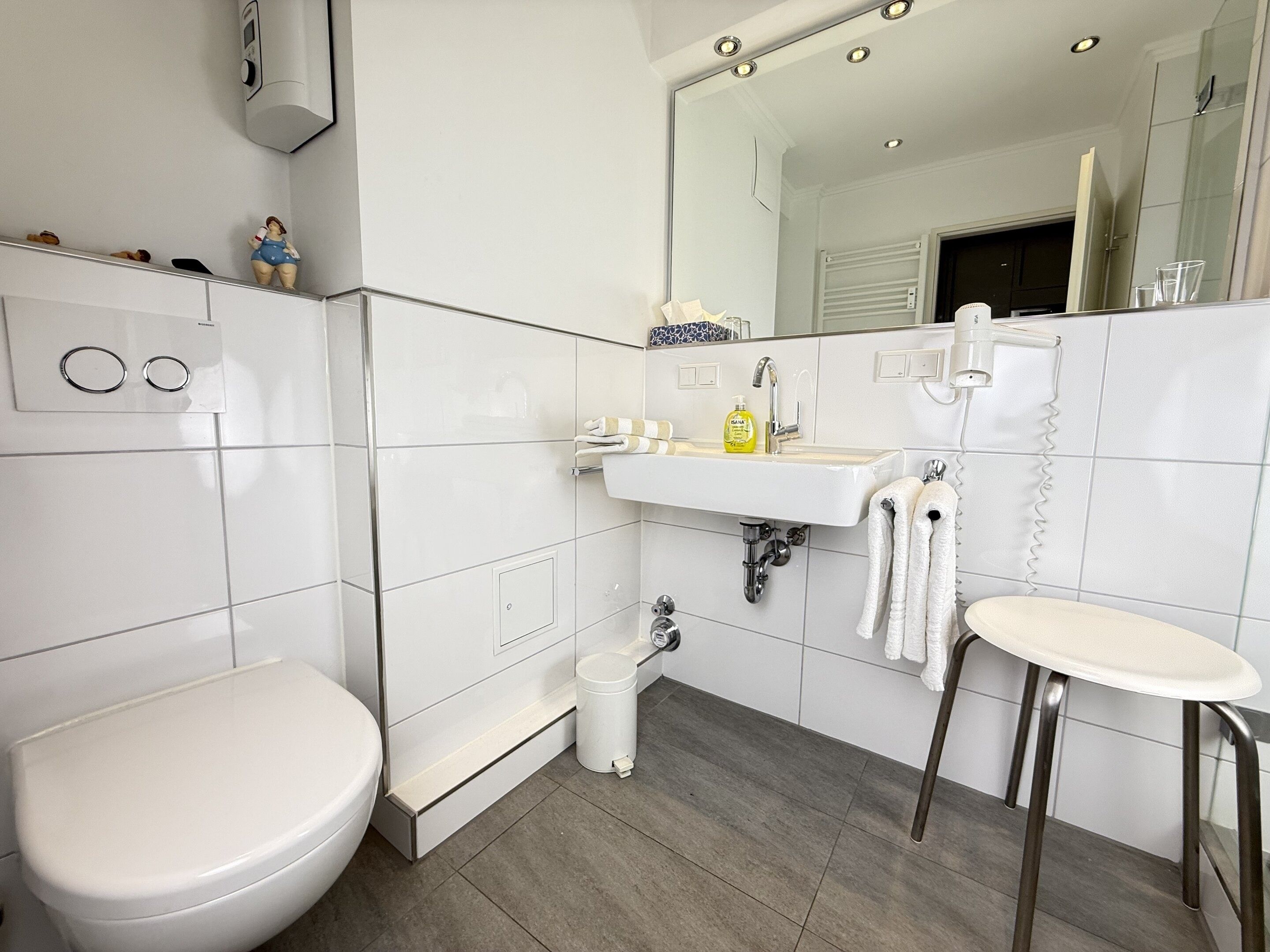 Das neue moderne Duschbad/WC hat einen Waschtisch und einen Fön.