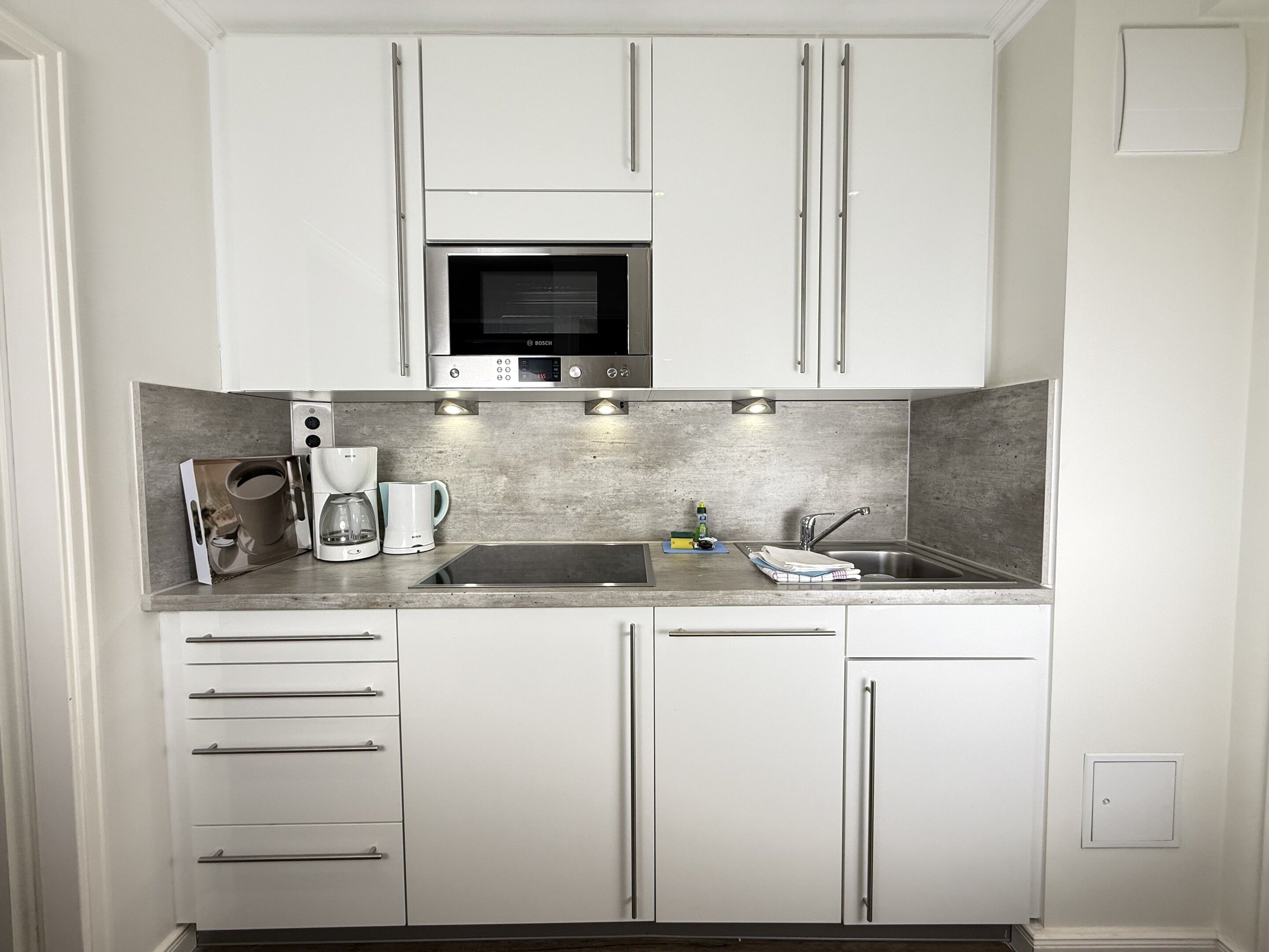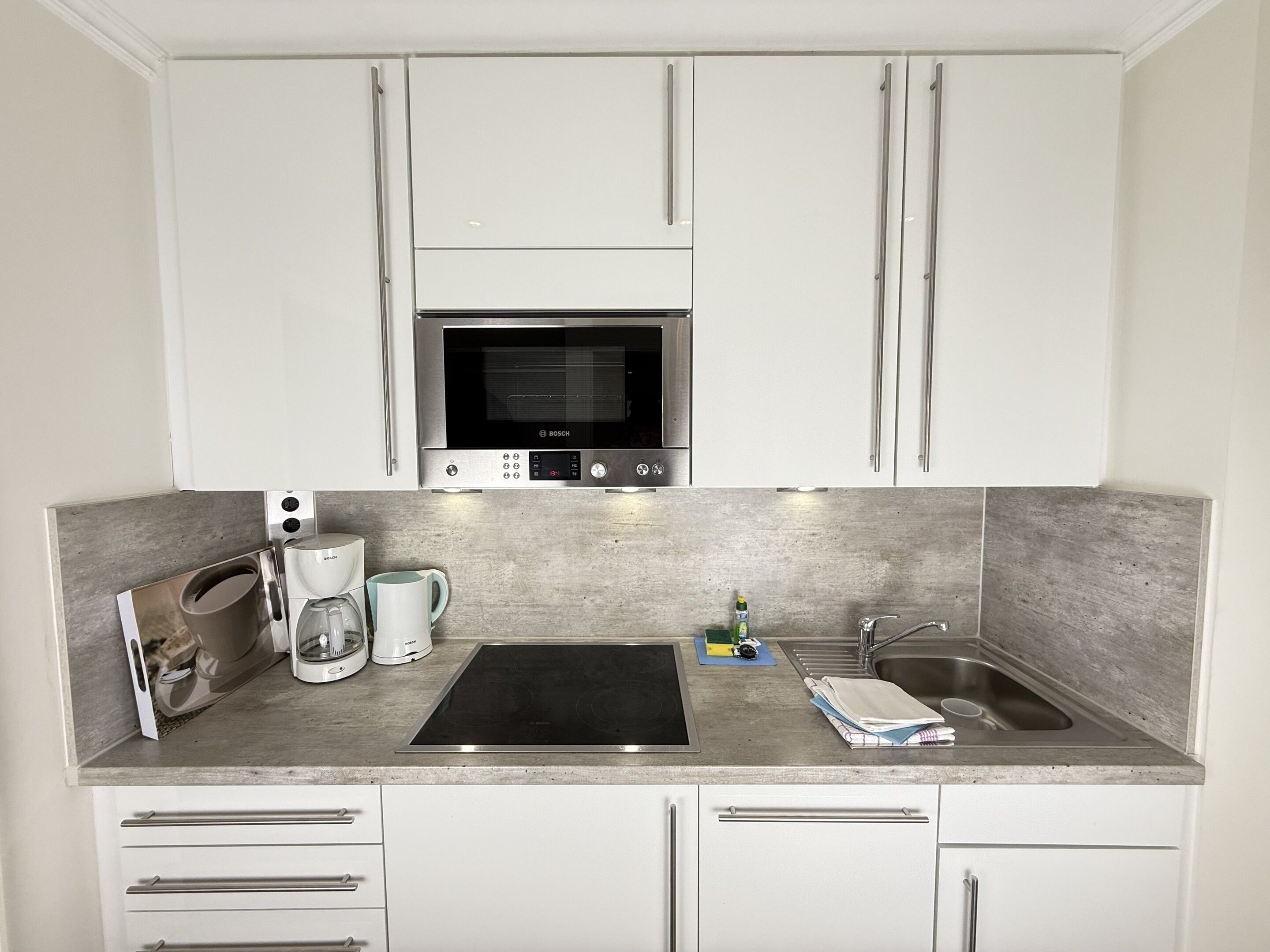 Die Küchenzeile hat einen Geschirrspüler, eine Mikrowelle, ein Ceranfeld mit 4 Kochfeldern, einen Kühlschrank mit 3*-Gefrierfach. Kaffeemaschine, Wasserkocher und Toaster gehören zur Grundausstattung.
