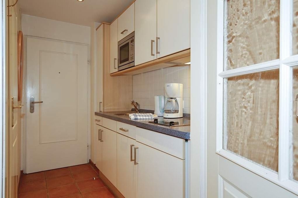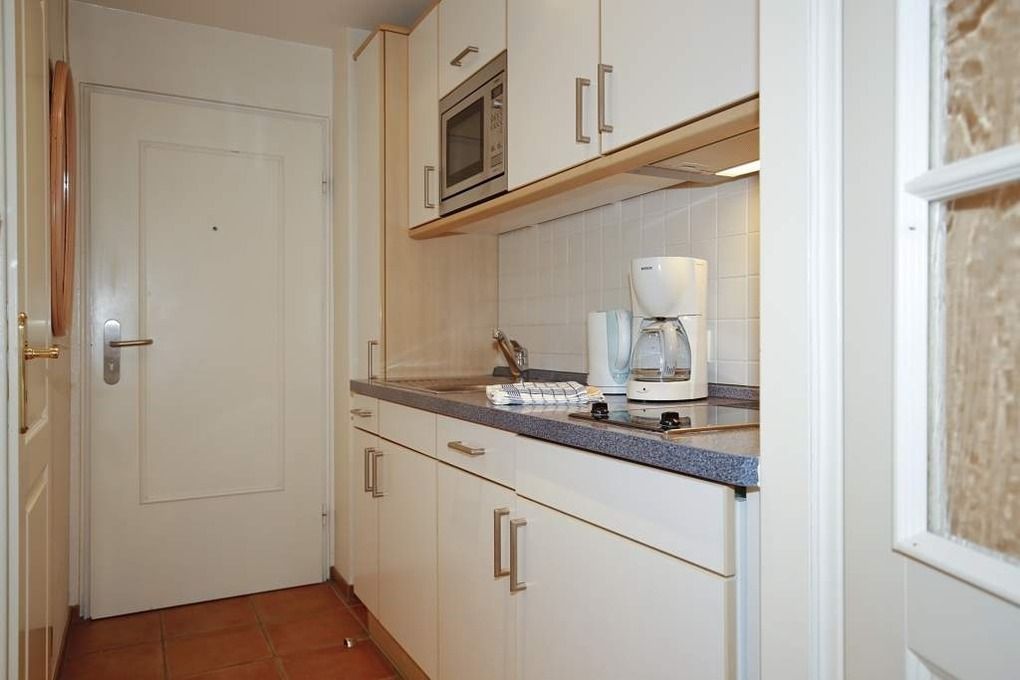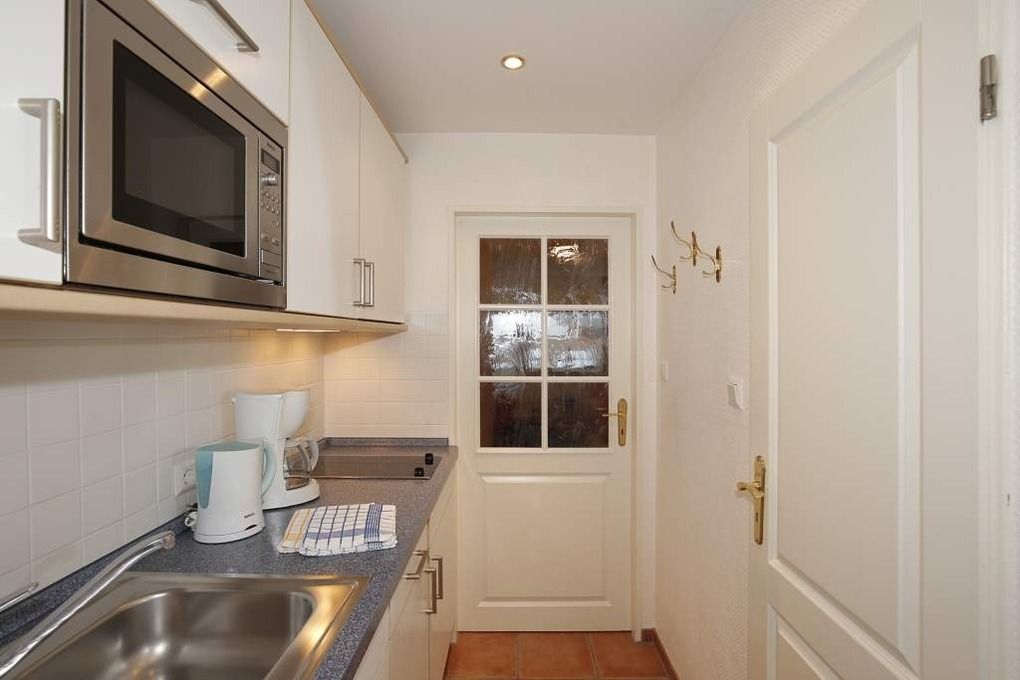 Die helle Küchenzeile hat eine Mikrowelle (mit Grillfunktion), ein Cerankochfeld und einen Kühlschrank mit 3-Sterne-Gefrierfach.