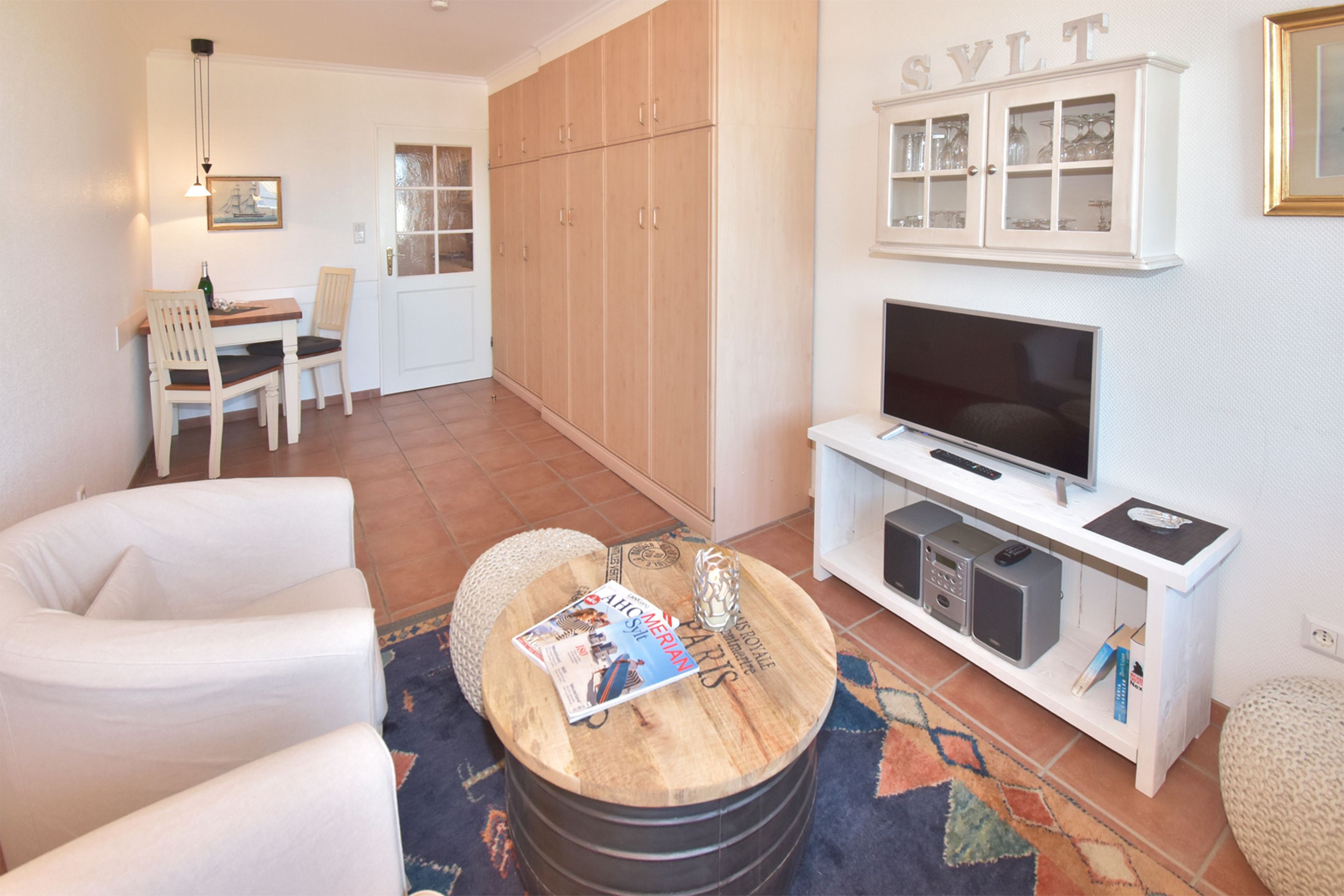 Der Wohn-/Schlafraum besteht aus 2 gemütlichen Cocktail-Sesseln, hochwertigen Doppelschrankbetten (einzeln klappbar), separatem Essplatz, Flachbild-TV (32 Zoll mit USB-Anschluss), HiFi-Anlage.