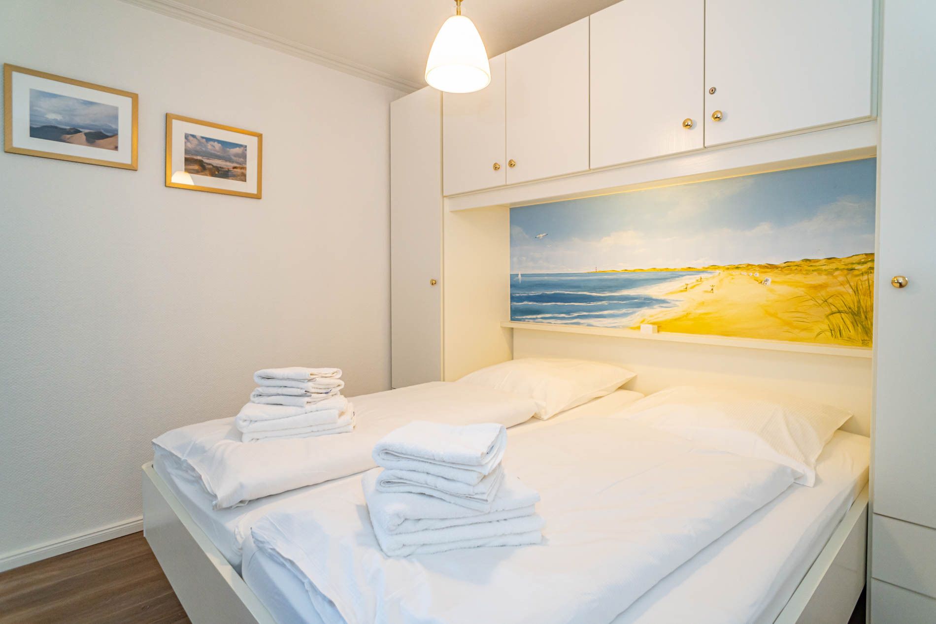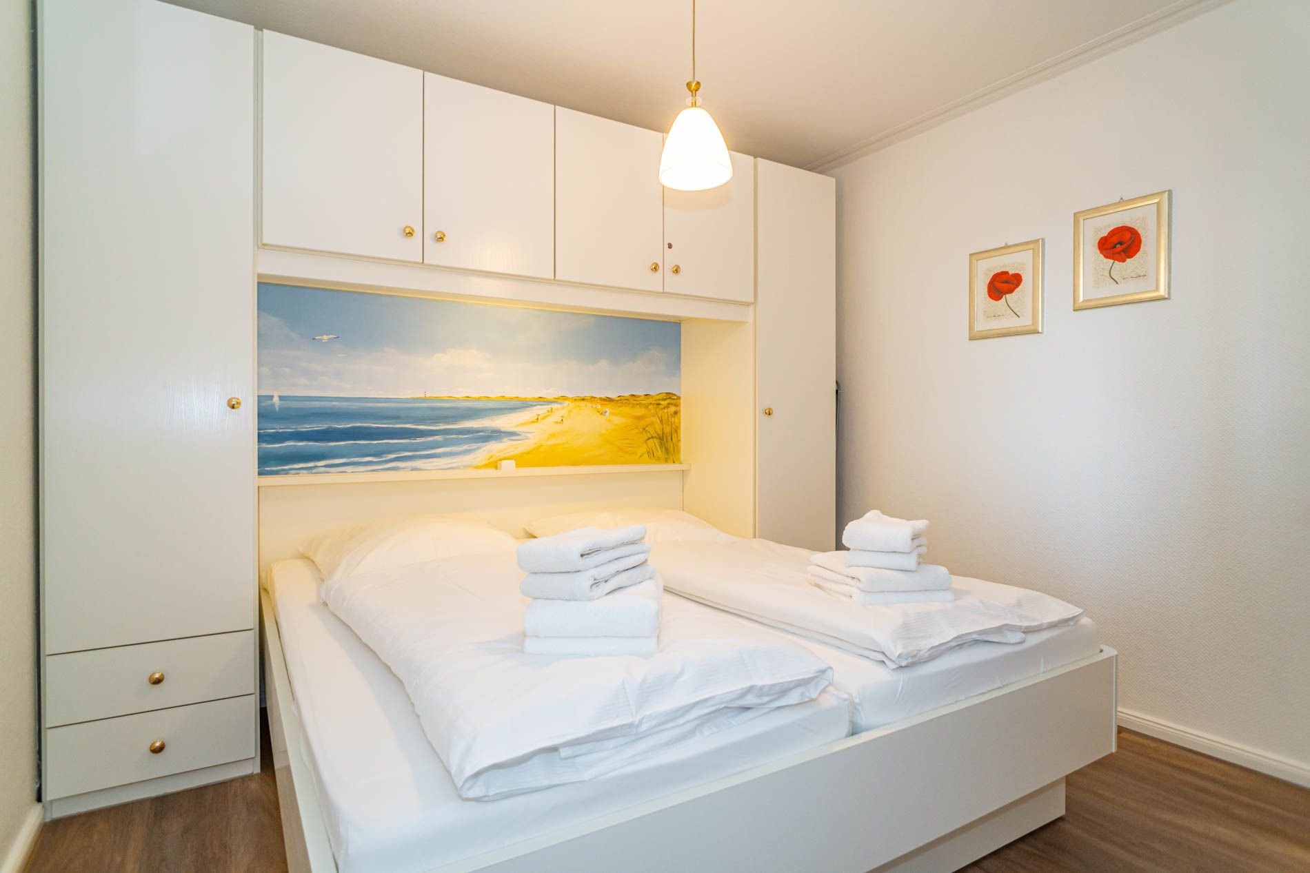 Die Schlafnische (durch eine Holz-Falttür vom Wohnzimmer abgetrennt) hat ein Doppelbett mit zwei Einzelmatratzen (0,90 x 2,00 m).