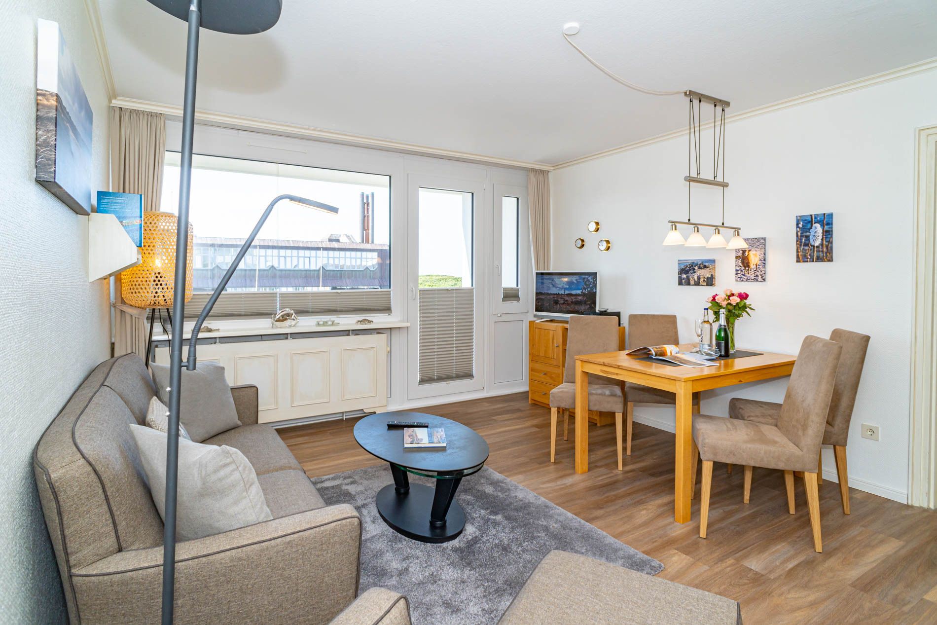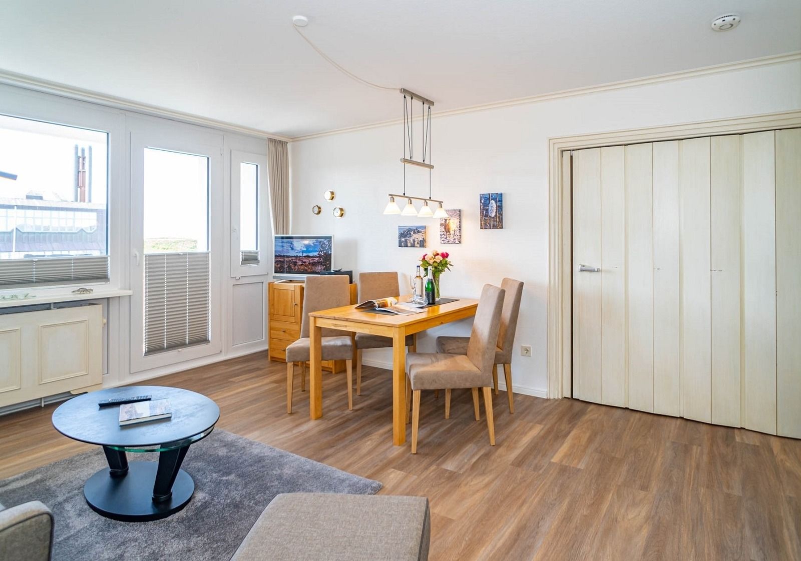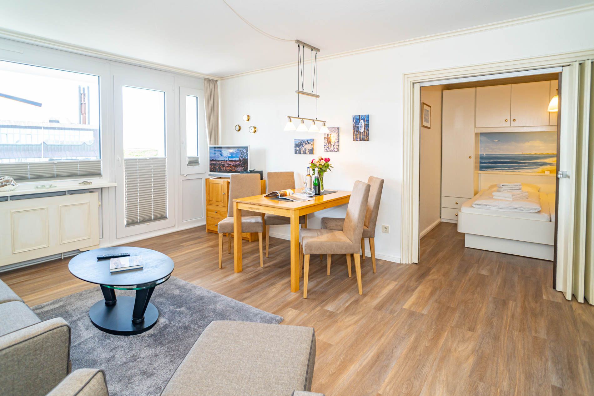Der Wohnraum besteht aus einer gemütlichen Sitzgarnitur (Zweisitzer und 2 Sessel), einem Essplatz, Flachbild-TV, DVD.