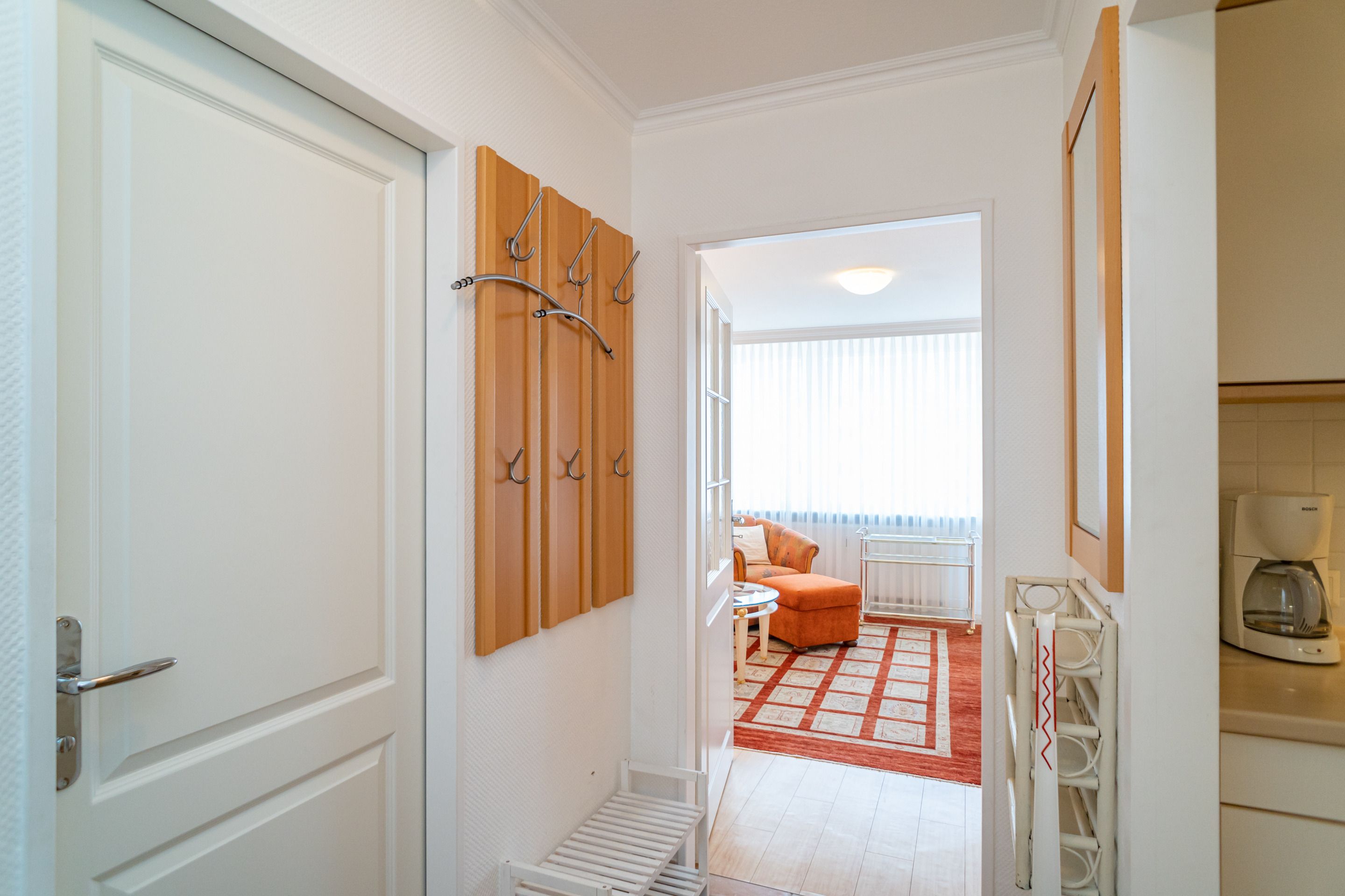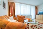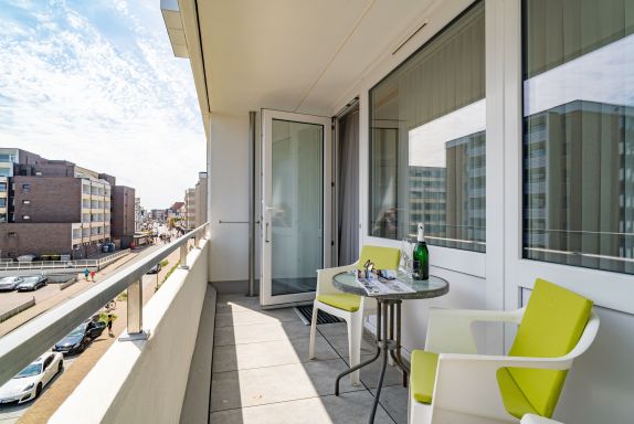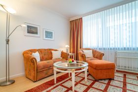 Großzügige, gut ausgestattete 1-Zimmer-Nichtraucher-Ferienwohnung (ca. 36 m²) in der 3. Etage zur Landseite mit Ostloggia (Morgensonne, mit Balkonmöbeln und Auflagen) für max. 2 Personen.