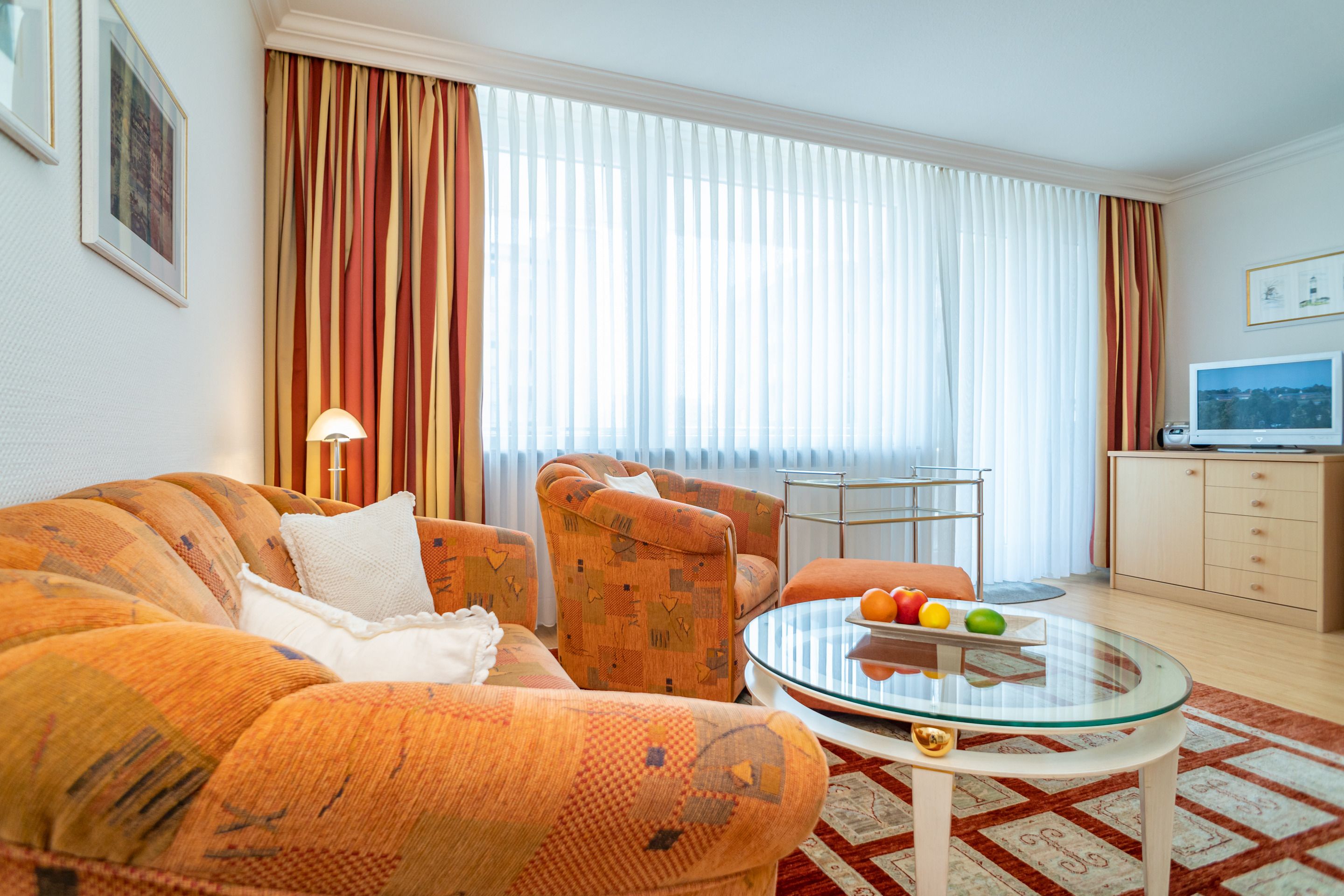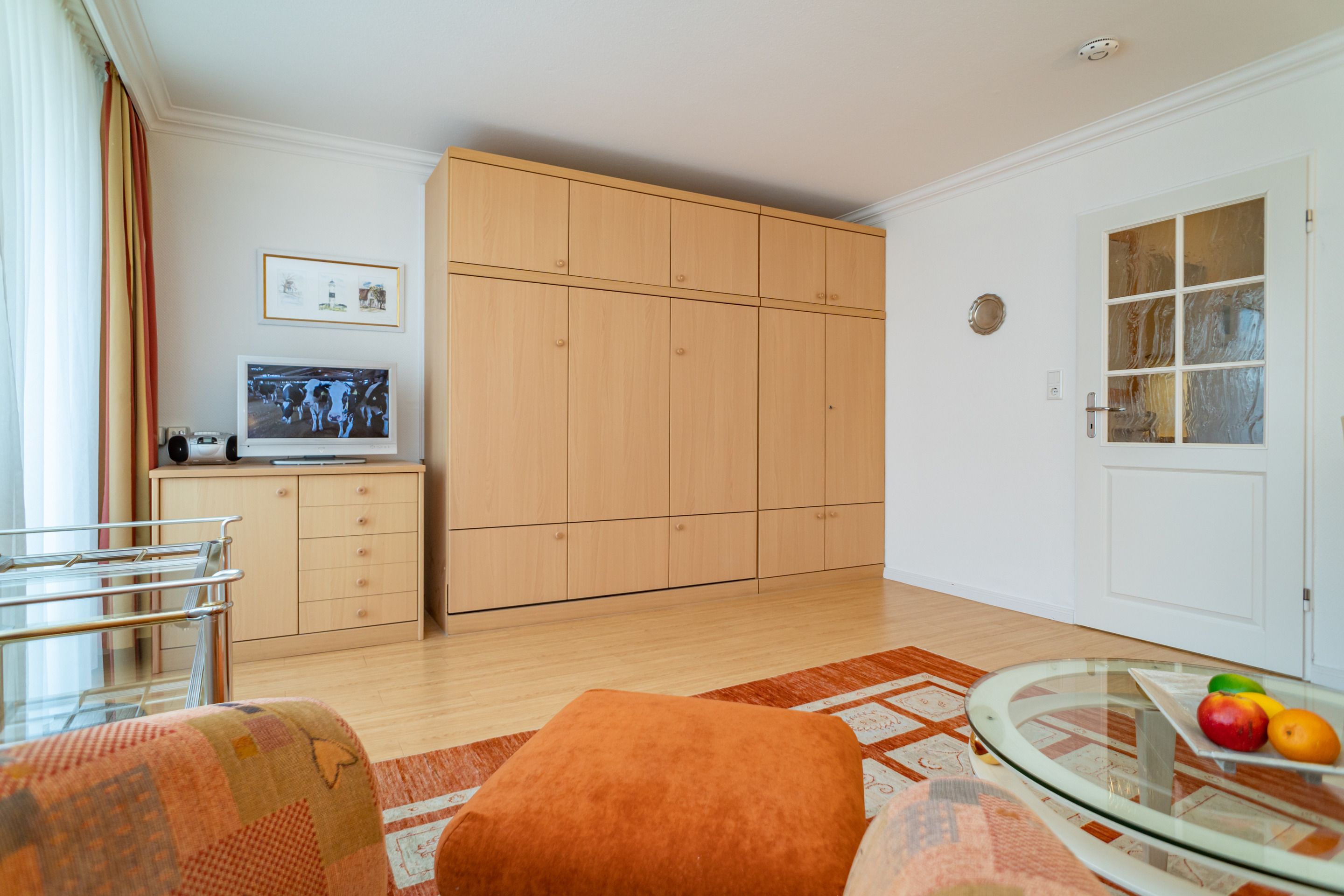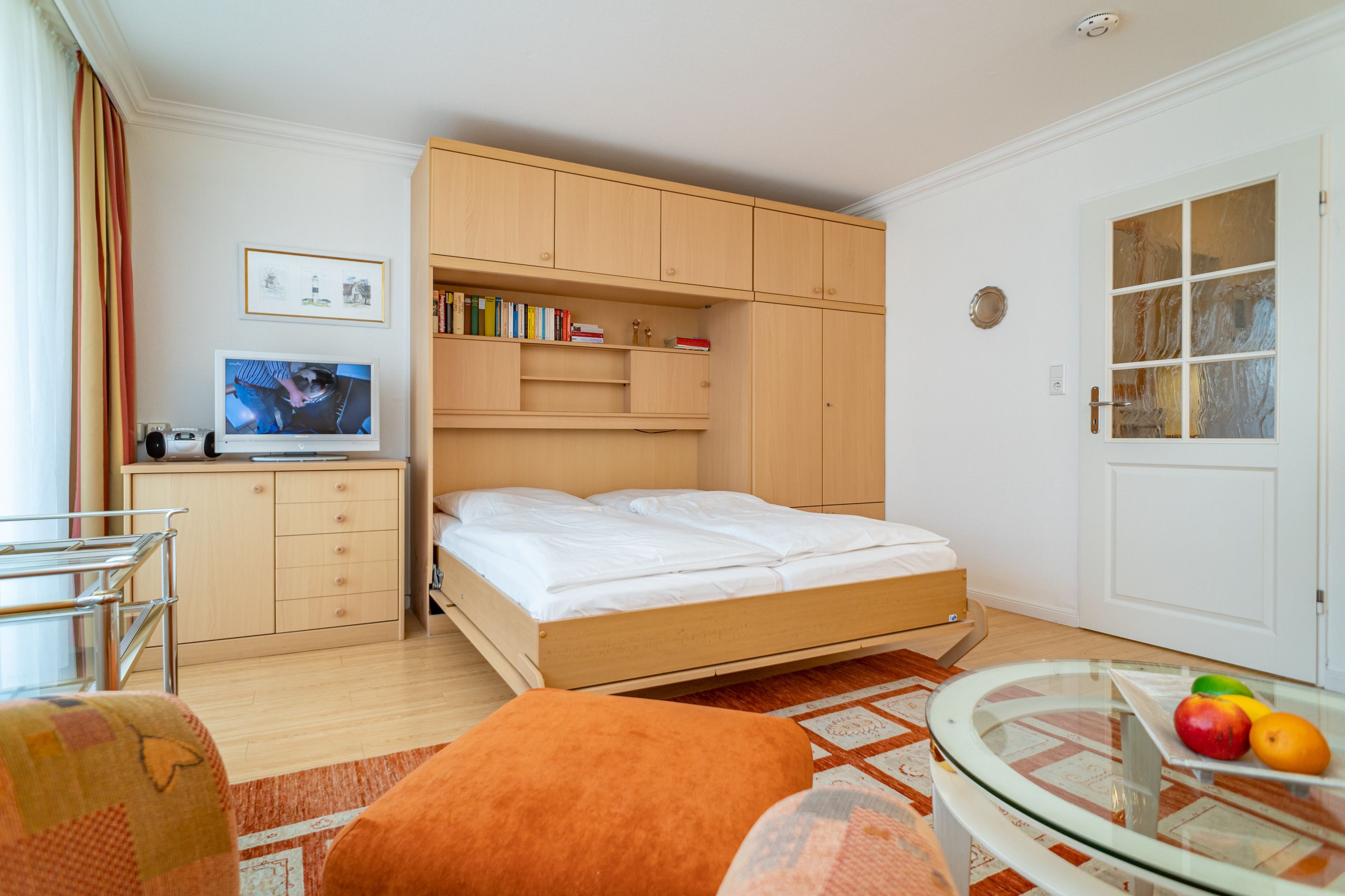 Der Wohn-/Schlafraum besteht aus einer gemütlichen Sitzgarnitur (Zweisitzer und Sessel), einem Essplatz, einem neuen Doppelschrankbetten (zusammen ausklappbar, 0,80 x 1,97 m), Kabel-Flachbild-TV mit digitalem Empfang, Radio, kostenlose Internetnutzung per W-Lan.