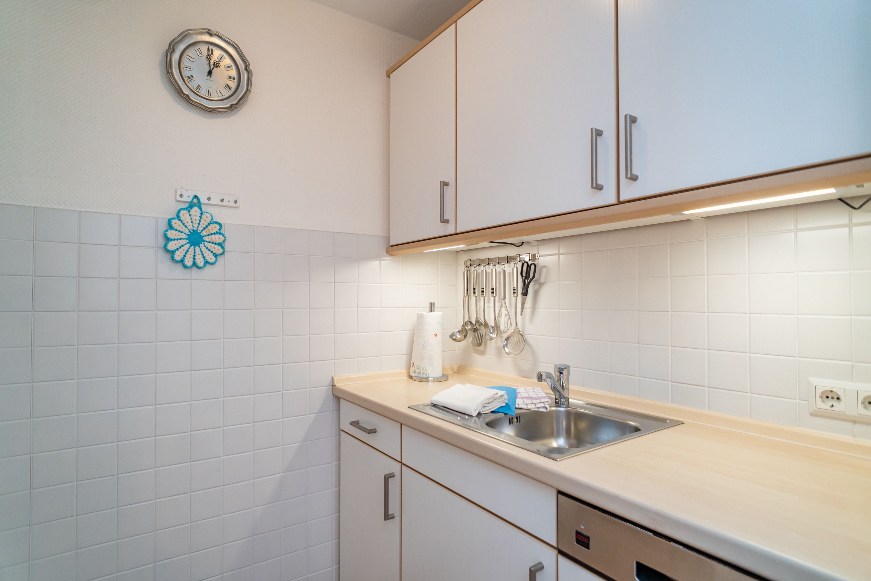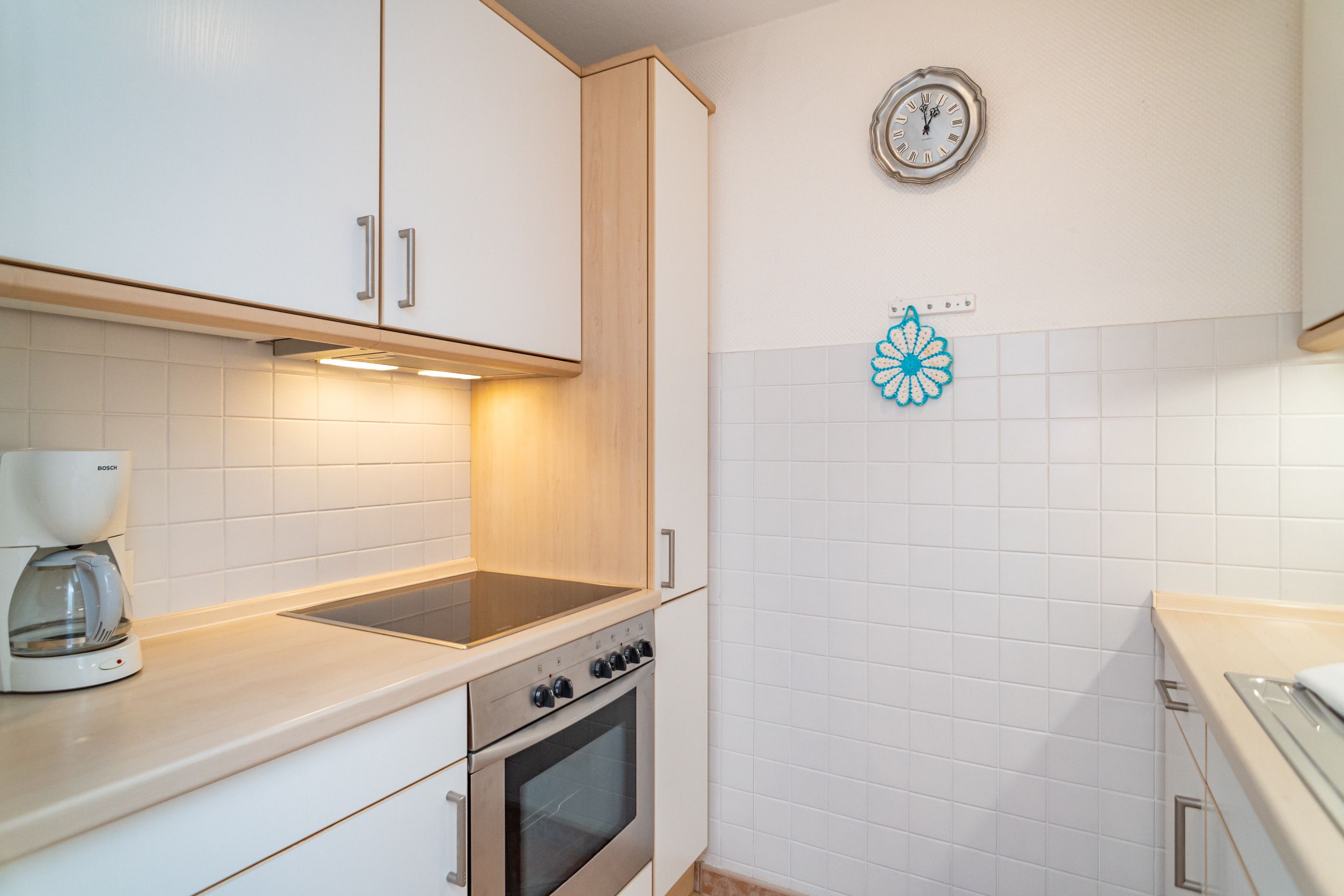 Die separate Küche hat einen Geschirrspüler, einen Herd mit Backofen und Cerankochfeld und einen Kühlschrank (3* Gefrierfach). Kaffeemaschine, Wasserkocher und Toaster gehören zur Grundausstattung.