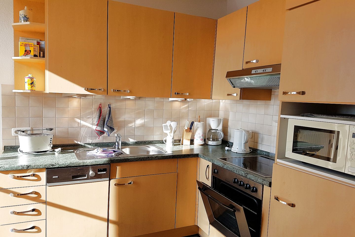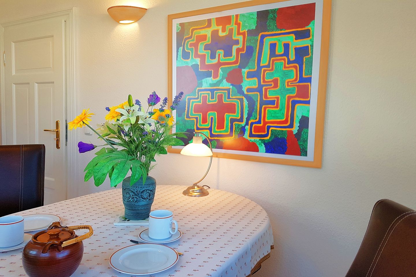 Die geräumige und helle 62 m² große Wohnung befindet sich im 1. OG des Hauses. Das Appartement ist geschmack- und liebevoll eingerichtet und verfügt über einen Wohnraum mit Schlafcouch, offener voll ausgestatteter Küchenzeile und Essplatz sowie eine Veranda, einen Schlafraum