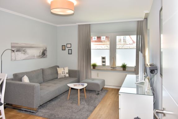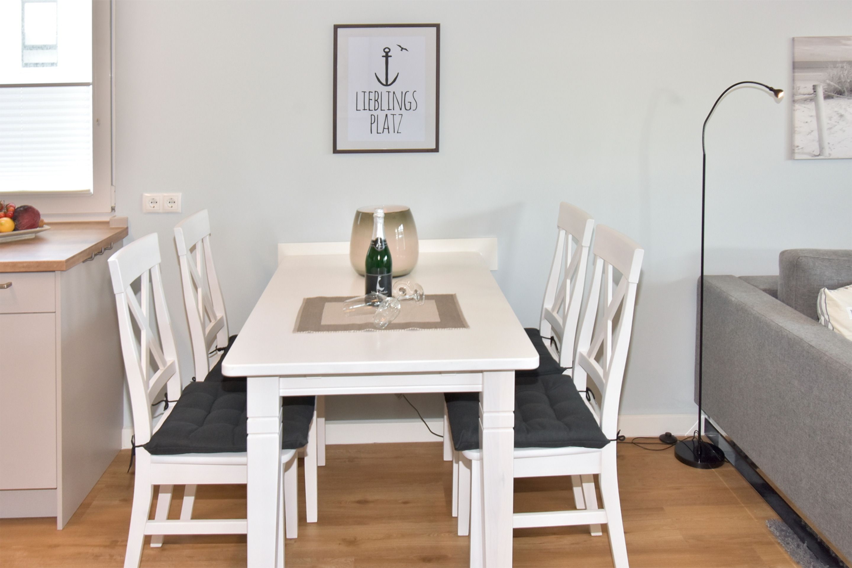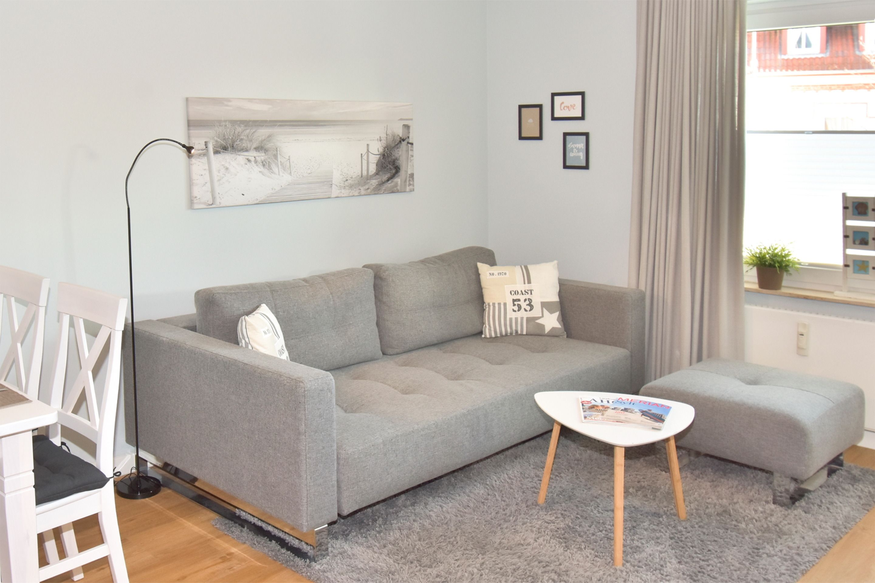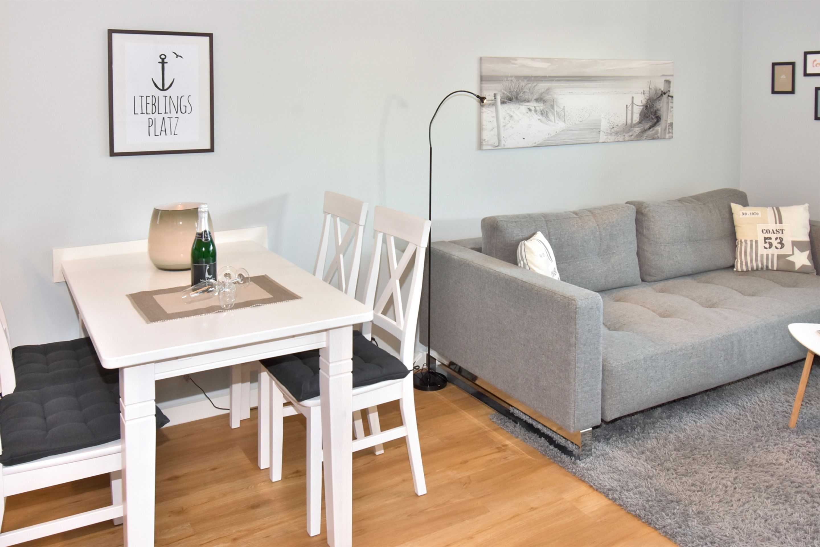 Der lichtdurchflutete Wohnbereich ist mit einem gemütlichen Sofa (mit Schlaffunktion, Liegefläche ca. 1,60 x 2,00 m), einem Hocker, einem separaten Essplatz, Flachbild-TV und CD-Radio-Anlage ausgestattet – perfekt zum Entspannen.