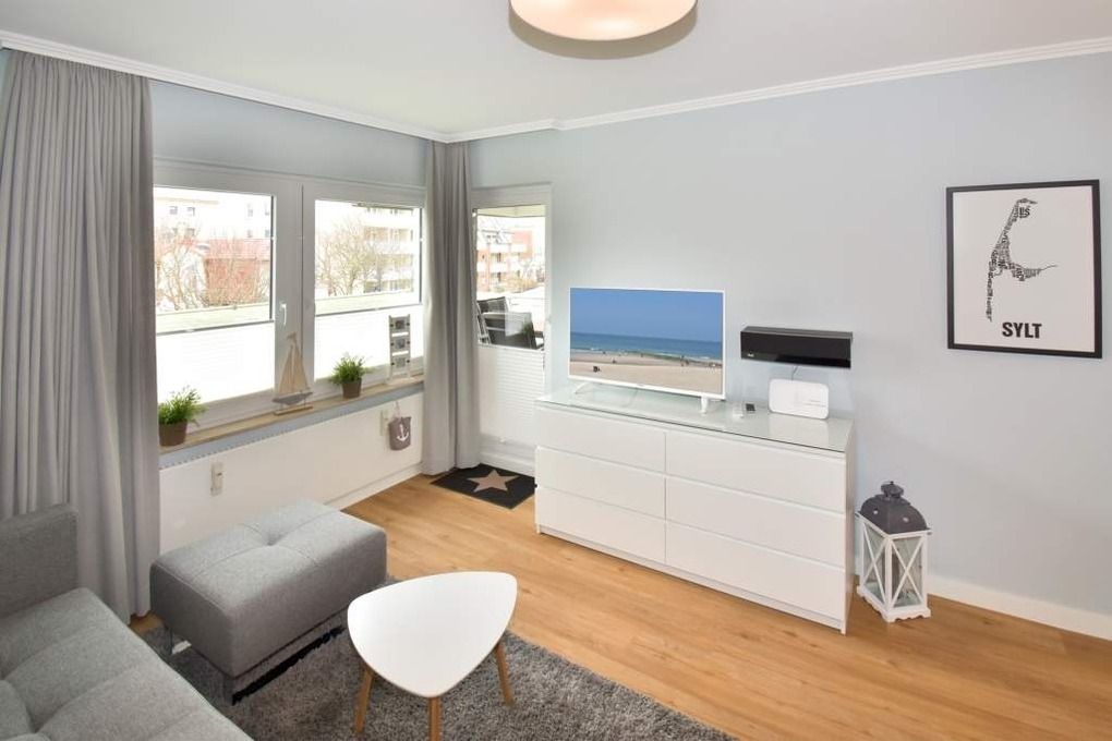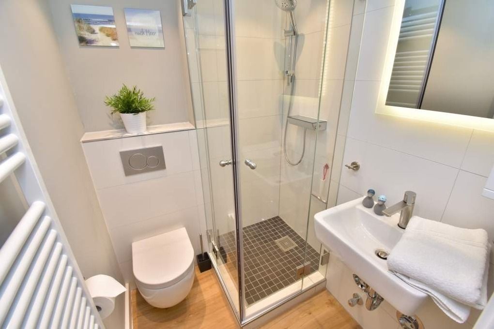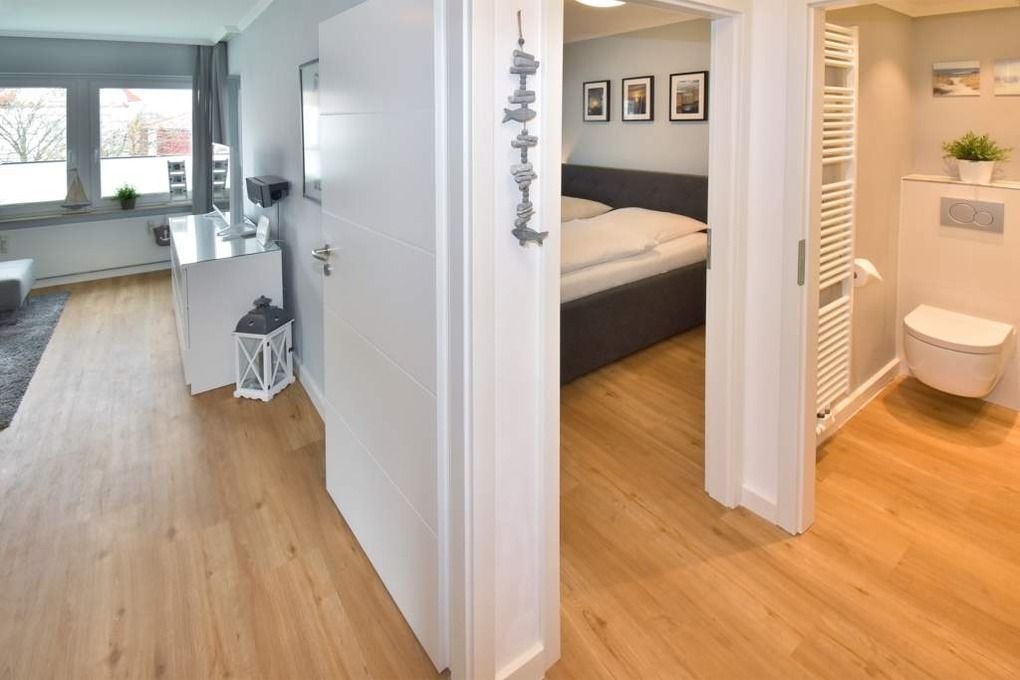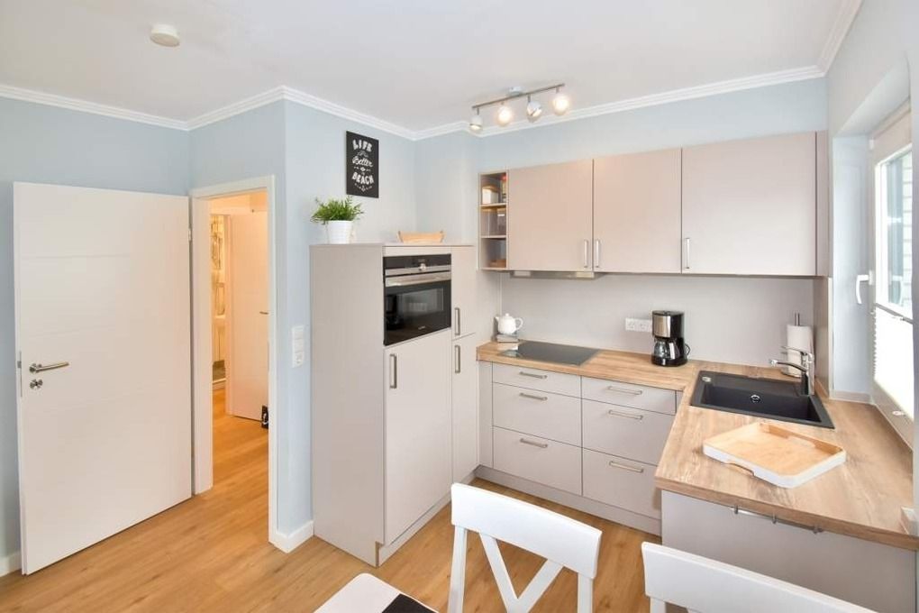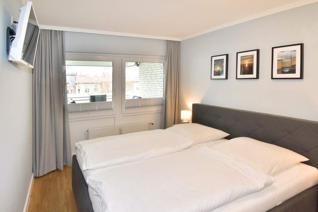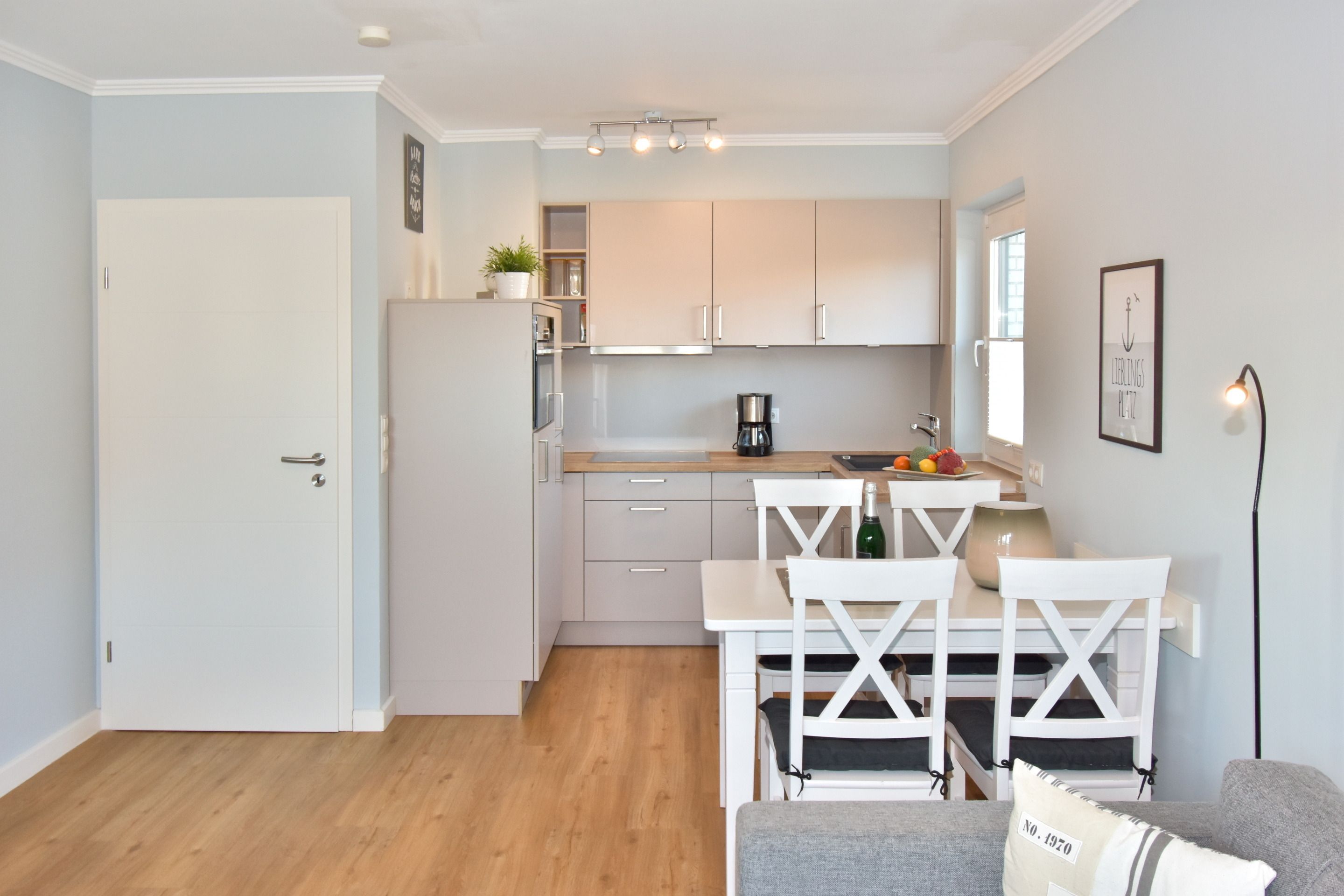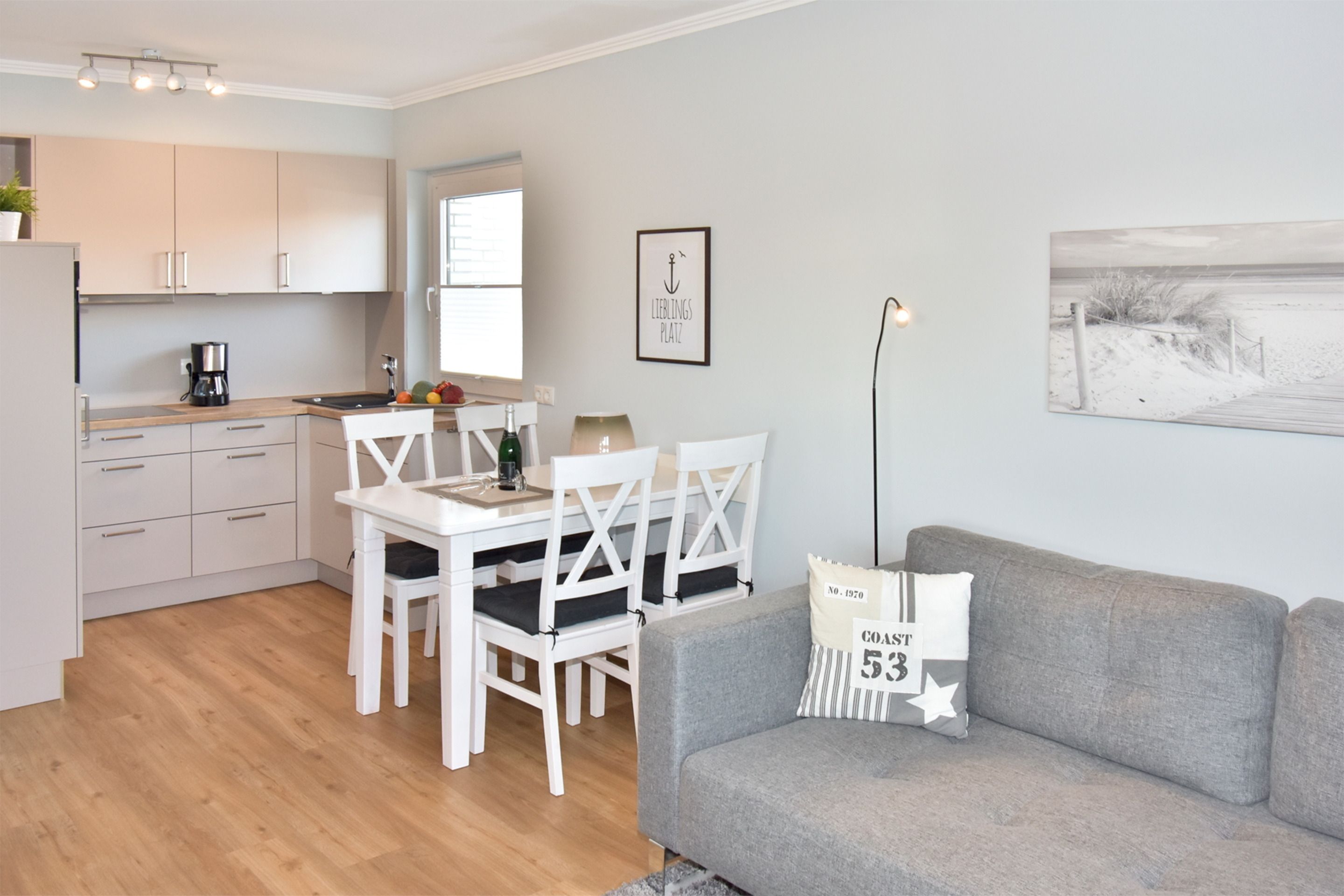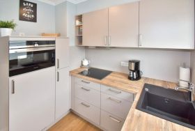Im Schlafzimmer erwartet Sie ein schickes Doppelbett (1,80 x 2,00 m, mit zwei Einzelmatratzen) sowie ein zusätzlicher Flachbild-TV. Die offen gestaltete, moderne Küche lässt keine Wünsche offen: Cerankochfeld (4 Kochzonen), Geschirrspüler, Mikrowellen-Backofen-Kombigerät, Kühlschrank mit Gefrierfach, Milchaufschäumer, Kapselmaschine, Kaffeemaschine, Wasserkocher und Toaster gehören zur umfangreichen Ausstattung. Das hochwertig ausgestattete Bad verfügt über eine Dusche mit extraflachem Einstieg, Waschtisch, Handtuchtrockner, Fön und WC – durchdacht und stilvoll gestaltet.
