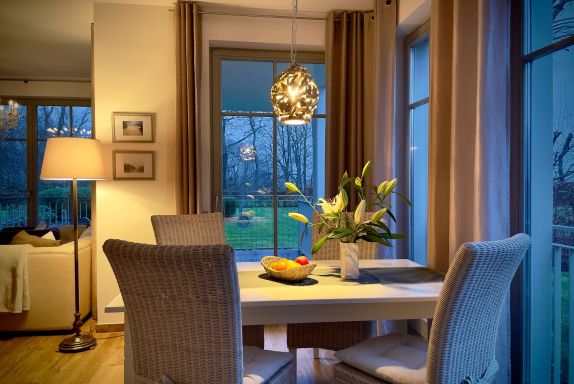 Die exklusive Ausstattung der FeWo Strand-Idyll mit eigener Sauna, Badewanne, großen Wellness- und Regenduschen, W-LAN mit Smart-TV's und vielen anderen Ausstattungsmerkmalen eignet sich auf Grund der zwei Schlafzimmer mit je einem separaten Bad besonders für Familien (auch mit großem Kind und Schwiegerkind), zwei befreundeten Pärchen (2 Parkplätze vorhanden) oder Familien mit Personen, die es vom Auto bis in die Wohnung bequem haben wollen (ebenerdig/ breite Türen). Sie können zwei Terrassen nutzen. Auf Grund der Fußbodenheizung, der Sauna, dem Kamin und der freistehenden Badewanne eignet sich diese Wohnung auch für einen entspannten Urlaub in der Neben- oder Wintersaison. Die Wohnung liegt auf der ruhigen Seite einer Ostseearchitektur-Villa mit Blick auf den Küstenwald. Das Rauschen der Ostseewellen und das Singen der Vögel wird Sie entspannen…
