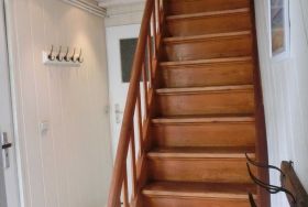 Fliesen und Holzfußboden (teilweise alt), die Treppe zum Obergeschoss ist steiler als üblich.