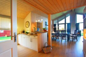 Der helle Wohn- und Essbereich des barrierefreien Hauses ist mit einer offener Küche und einem Kaminofen ausgestattet. Die 4 Schlafzimmer des Hauses laden mit behaglichen Doppelbetten zu erholsamem Schlafen und Träumen ein. Der Hems (Schlafboden) ist mit seinen beiden Schlafmatratzen eine weitere Trauminsel für eine 9. und 10. Person.