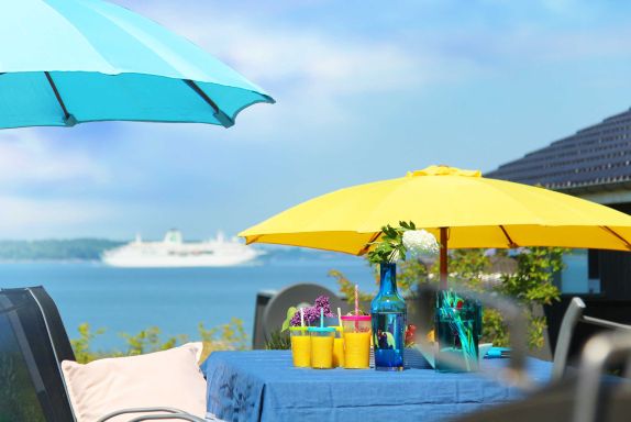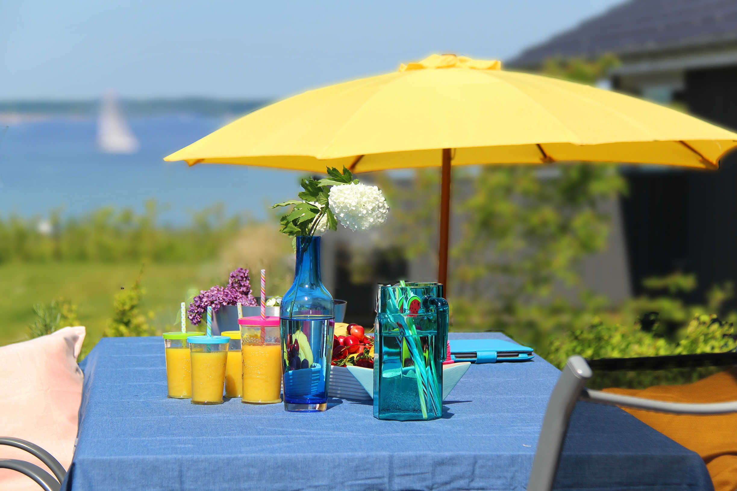 Auf der großen, teilweise überdachten Terrasse lässt es sich mit Meerblick herrlich entspannen, sonnenbaden und grillen.
