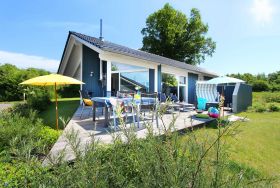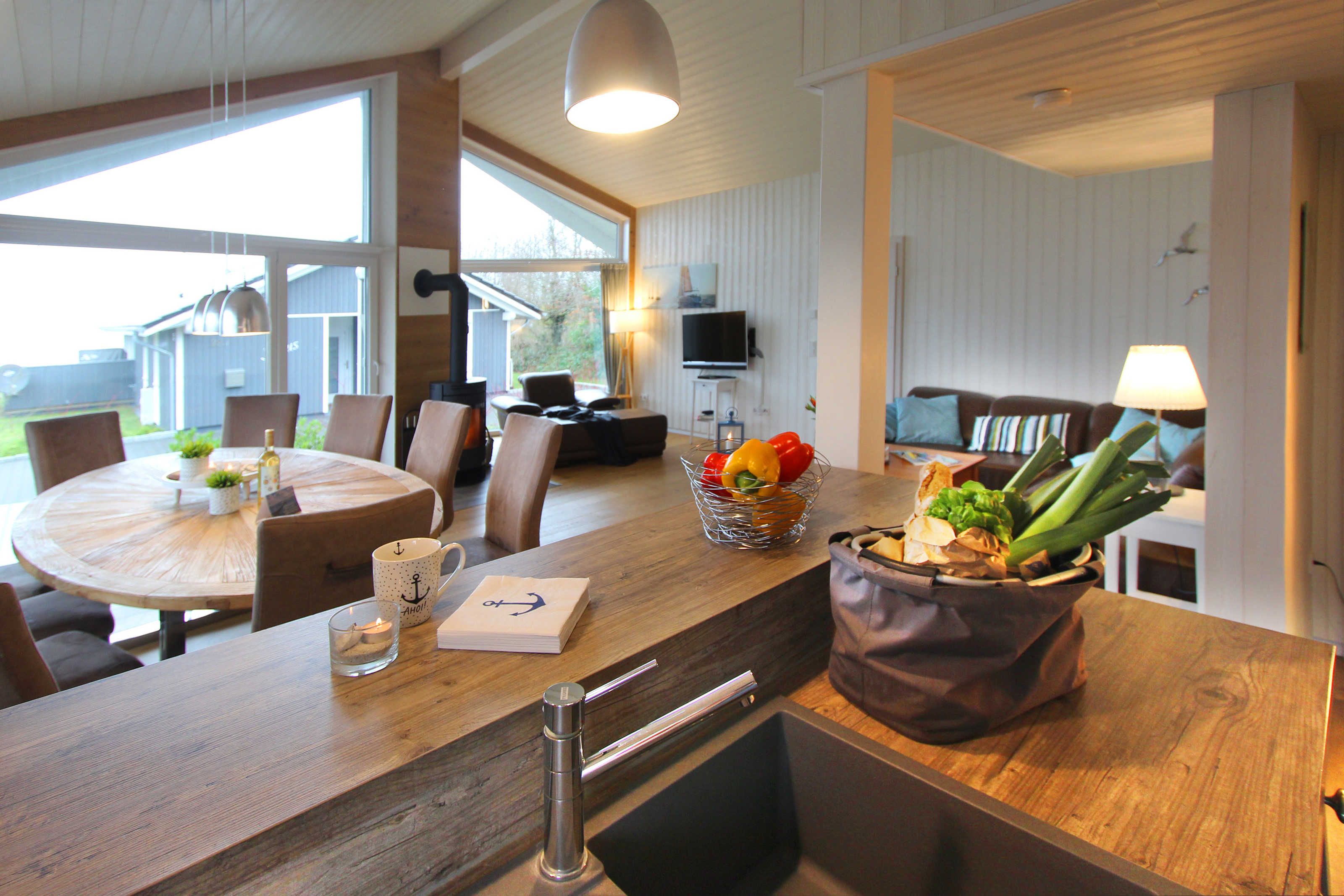 Der helle Wohn- und Essbereich des barrierefreien Hauses ist mit einer offener Küche und einem Kaminofen ausgestattet. Die 4 Schlafzimmer des Hauses laden mit behaglichen Doppelbetten zu erholsamem Schlafen und Träumen ein. Der Hems (Schlafboden) ist mit seinen beiden Schlafmatratzen eine weitere Trauminsel für eine 9. und 10. Person.