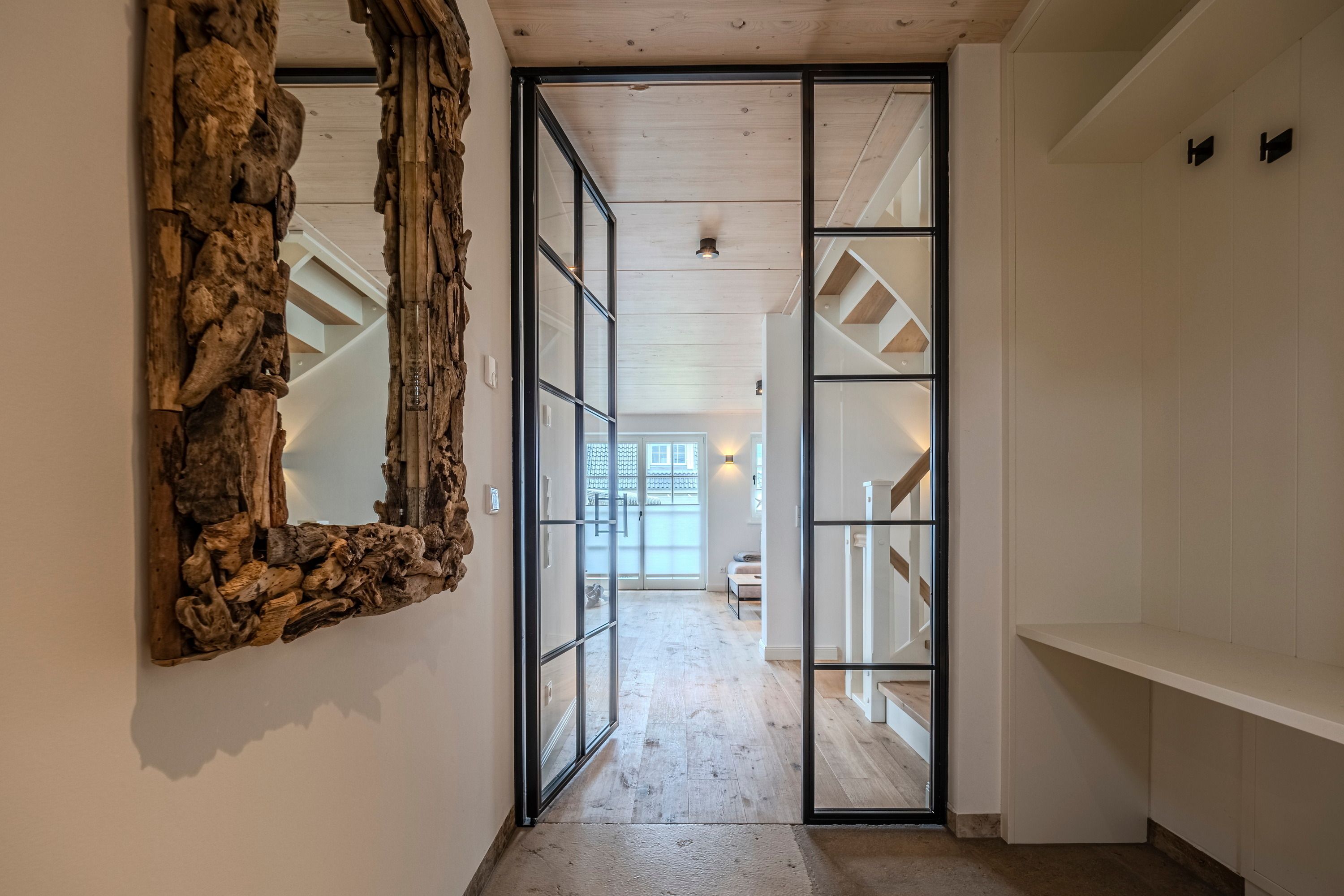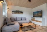 So fallen gleich zu Anbeginn die großflächigen, bodentiefen, isolierverglasten Fenster im Wohn- und Esszimmerbereich auf. Sie sorgen zum einem für eine optimale Lichtdurchflutung und Wärmedämmung, während sie zum anderem einen herrlichen Blick auf den in südlicher Ausrichtung gepflegten Garten und die umgebende Natur bieten. Dabei lädt der Gartenbereich mit seiner Süd-Terrasse nicht nur zum Entspannen ein, sondern ermöglicht es auch, dass sanfte Rauschen der Wellen in der Ferne zu vernehmen, was eine besonders beruhigende Atmosphäre bietet.