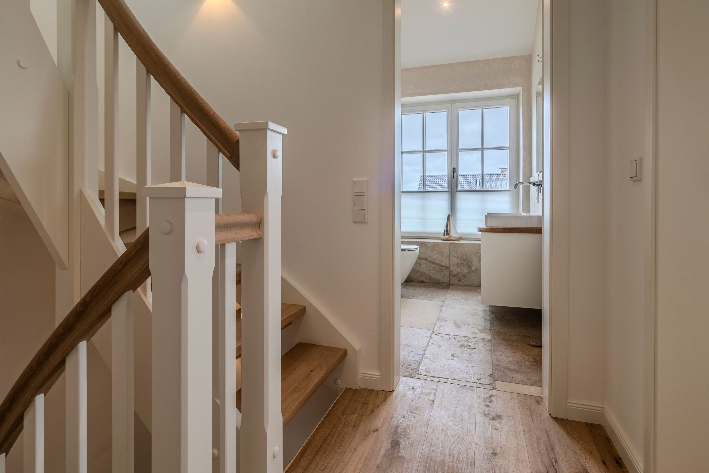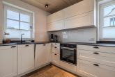Die moderne Küche im Erdgeschoss fügt sich sehr gut in das insgesamt offene Wohnkonzept dieses Hauses ein. Der gesamte Wohn- und Esszimmerbereich liegt in praktischer Nähe zur Küche und fokussiert zugleich den Lebensmittelpunkt des Hauses. Neben der Garderobe im Eingangsbereich befindet sich auf gleicher Ebene auch ein modernes Gäste-WC. Eine moderner Treppenaufgang führt aus dem offenen Wohn- und Esszimmer ins geräumige Obergeschoss.