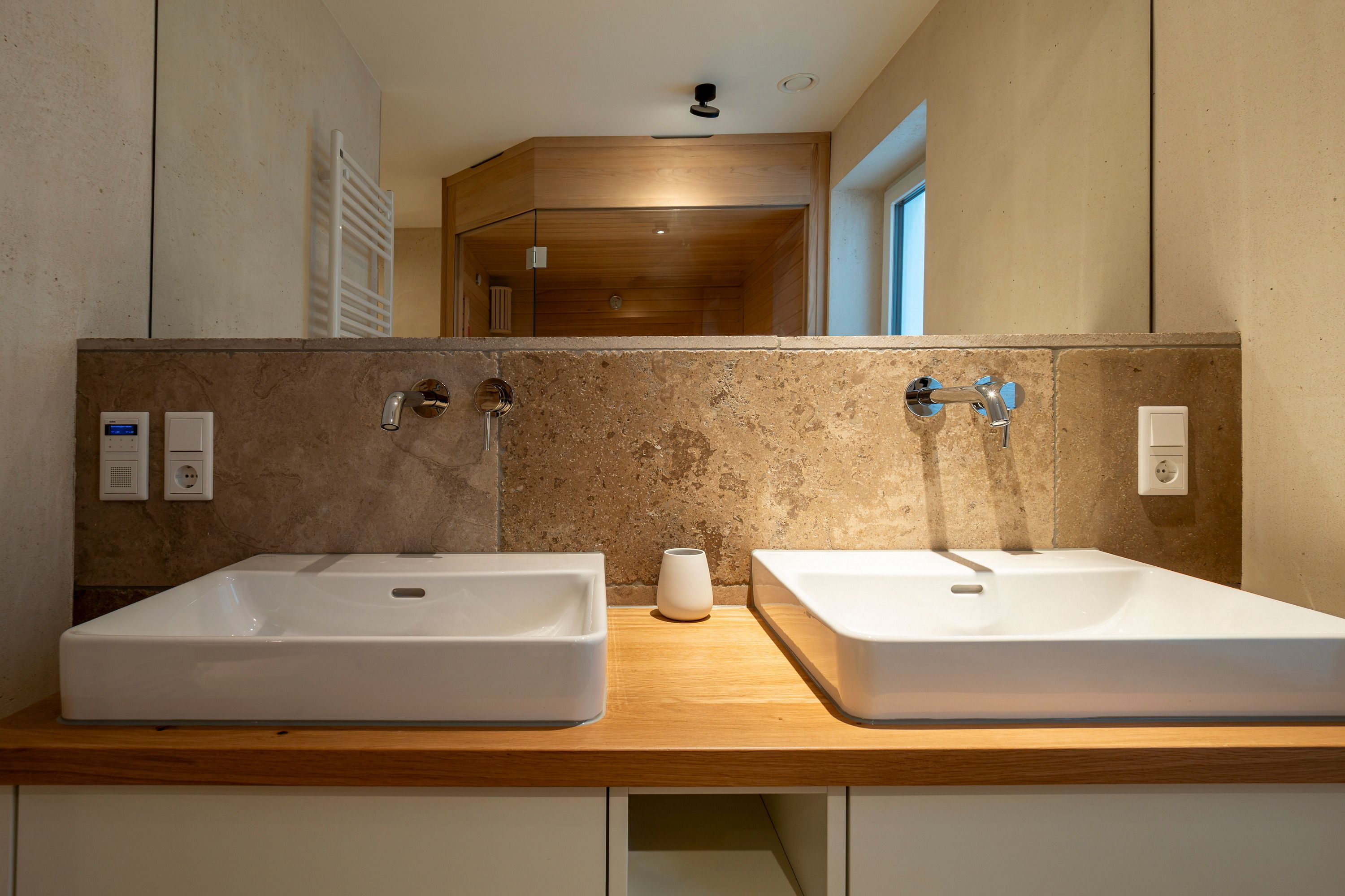 Im Untergeschoss befindet sich das 3. Schlafzimmer sowie die Wellnessoase, die vom Eingangsbereich aus bequem über eine Treppe zu erreichen ist.