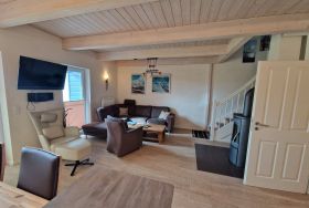 Der lichtdurchflutete Wohn- und Essbereich verfügt über eine moderne, komplett ausgestattete Küche und einen gemütlichen Kaminofen. Im Obergeschoss befindet sich das Wellness-Highlight des Hauses: eine großzügige Sauna und eine XXL-Badewanne für zwei Personen. Zwei weitere Schlafzimmer sorgen für viel Platz und Komfort.