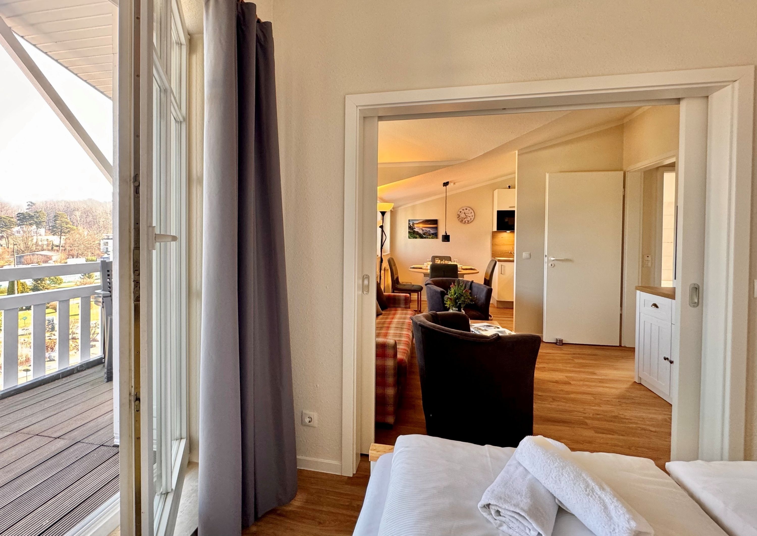 Genießen Sie die frische Ostseeluft auf dem Balkon mit nordöstlicher Ausrichtung. Die gemütliche Sitzgruppe und der Strandkorb laden zum Verweilen ein und bieten Ihnen einen herrlichen Blick auf die Umgebung.