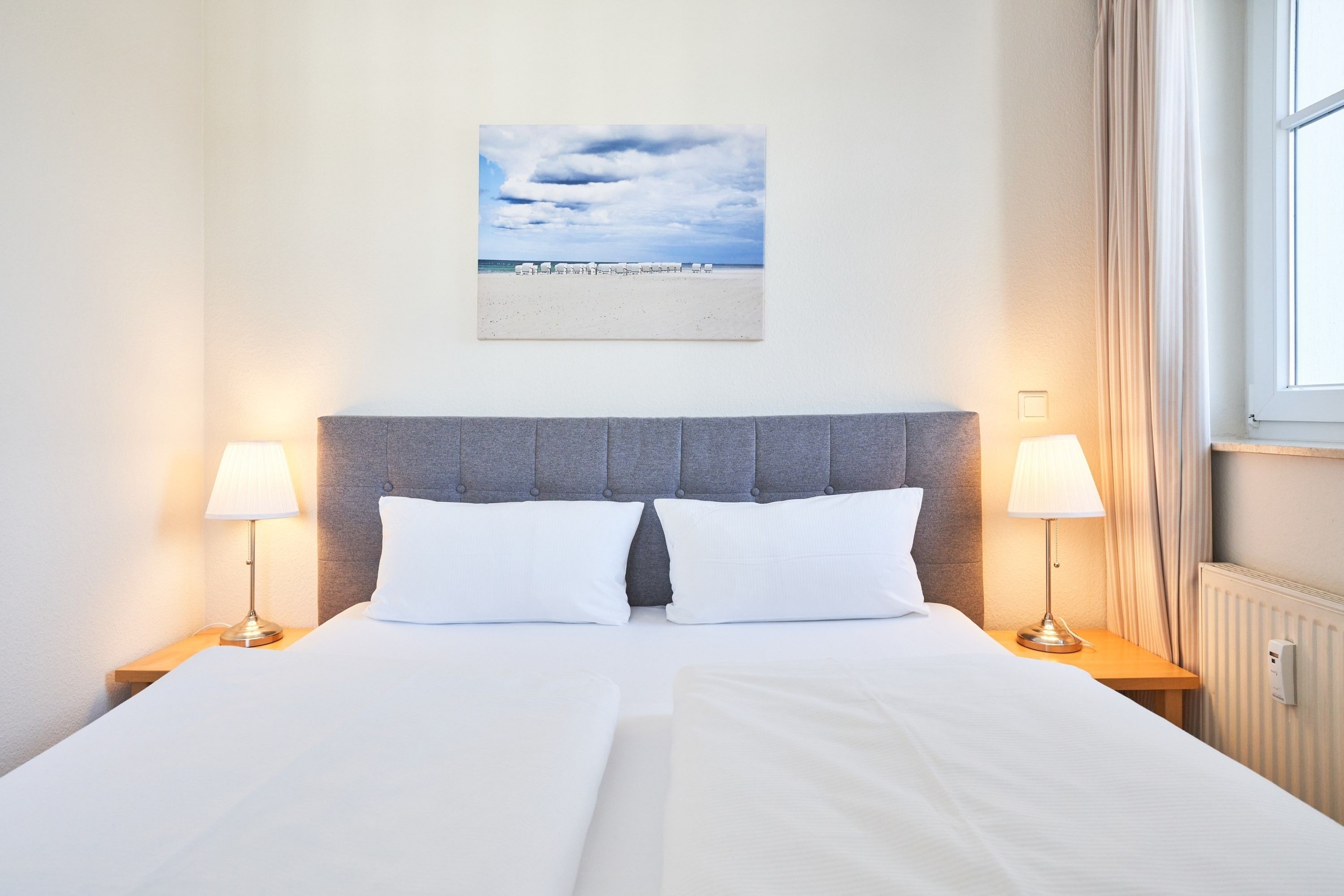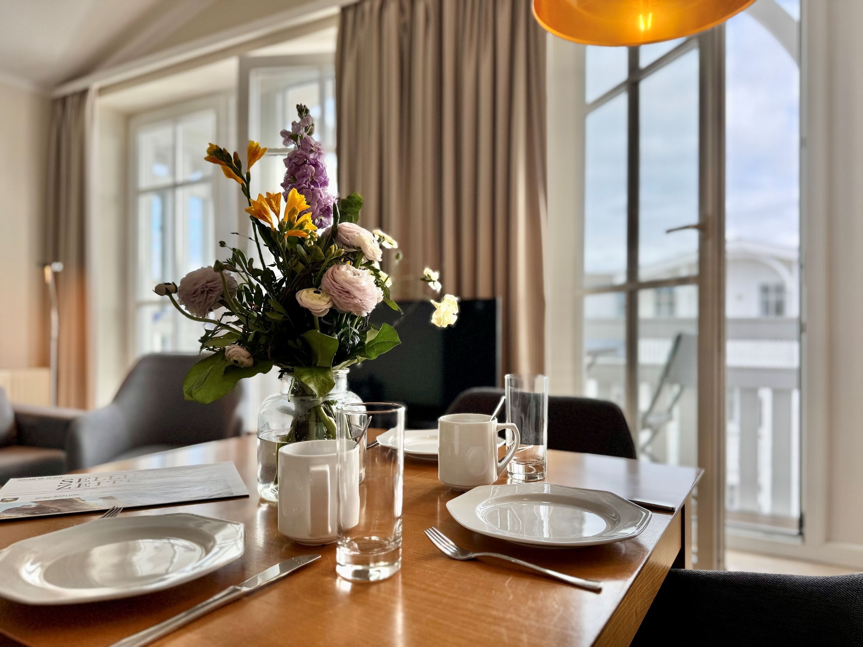 Die Ausstattung umfasst einen Flachbildfernseher, eine Kaffeemaschine mit Filter, eine Mikrowelle sowie ein Backofen und Bettwäsche, die bereits im Preis inkludiert ist. Ein Balkon lädt zum Entspannen ein und die offene Wohnküche bietet genügend Platz zum gemeinsamen Kochen. Für die Unterbringung von Fahrrädern steht ein Fahrradkeller zur Verfügung. Außerdem gibt es einen WLAN-Anschluss und ein Fernseher mit Sky-Sendern. Für den morgendlichen Brötchenservice ist ebenfalls gesorgt. Hierfür bitten wir Sie sich an der Rezeption anzumelden und die Bestellung zu veranlassen.