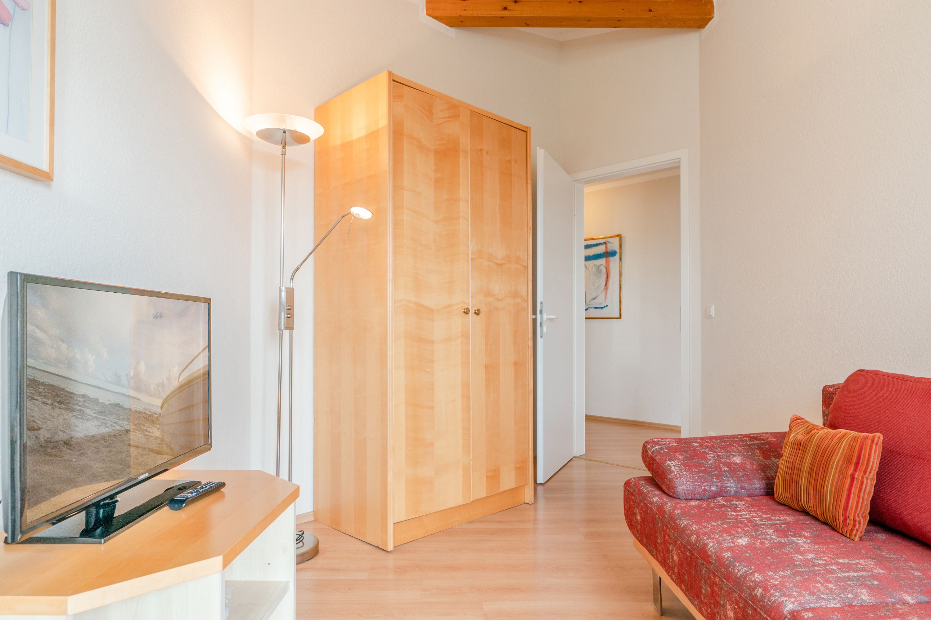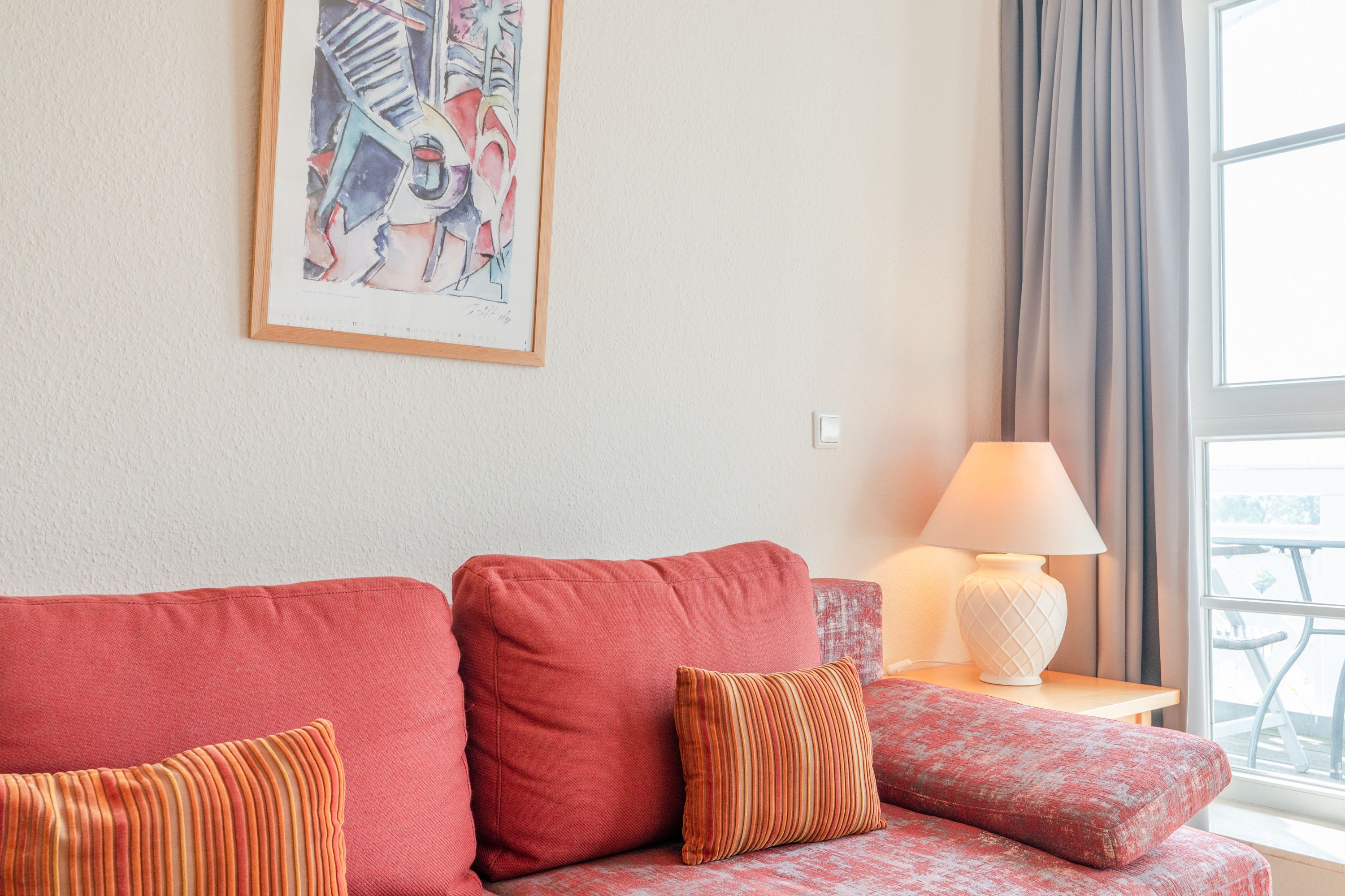 Zur Ausstattung der Ferienwohnung gehören kostenloses WLAN und eine Erstausstattung an Bettwäsche. Das Schlafzimmer verfügt über Verdunklungsvorhänge und ein Doppelbett, im Wohnzimmer steht zusätzlich eine Doppelschlafcouch zur Verfügung. Auch ein Bad mit Dusche und WC sowie eine voll ausgestattete offene Küche mit Mikrowelle, Kaffeemaschine und Toaster sind vorhanden. Ein Fernseher mit 3 Sky-Sendern rundet die Einrichtung ab. Auf dem Balkon in Südostlage können die Gäste den Ausblick und die Sitzgruppe genießen und sich entspannen. Die Wohnung ist Nichtraucher und Haustiere sind nicht erlaubt.