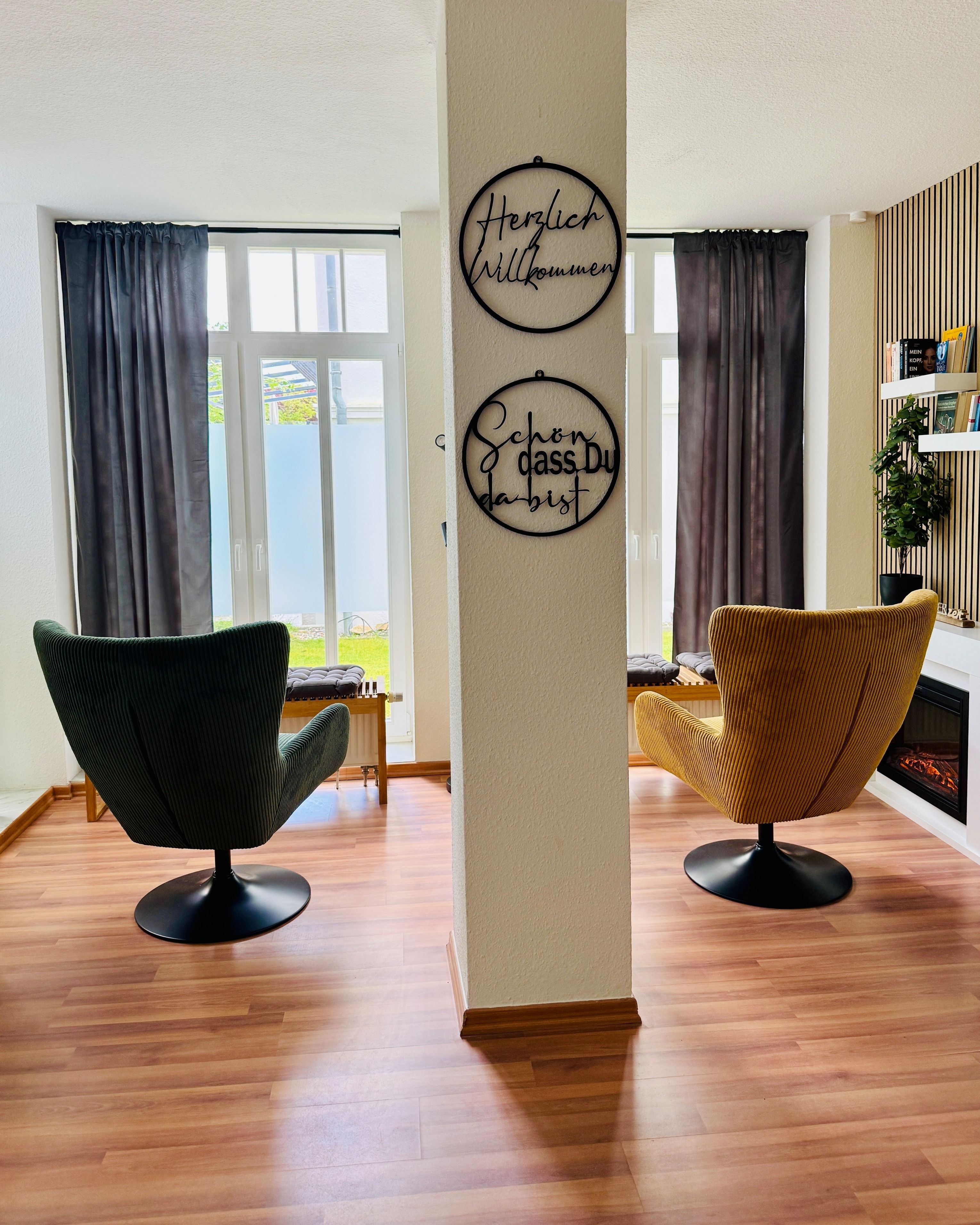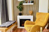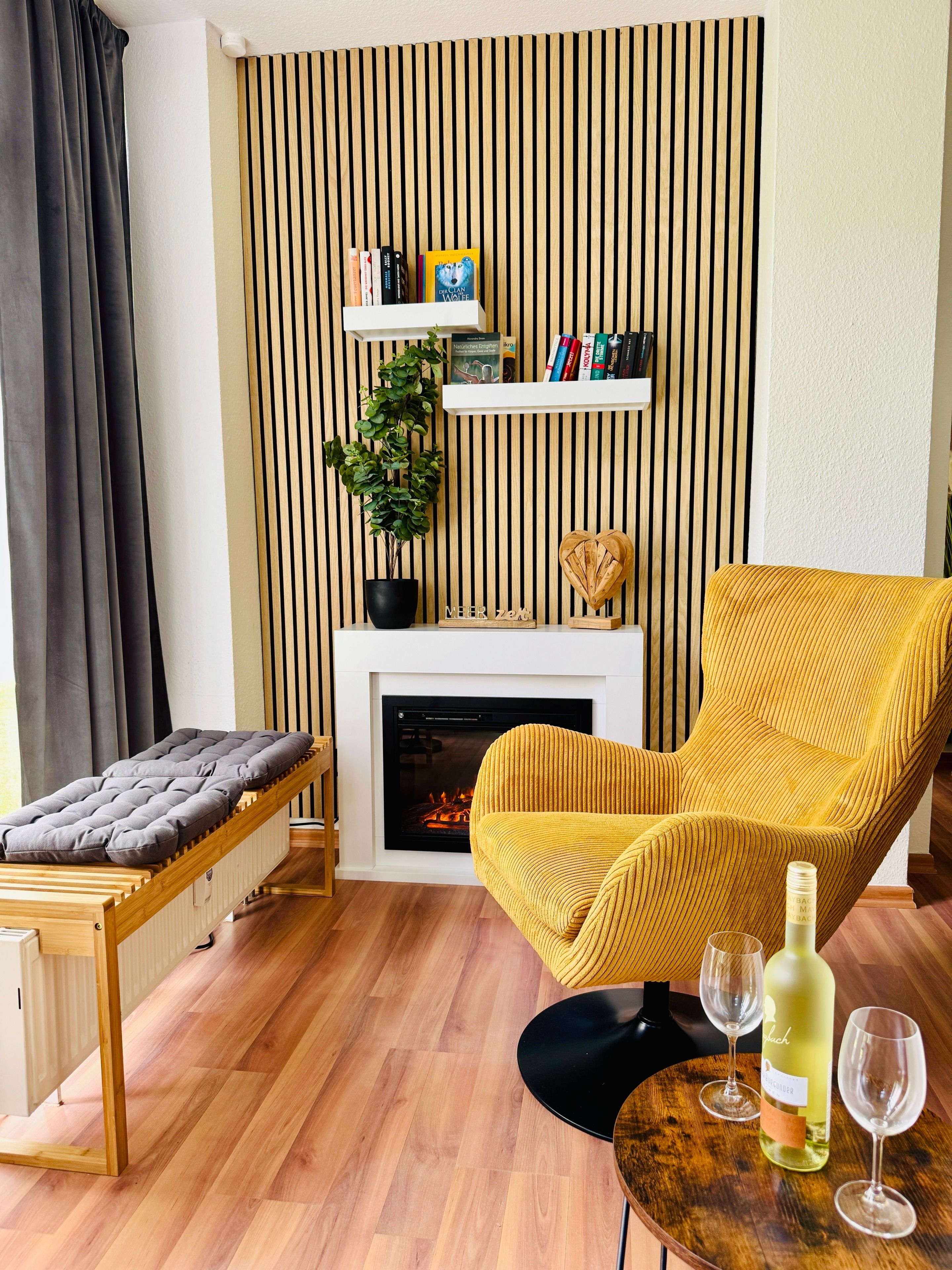 Gemütliche Sitzecke im Erker mit Elektrokamin, perfekt für entspannte Abende mit einem guten Buch oder Gespräche bei einem Glas Wein.