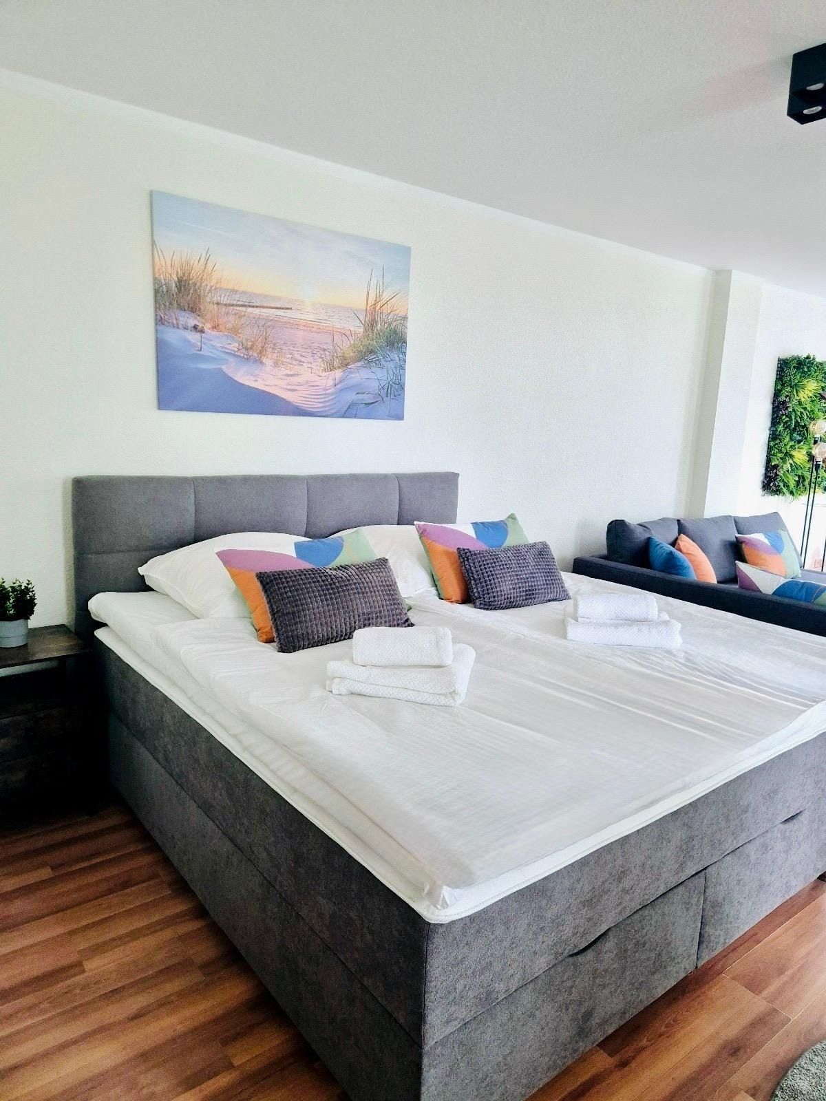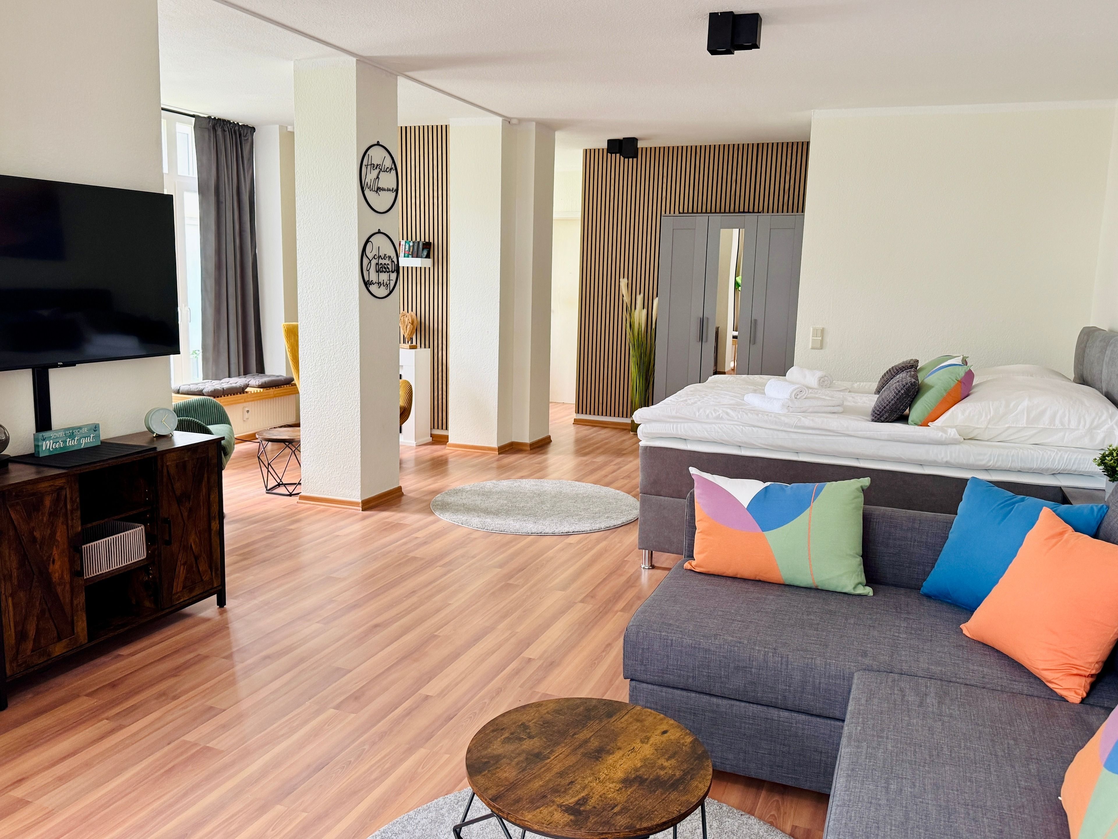 Für deinen maximalen Schlafkomfort verwenden wir hochwertige Hotelbettwäsche und Matratzen. Der Schlafbereich lässt sich durch einen Raumteiler vom Wohnbereich abtrennen.