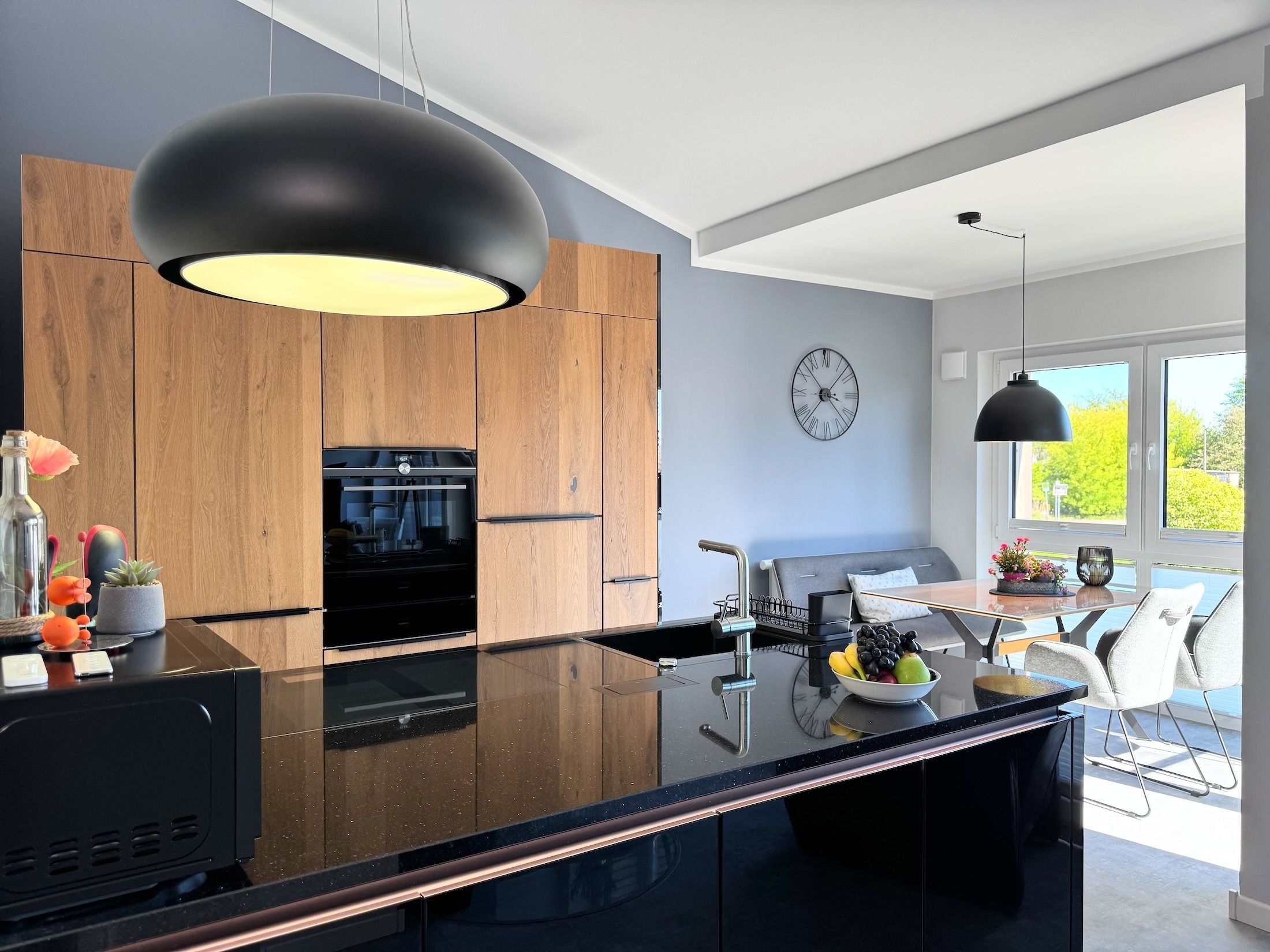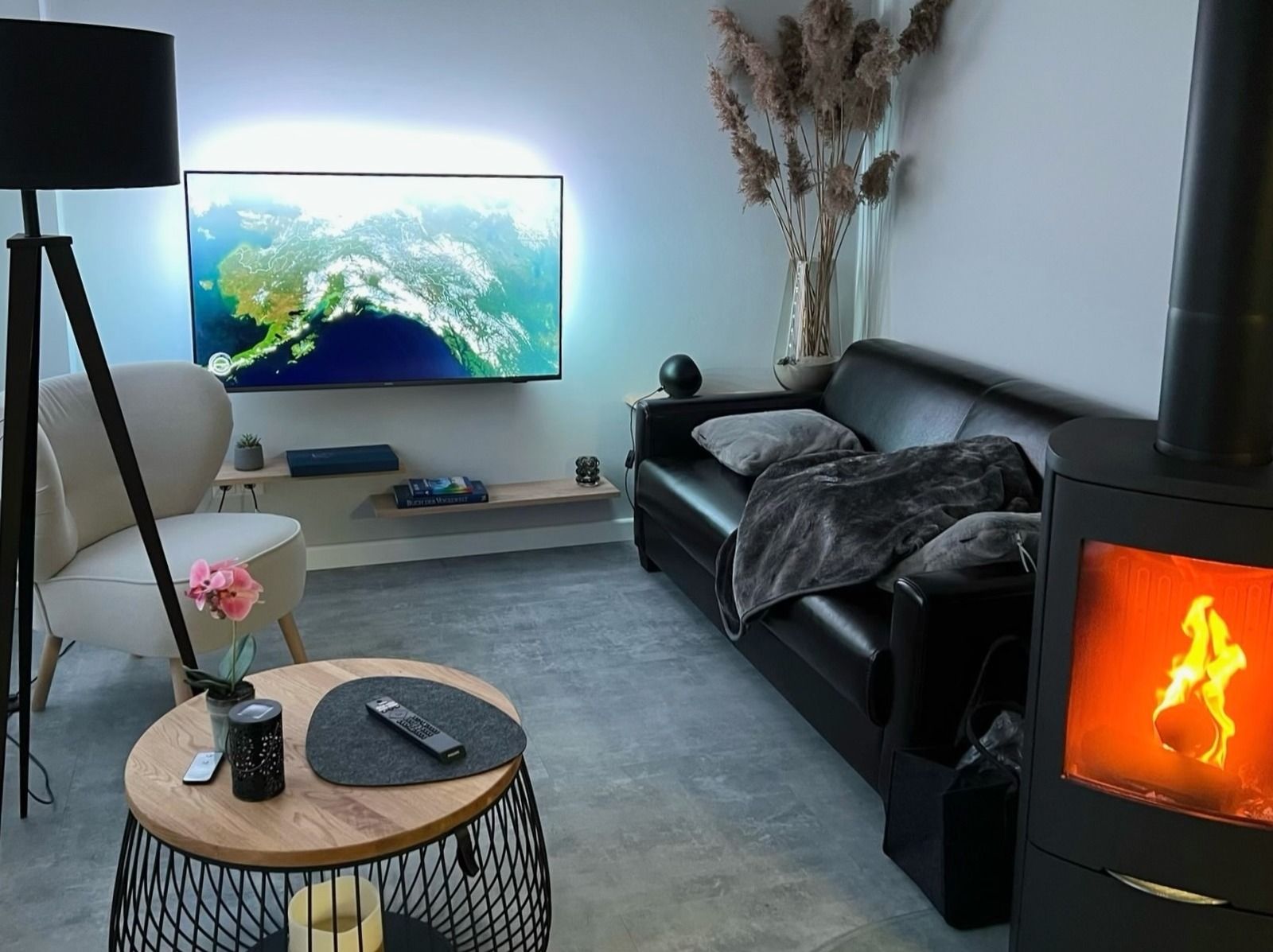 Willkommen in der modernen Ferienwohnung Koje Boddenbrise in Zingst-Müggenburg! Der lichtdurchflutete Wohn- und Essbereich mit bodentiefen Fenstern, Ledersofa, Smart-TV und gemütlichem Kamin lädt zum Entspannen ein. Highlight ist der große Südbalkon mit Blick ins Grüne– Kraniche und Wildgänse fliegen über den Balkon zur Vogelinsel Kirr!