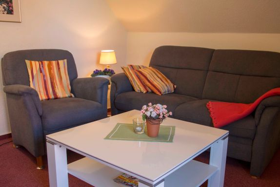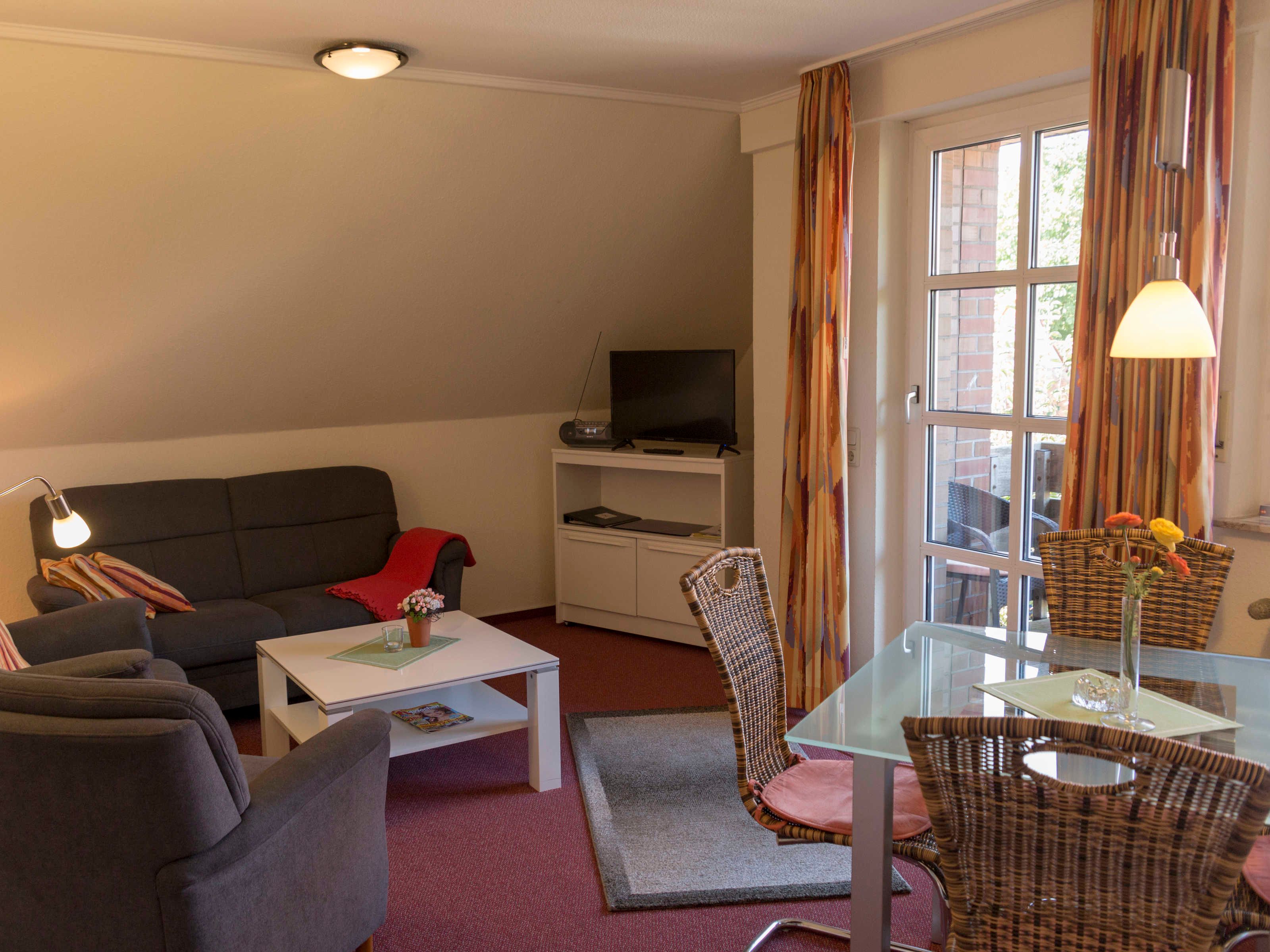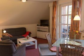 Vom überdachten Außensitzplatz (Loggia) genießen Sie die angenehme friesisch-salzhaltige Luft. Die Ferienwohnung verfügt über zwei Schlafzimmer mit insgesamt vier Schlafplätzen, einem Tageslichtbad mit Dusche und bereit liegendem Fön, einem gemütlichen Wohnraum, in dem eine Küchenzeile sowie ein Essplatz mit untergebracht sind. Kabel-TV auf modernen Flachbildfernsehern im Wohnzimmer und in einem Schlafzimmer sowie WLAN in der ganzen Wohnung gehören selbstverständlich mit zur Ausstattung. Die Küche verfügt über eine moderne Kochgelegenheit ohne Backofen, Kühlschrank mit Gefrierfach, Mikrowelle, Spül- und Kaffeemaschine sowie einem Pürierstab und einem Mixer. Ein CD- Radio-Player und eine Radiowecker sind ebenfalls vorhanden.