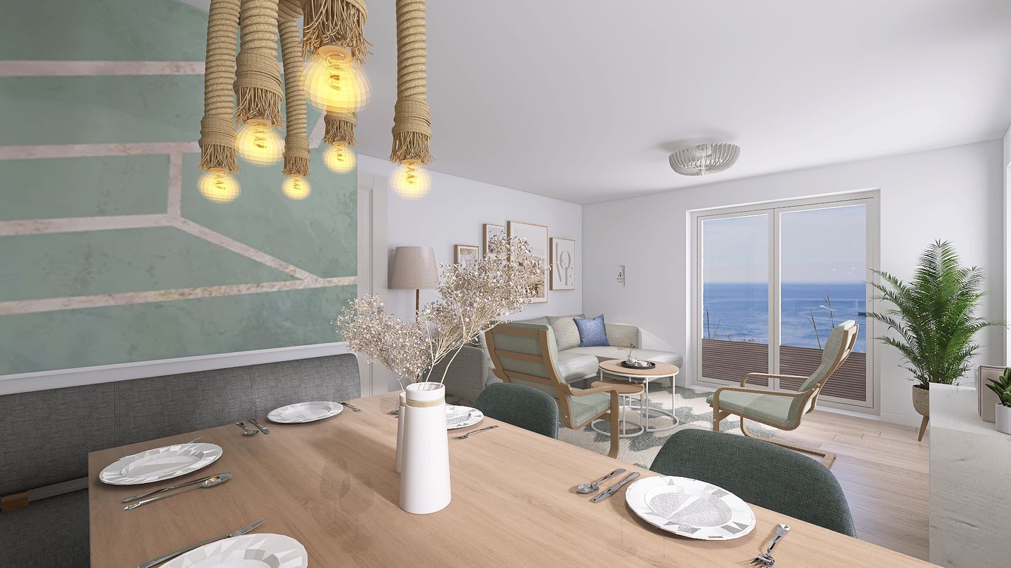 Der helle, offene Wohnbereich mit gemütlicher Sofalandschaft und einladender Essecke bildet das stilvolle Herzstück der Wohnung. Hier lässt sich ein erlebnisreicher Strandtag bei einem Glas Wein, einem guten Buch oder einem gemeinsamen Spieleabend entspannt ausklingen.