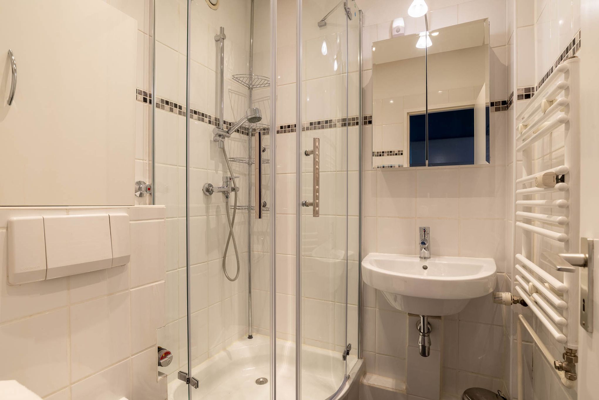 Das separate Badezimmer mit Eckdusche befindet sich in einem gepflegten und modernen Zustand.