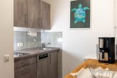 Im Eingangsbereich bietet ein Einbauschrank genügend Staumöglichkeiten für den Aufenthalt. Vom Flur aus gelangen Sie direkt in die Küche. Die offene Einbauküche besticht mit ihrer guten Ausstattung: Ein Geschirrspüler, ein Kühlschrank, sowie ein Induktionskochfeld mit zwei Kochfeldern findet sich in der modernen Küchenzeile. Auch eine Kaffeemaschine, einen Toaster, einen Wasserkocher und eine Mikrowelle finden Sie hier in der Grundausstattung.