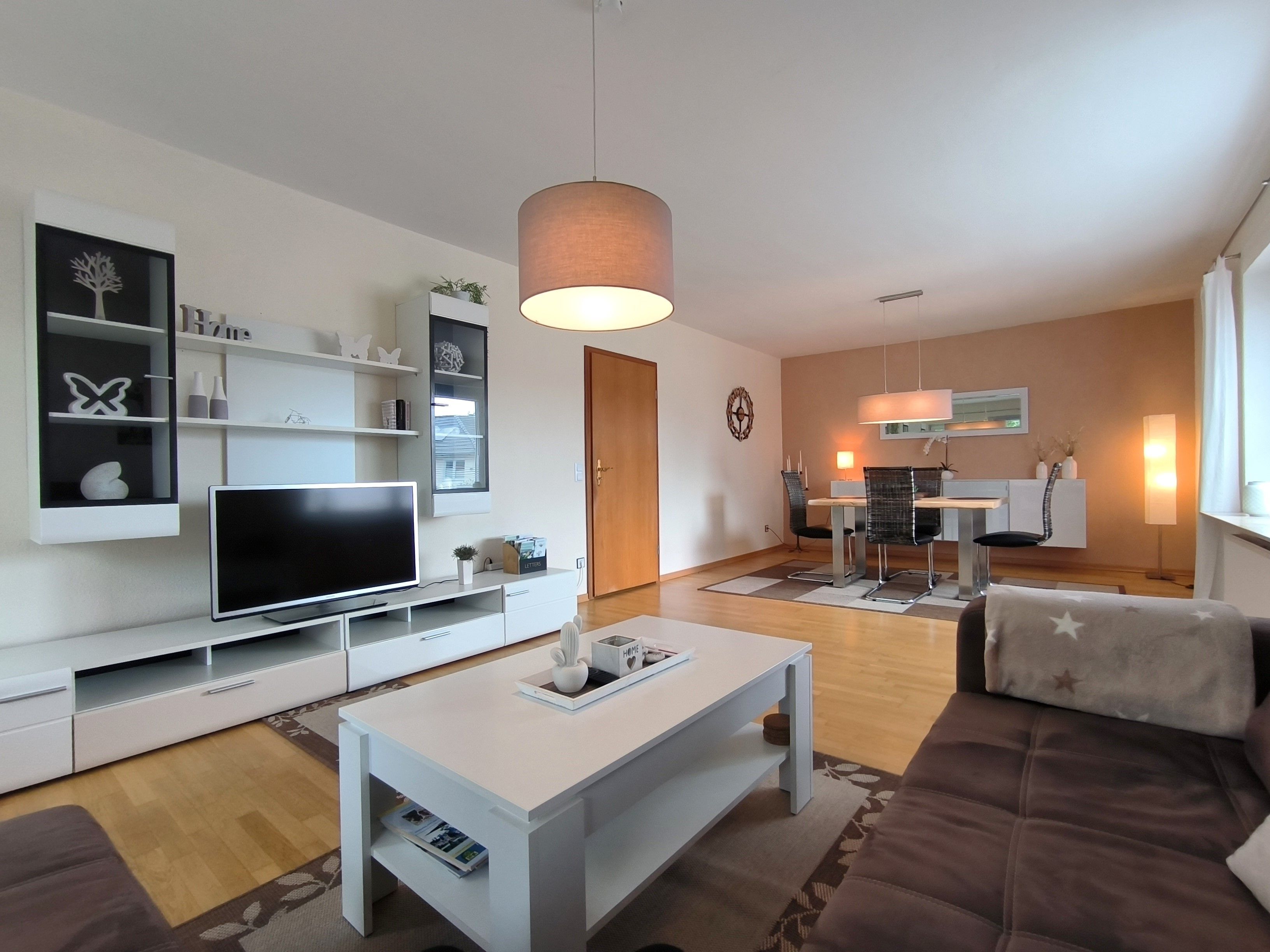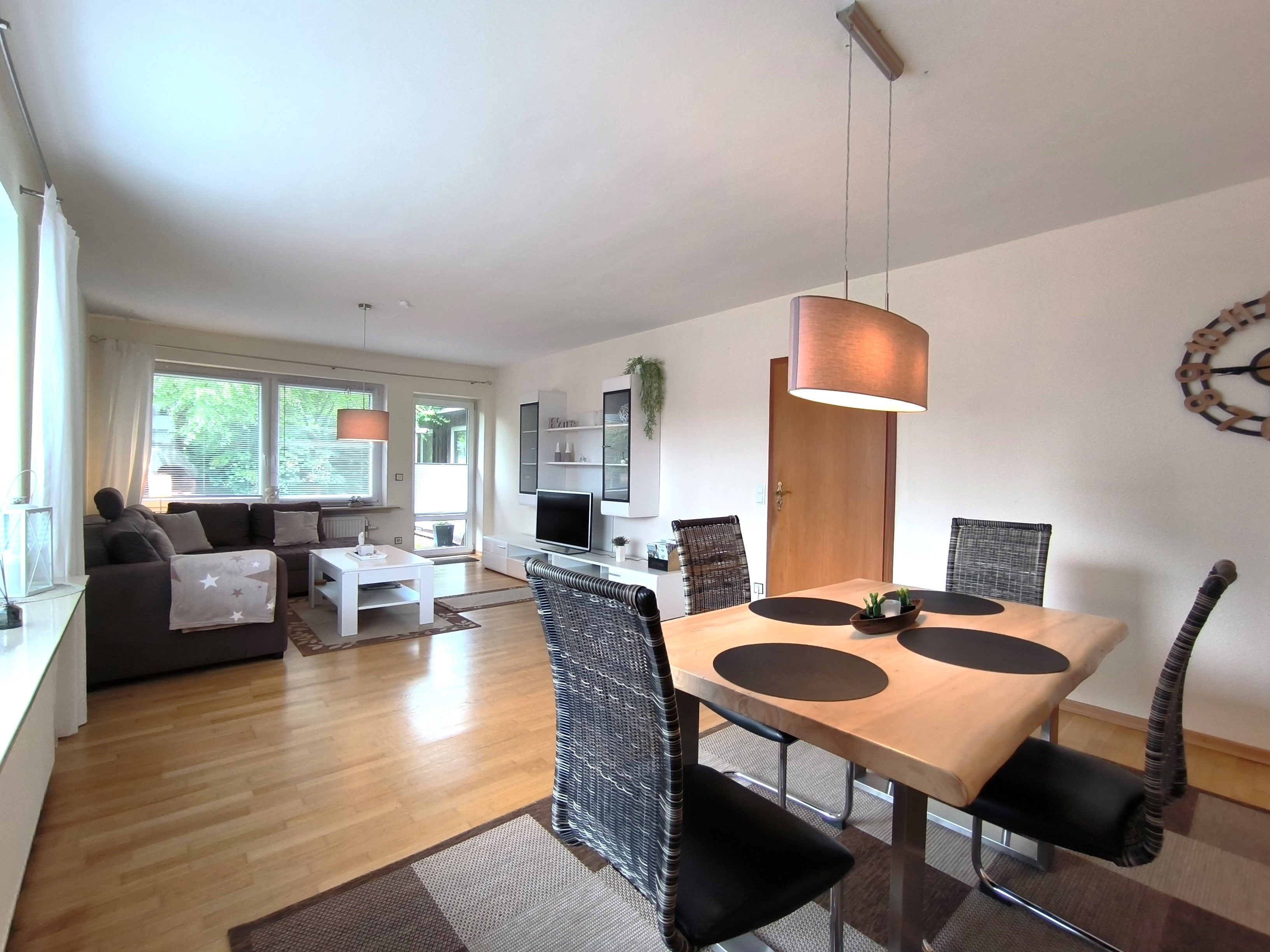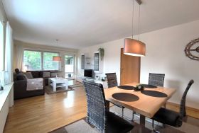 Die helle und moderne Ferienwohnung Kiara liegt im Erdgeschoss eines Einfamilienhauses in einer ruhigen Vorstadtsiedlung von Flensburg und ist ca. 96 qm groß. Sie verfügt über einen eigenen Eingang und einen Parkplatz und ist für bis zu vier Personen geeignet (zwei Schlafzimmer mit je zwei Schlafplätzen). Das große und gemütliche Wohnzimmer ist mit einem Esstisch und einer Sitzecke mit großem Sofa und TV eingerichtet. Von dort gelangt man auf die möblierte Terrasse hinter dem Haus. Die Küche ist vollständig ausgestattet (inklusive Geschirrspüler,) und zusätzlich zu dem geräumigen Wannenbad gibt es noch ein Gäste-WC. Auch Haustiere sind in der Ferienwohnung willkommen. In den Mietkosten sind Bettwäsche, Handtücher, der Internetanschluss und die Nebenkosten sowie der Parkplatz enthalten, für die Endreinigung wird eine Pauschale berechnet.