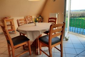 Ferienwohnung (70 m²), sep. Eingang, Etage, komfort. großzügiger Wohnraum nach Süden mit bodenstehenden Fenstern und Blick über die Landschaft, Küchenzeile als Einbauküche und Eßbereich, Mikrowelle, Geschirrspüler, Flachbildschirm-TV, WLan.