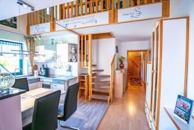 Die Ferienwohnung Nr. 13 in der Villa Seewind in Dahme bietet eine moderne Maisonette-Ausstattung auf zwei Etagen und ist für bis zu 4 Erwachsene oder 2 Erwachsene mit bis zu 3 Kindern geeignet. Das helle Wohnzimmer verfügt über ein gemütliches Ecksofa und einen Flach-TV mit Kabelfernsehen. Die offene Küchenzeile schließt an eine Essecke an. Es gibt ein Schlafzimmer mit einem Doppelbett (200 × 190 cm) und TV sowie ein zweites Schlafzimmer mit zwei Doppelbetten (200 × 190 cm und 200 × 145 cm). Das Duschbad ist mit einem WC ausgestattet. Eine Kinderspielecke zum Malen und Basteln sowie ein Kinderreisebett und Hochstuhl sind ebenfalls vorhanden. Alle Fenster sind mit Außenjalousien versehen. WLAN ist kostenfrei nutzbar, und ein PKW-Außenstellplatz befindet sich direkt hinter dem Haus. Hunde bis 40 cm Schulterhöhe sind gegen Gebühr willkommen.