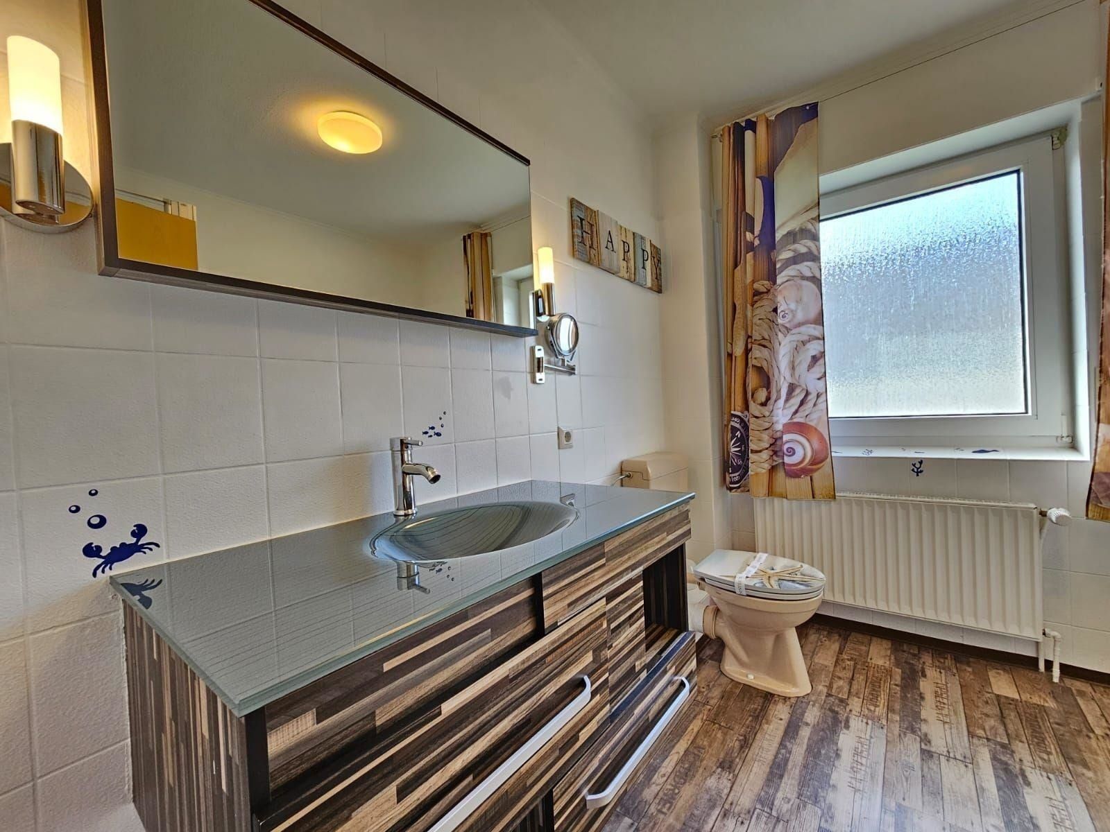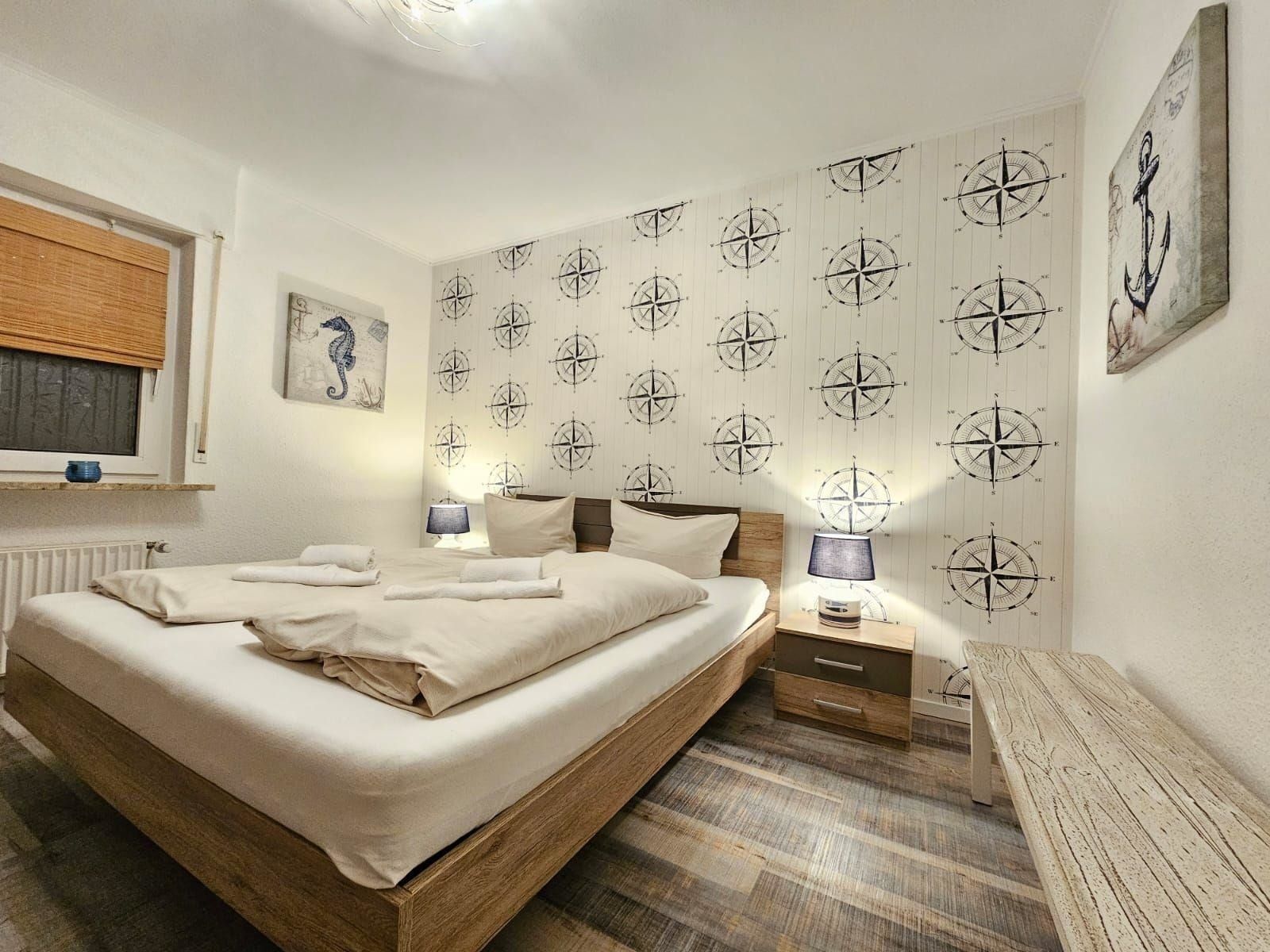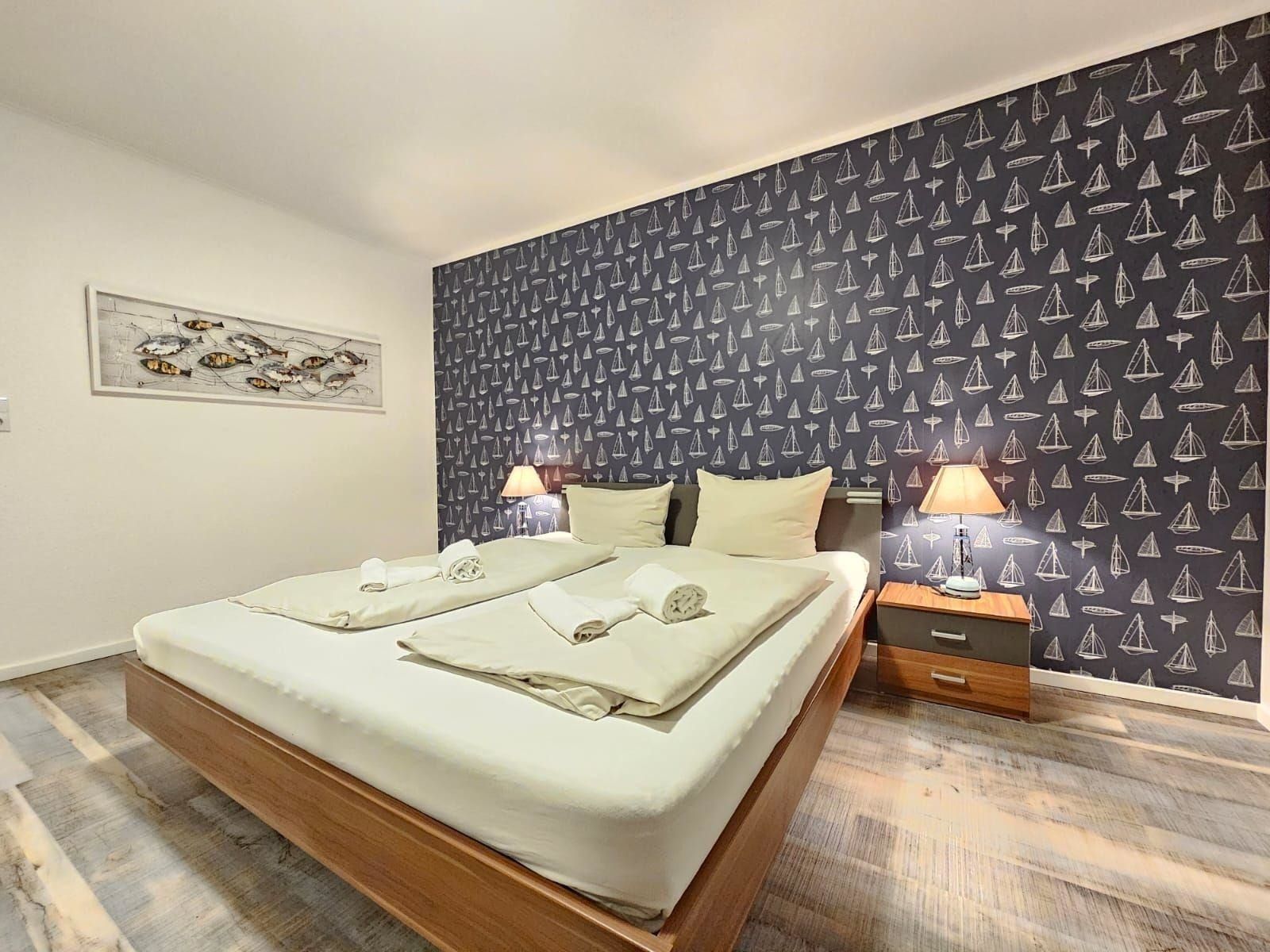 Die Ferienwohnung bietet eine komfortable Unterkunft mit zwei gemütlichen Schlafzimmern, die jeweils mit einem Doppelbett ausgestattet sind. Die separate Küche ist ideal für Selbstversorger und verfügt über modernste Geräte, darunter einen Geschirrspüler, Elektro-/Gasherd, Backofen, Mikrowelle, Kühlschrank mit Gefriermöglichkeit sowie eine Kaffeemaschine und Toaster. Das Badezimmer mit Fenster bietet sowohl eine Badewanne als auch ein Duschbad, und es stehen ein Gäste-WC sowie ein Haartrockner zur Verfügung.