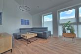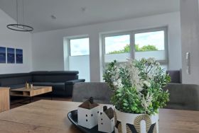 Die Wohnung ist über einen Fahrstuhl erreichbar und bietet mit Esstisch, Sofa und Sessel einen gemütlichen Raum zum Entspannen. Willkommen in einer Oase der Ruhe und des Komforts.