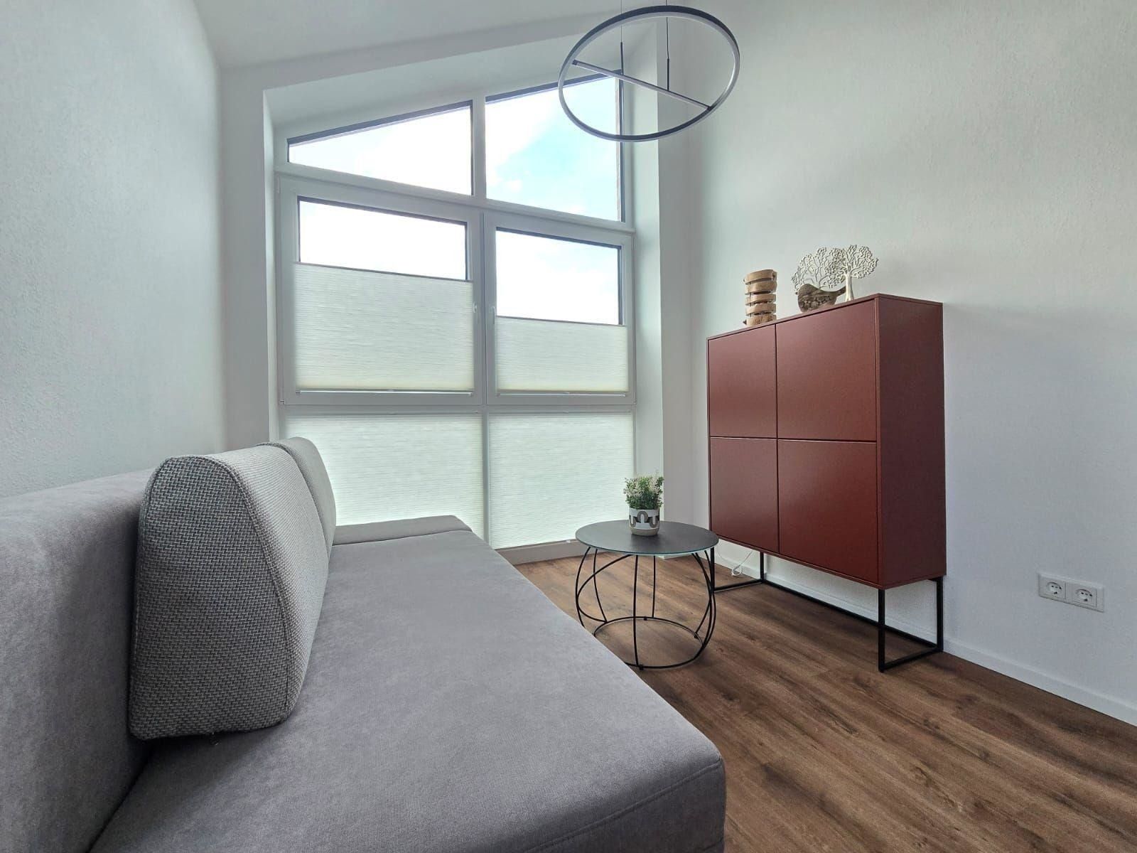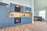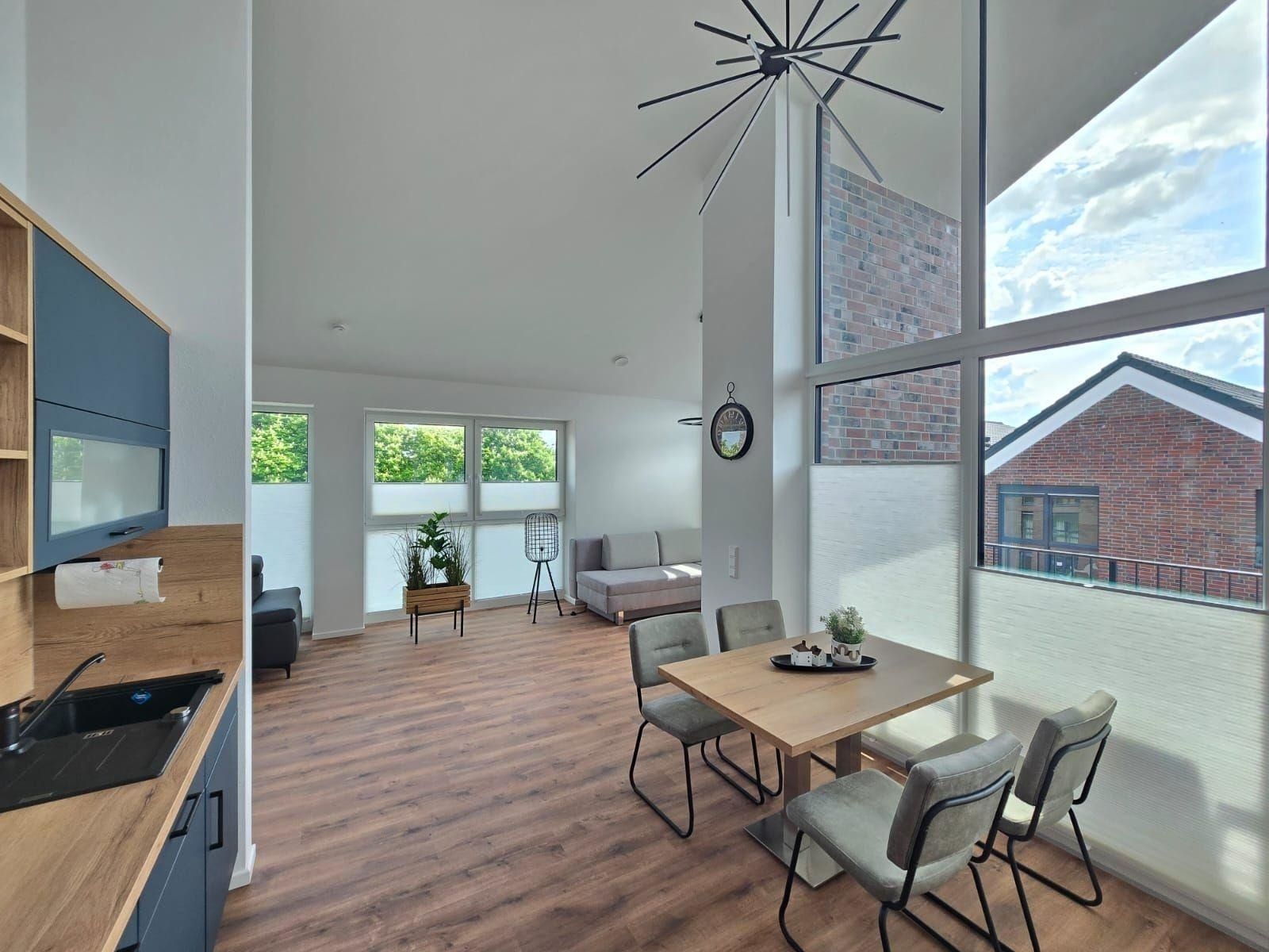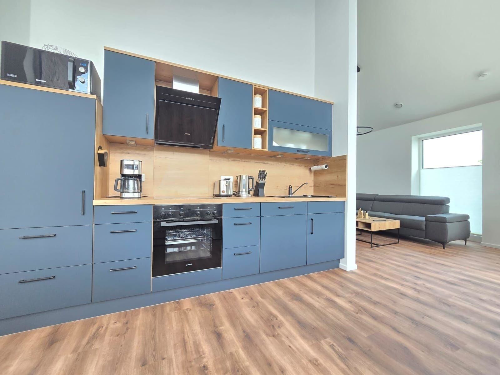 Die Ferienwohnung bietet einen modernen Rückzugsort mit durchdachter Ausstattung. Im offenen Wohnschlafzimmer befindet sich ein komfortables Doppelbett und eine Schlafcouch, die zusätzliche Schlafmöglichkeiten bietet. Die voll ausgestattete Küche verfügt über einen Elektro-/Gasherd, Backofen, Geschirrspüler, Kühlschrank, Mikrowelle sowie eine Kaffeemaschine und Toaster, um kulinarische Wünsche zu erfüllen. Ein Duschbad mit Haartrockner rundet die Badezimmerausstattung ab.