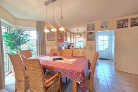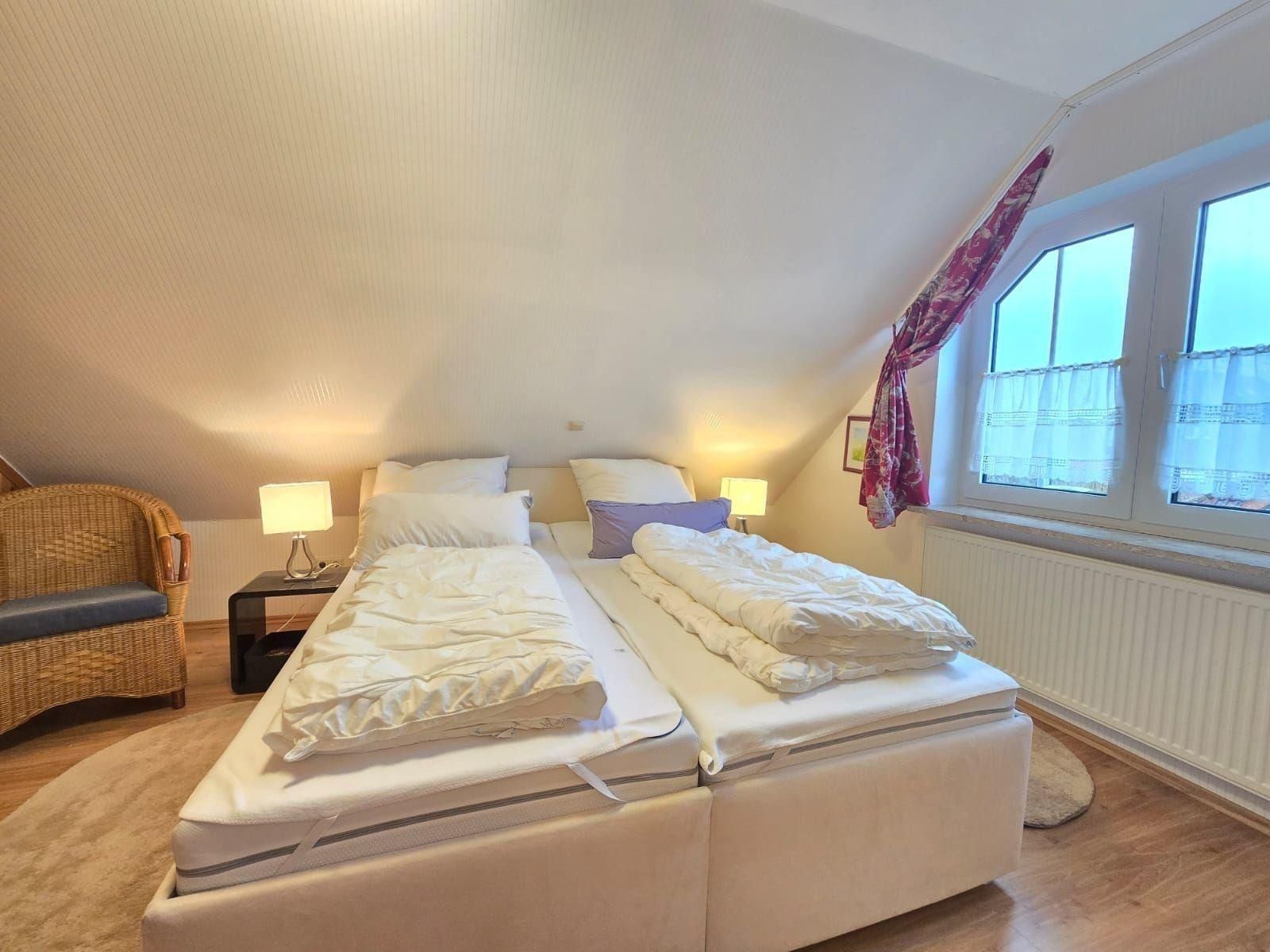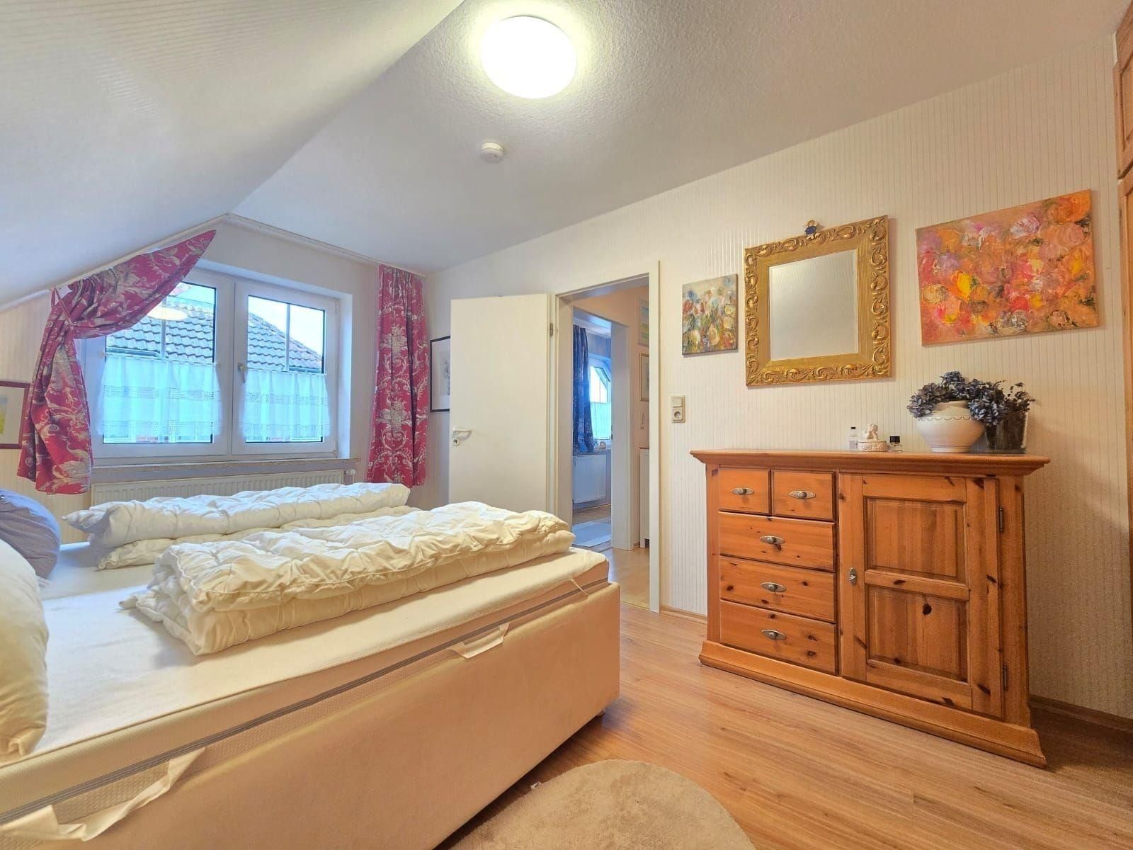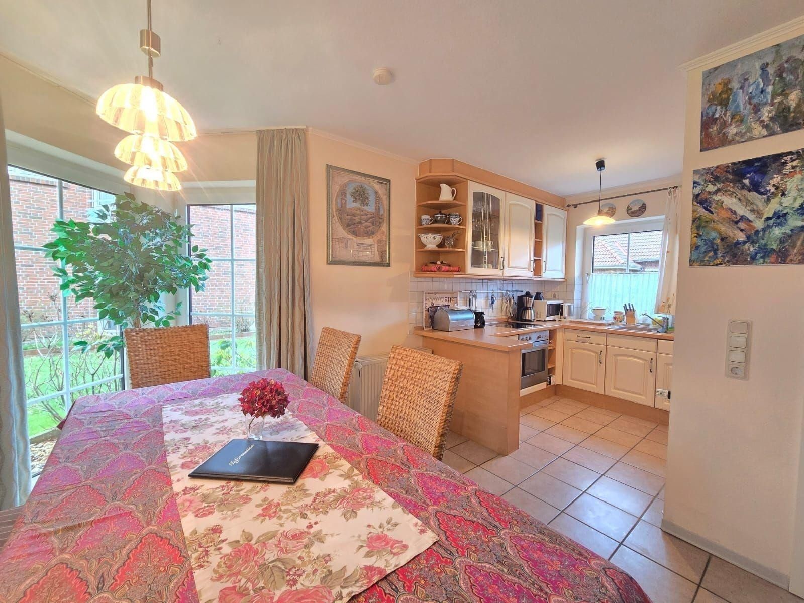 Die Ferienwohnung bietet einladende Räumlichkeiten, die ideal für einen erholsamen Aufenthalt gestaltet sind. Sie verfügt über zwei Schlafzimmer mit jeweils einem komfortablen Doppelbett, die allergikerfreundlich eingerichtet sind. Das offene Wohnkonzept verbindet den Wohnbereich mit einer voll ausgestatteten Küche, die Elektro-/Gasherd, Geschirrspüler, Backofen und Mikrowelle umfasst. Ein Essbereich mit Esstisch lädt zu gemeinsamen Mahlzeiten ein. Komfort für die ganze Familie wird durch die Bereitstellung von Kinderhochstuhl und Kinderspielzeug gewährleistet.