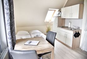 In Ihrem Appartement finden Sie eine Schlafcouch, die am Tage platzsparend als Wohnlandschaft umfunktioniert werden kann. Ein Plus für dieses niedliche Appartement. Ein Kleiderschrank steht Ihnen zur Verfügung, der genug Platz für Ihren Kofferinhalt bietet. Multimedial finden Sie hier einen Flachbildfernseher mit Kabelanschluss zur Verfügung. Die Küchenecke ist praktischerweise im Wohn-/Schlafraum untergebracht.