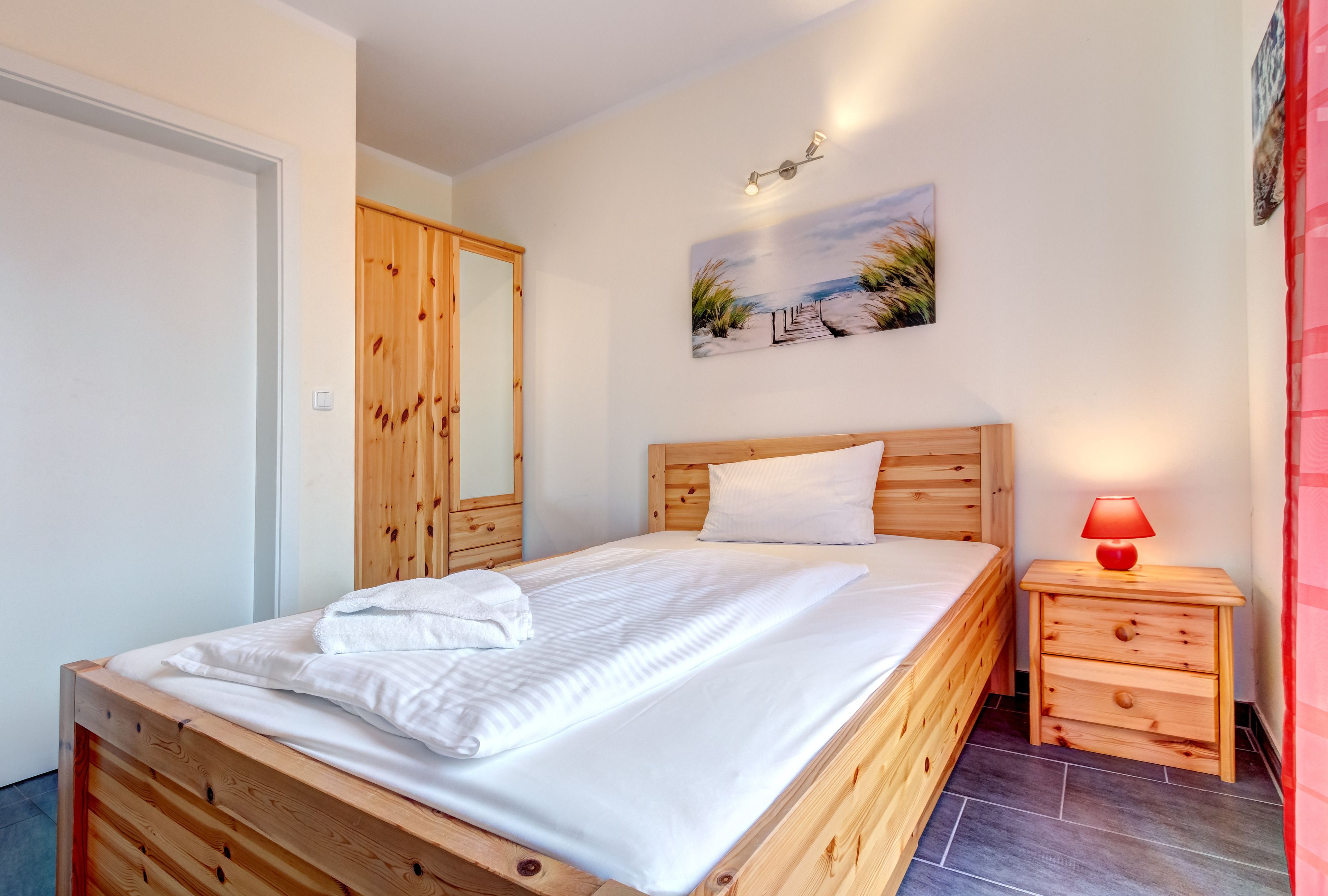 Es erwarten Sie zwei Schlafzimmer: eins mit einem Doppelbett, das andere mit einem französischen Bett.