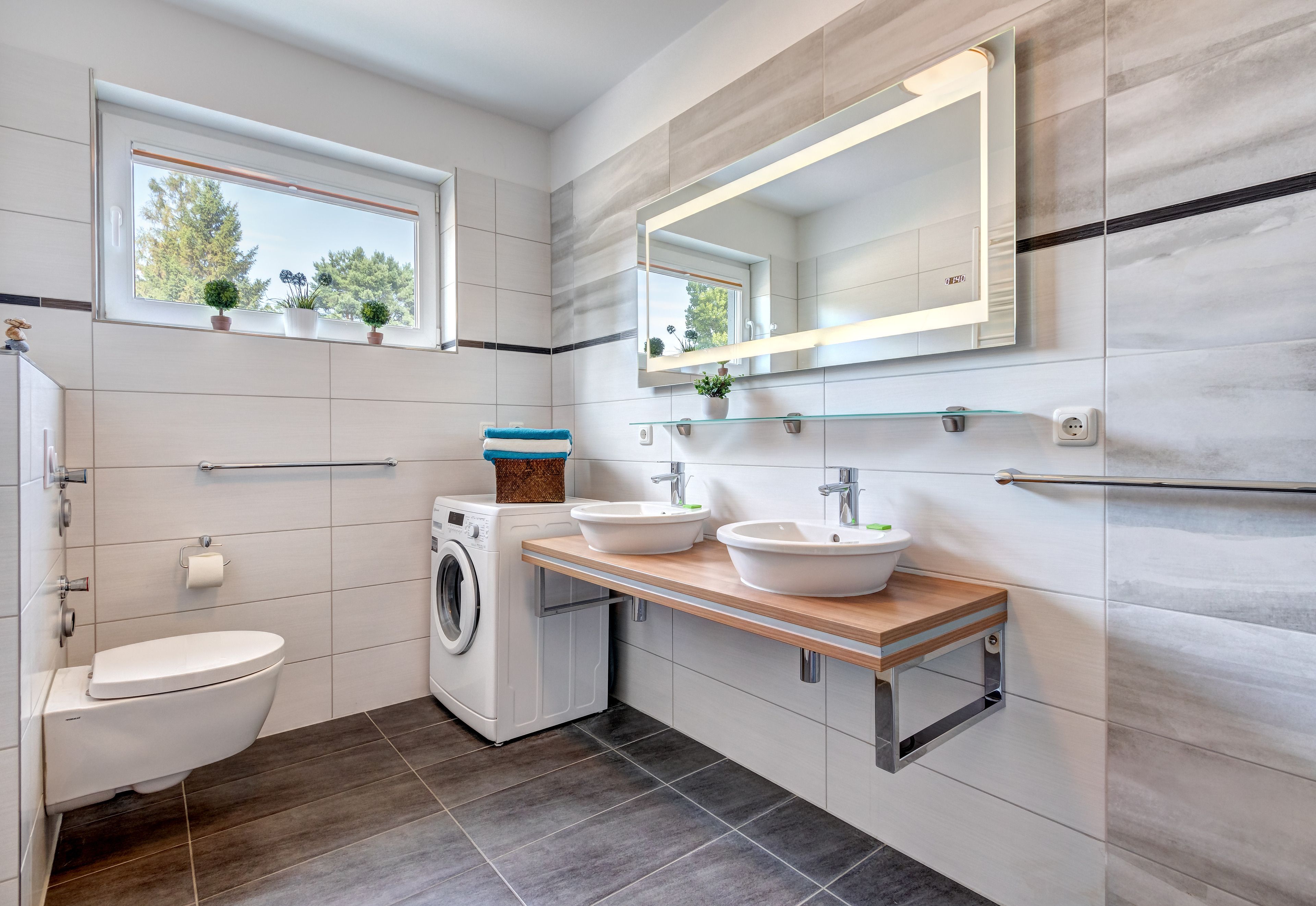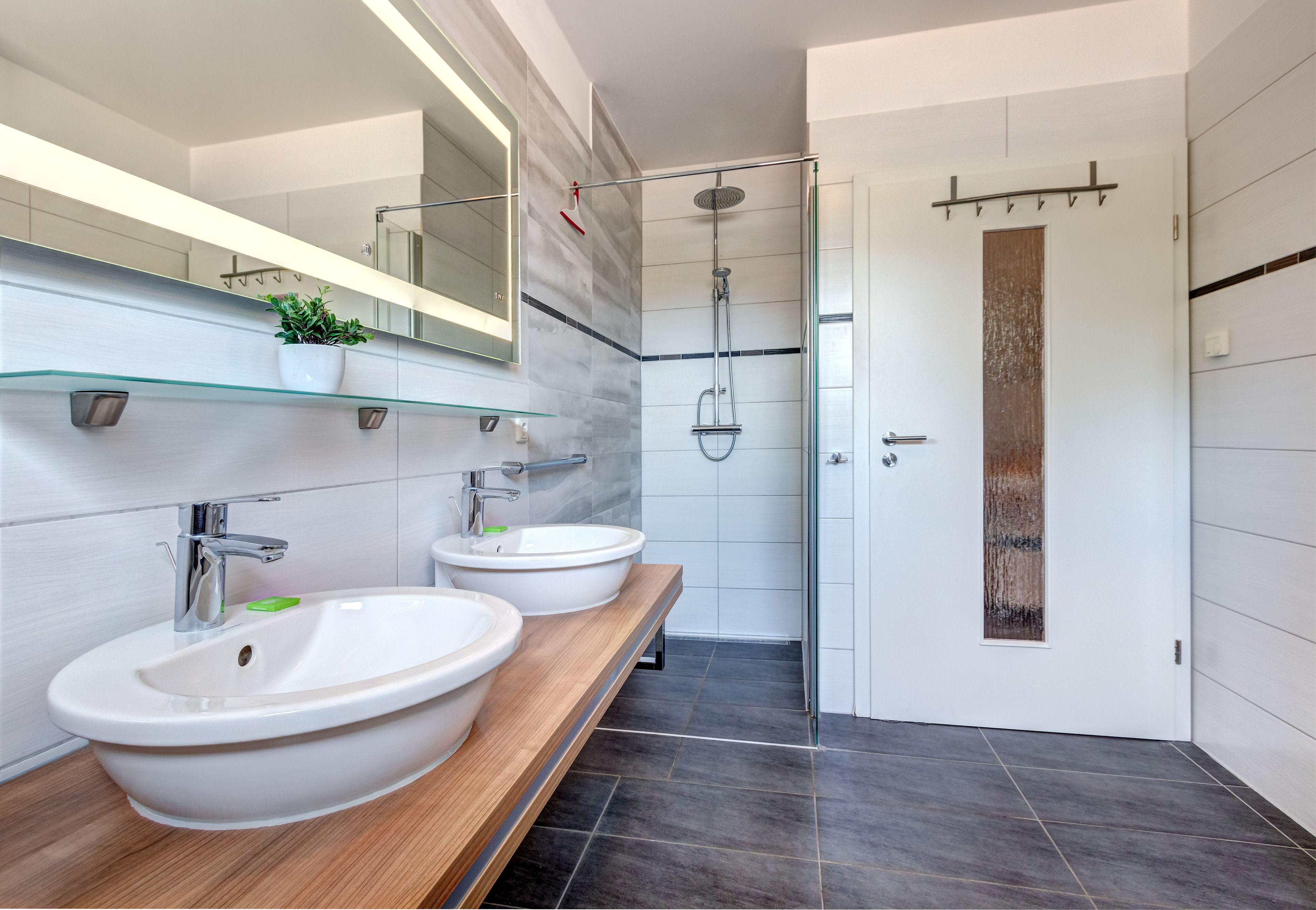 Das Badezimmer ist modern mit einer Walk-in Dusche, WC und einem doppel Waschbecken ausgestattet. Ebenso verfügt die Wohnung über eine eigene Waschmaschiene.