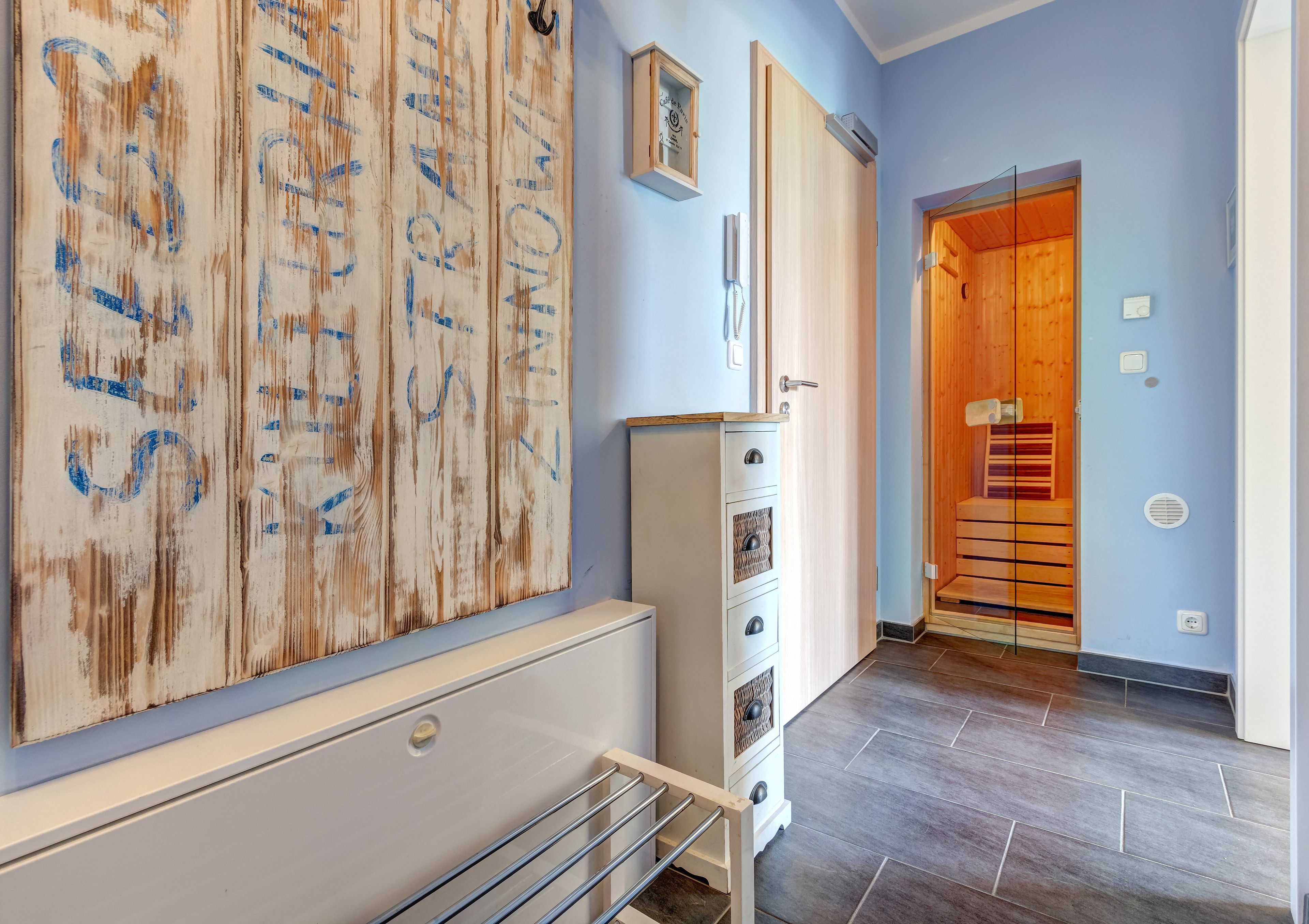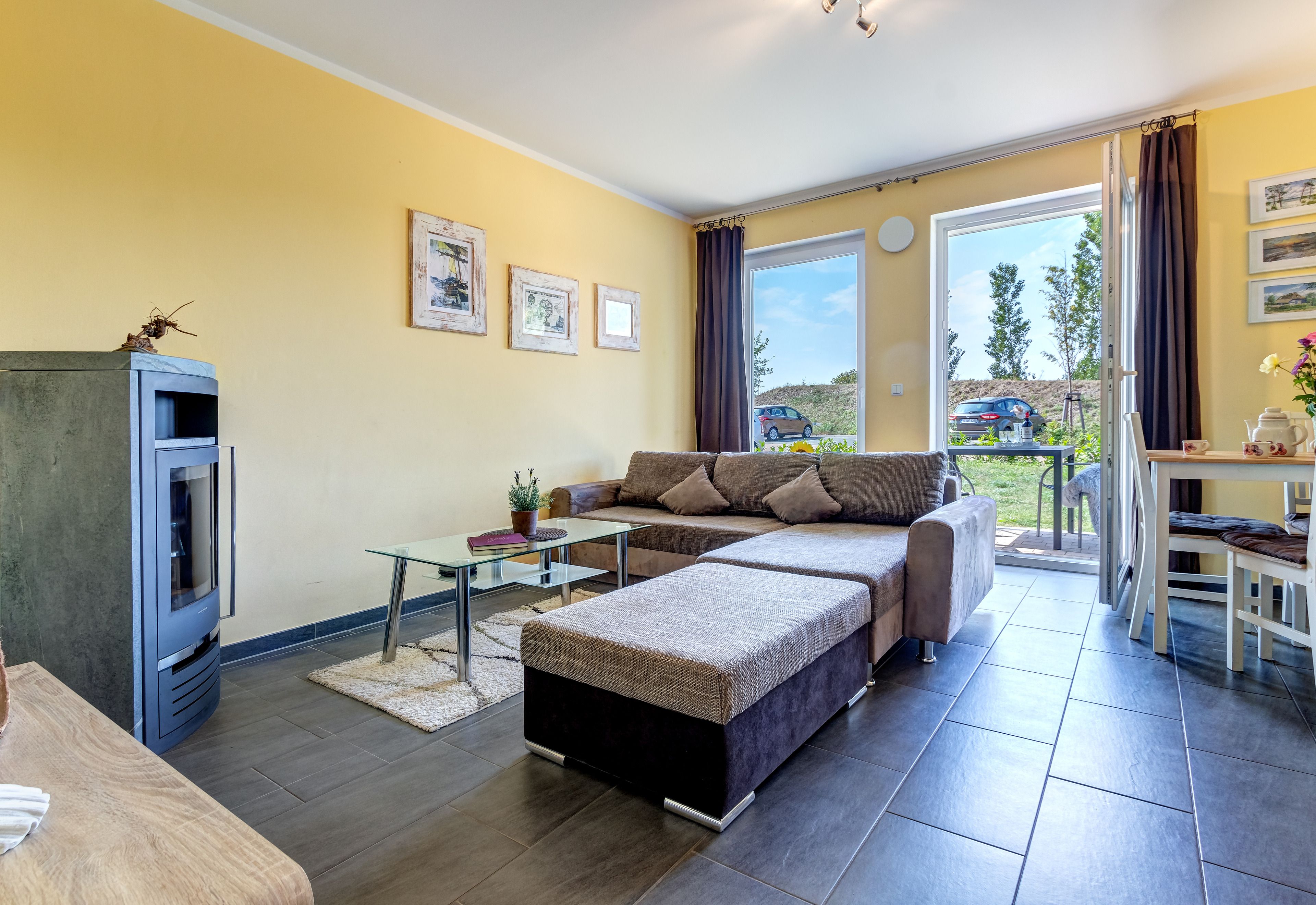 In der Ferienwohnung erwartet Sie eine komfortable Eckcouch, eine offene Küche und eine Terrasse mit Gartenblick. Ein Kaminofen sorgt für behagliche Wärme und die Sauna lädt nach dem Strandbesuch zu entspannten, wohltuenden Stunden ein.