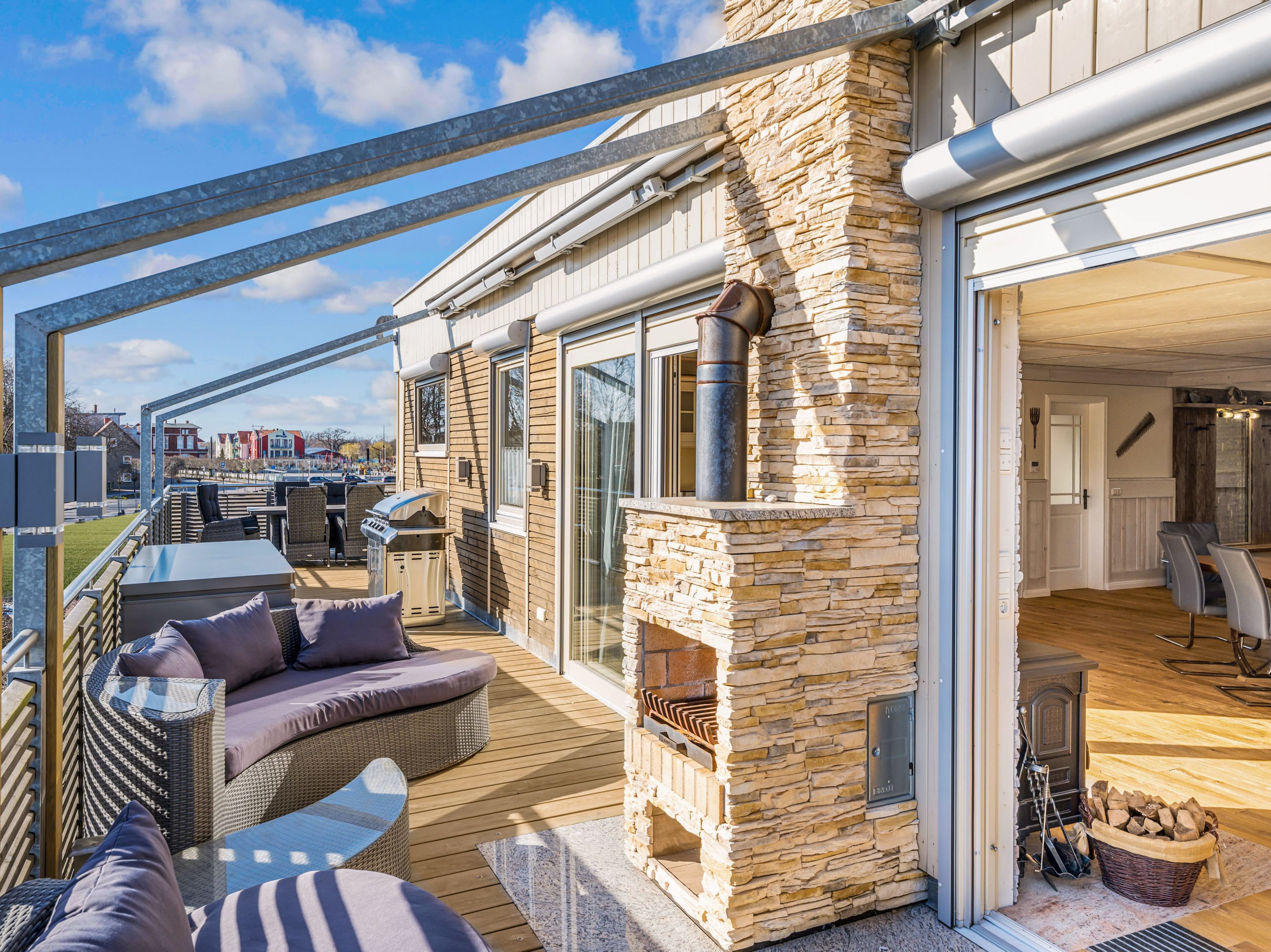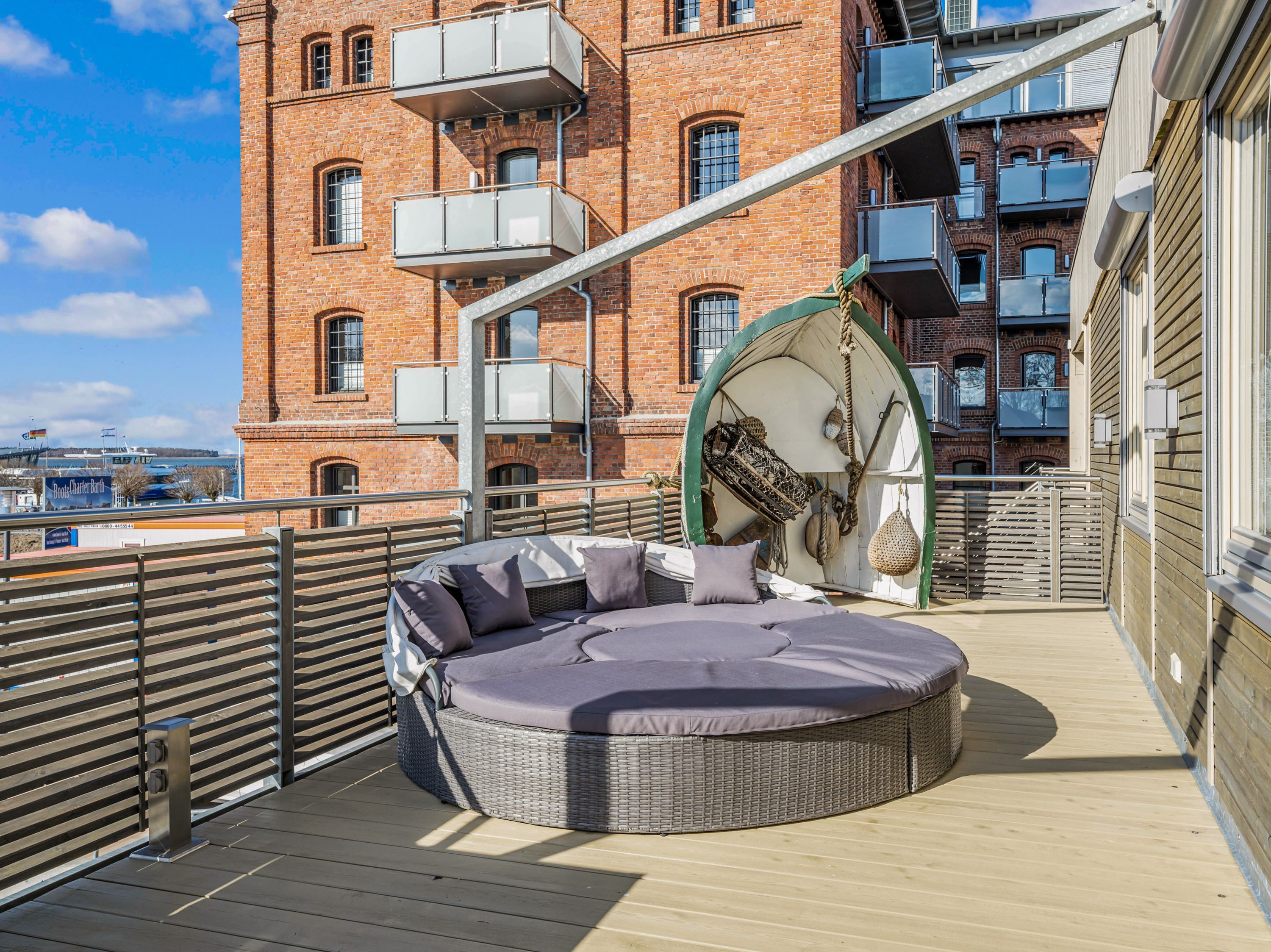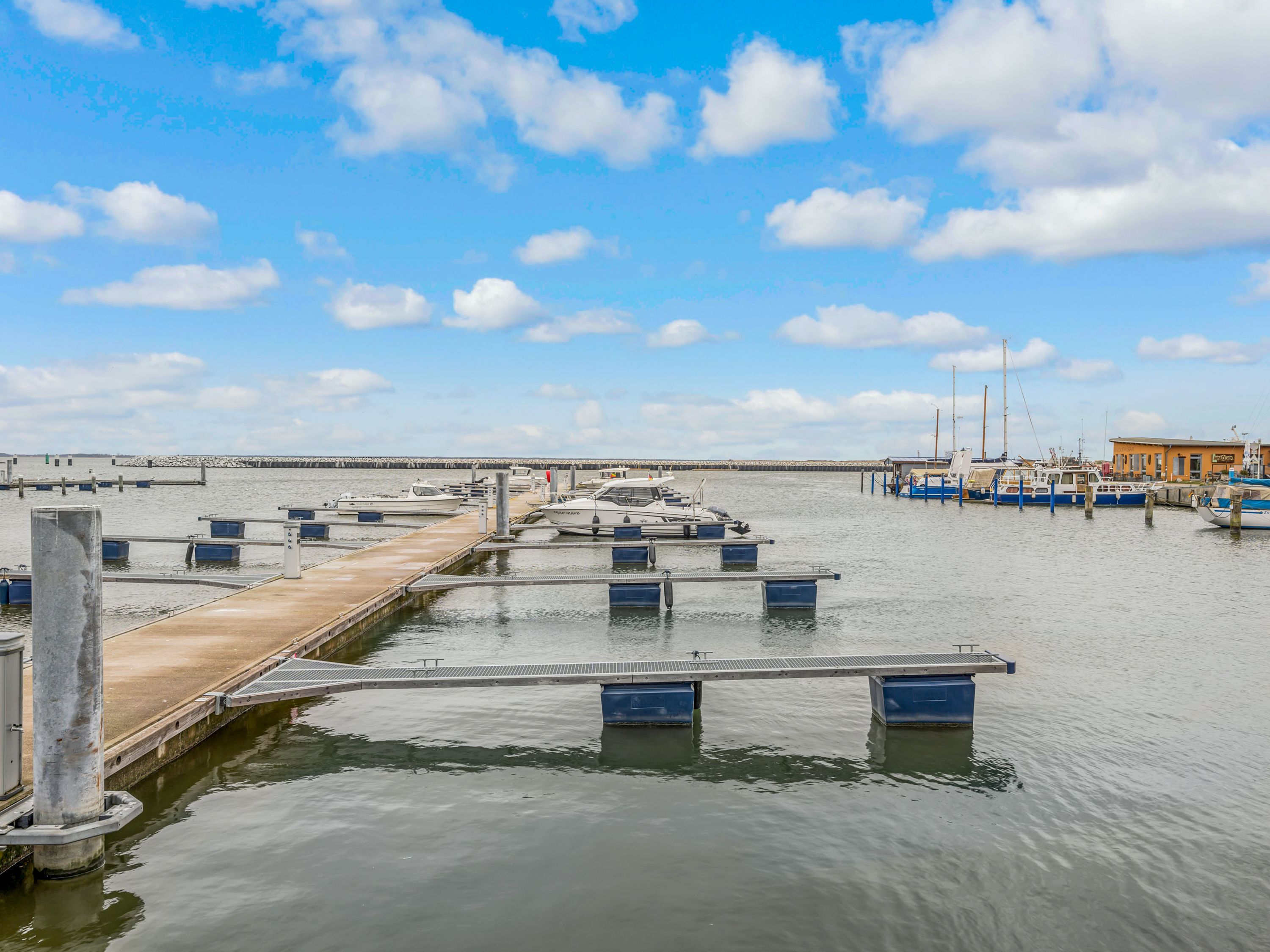 Auch der Außenbereich lässt keine Wünsche offen. Auf der großzügigen Terrasse erwarten dich ein beheizbarer Jacuzzi, bequeme Sonnenliegen und ein Gasgrill für genussvolle Stunden im Freien. Vier Fahrräder stehen im abschließbaren Fahrradraum bereit und laden zu spontanen Touren entlang des Hafens oder durch die Boddenlandschaft ein.