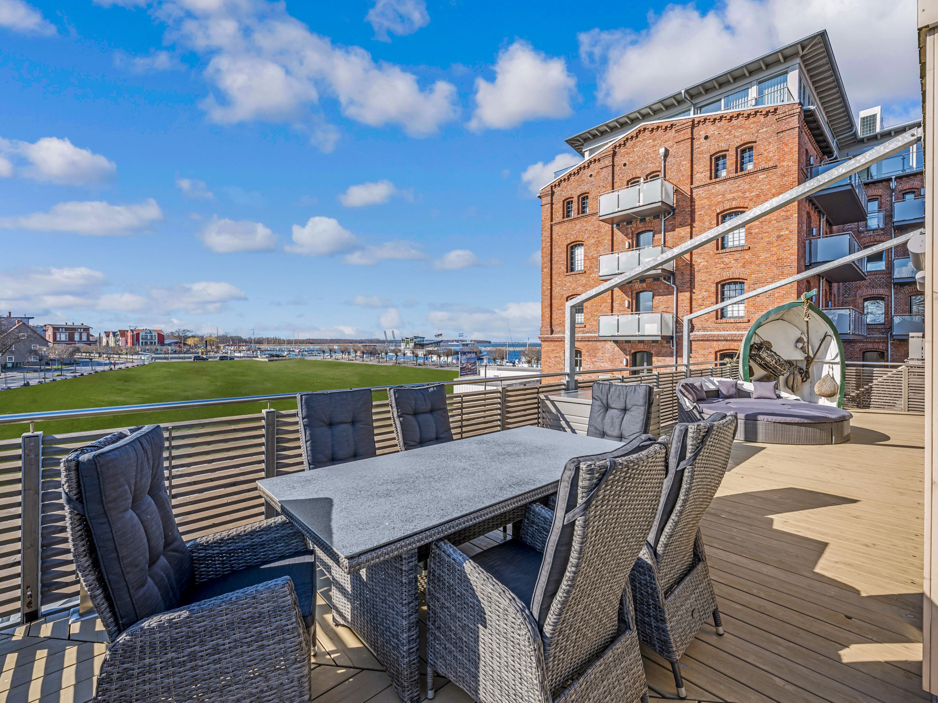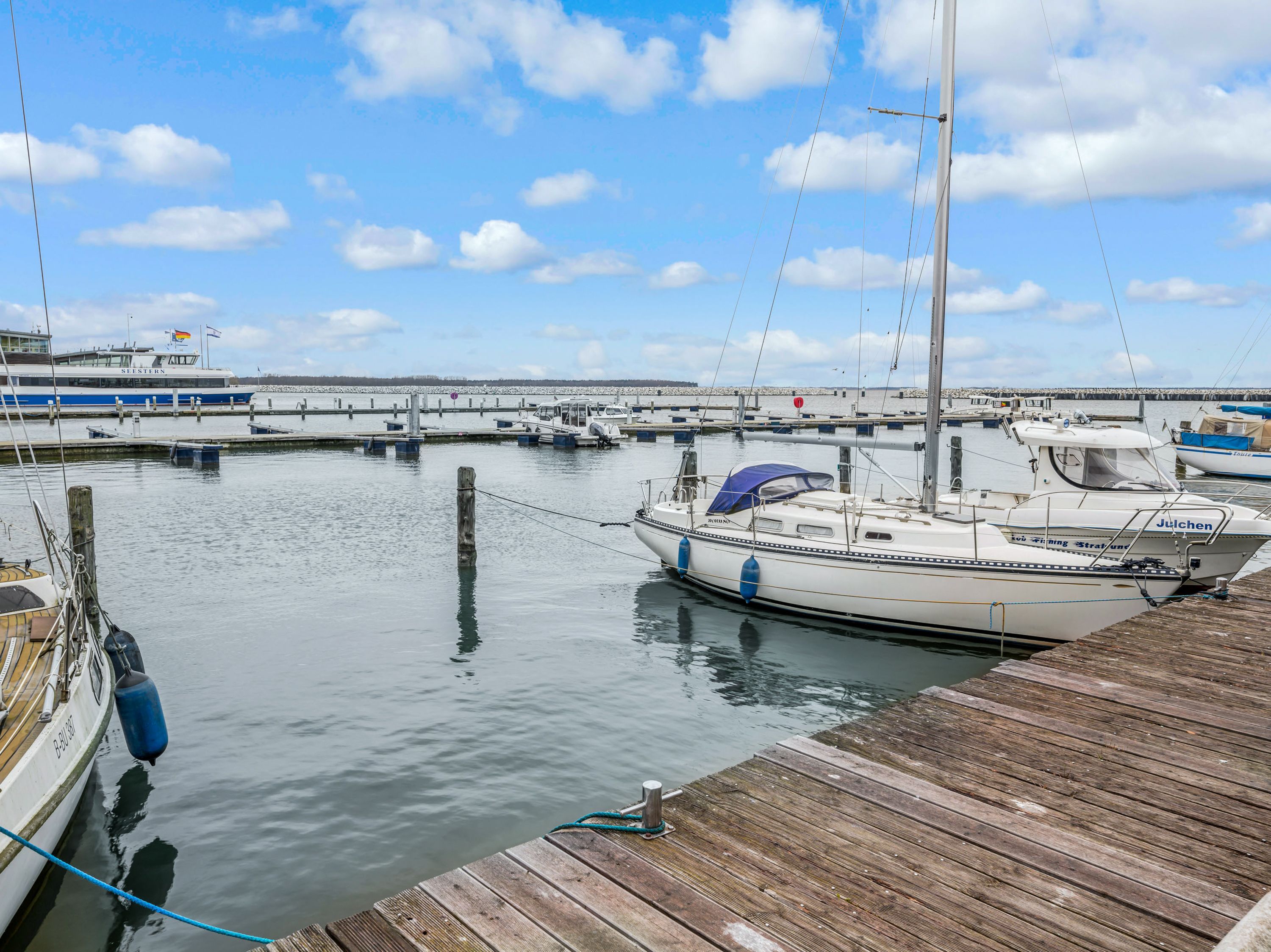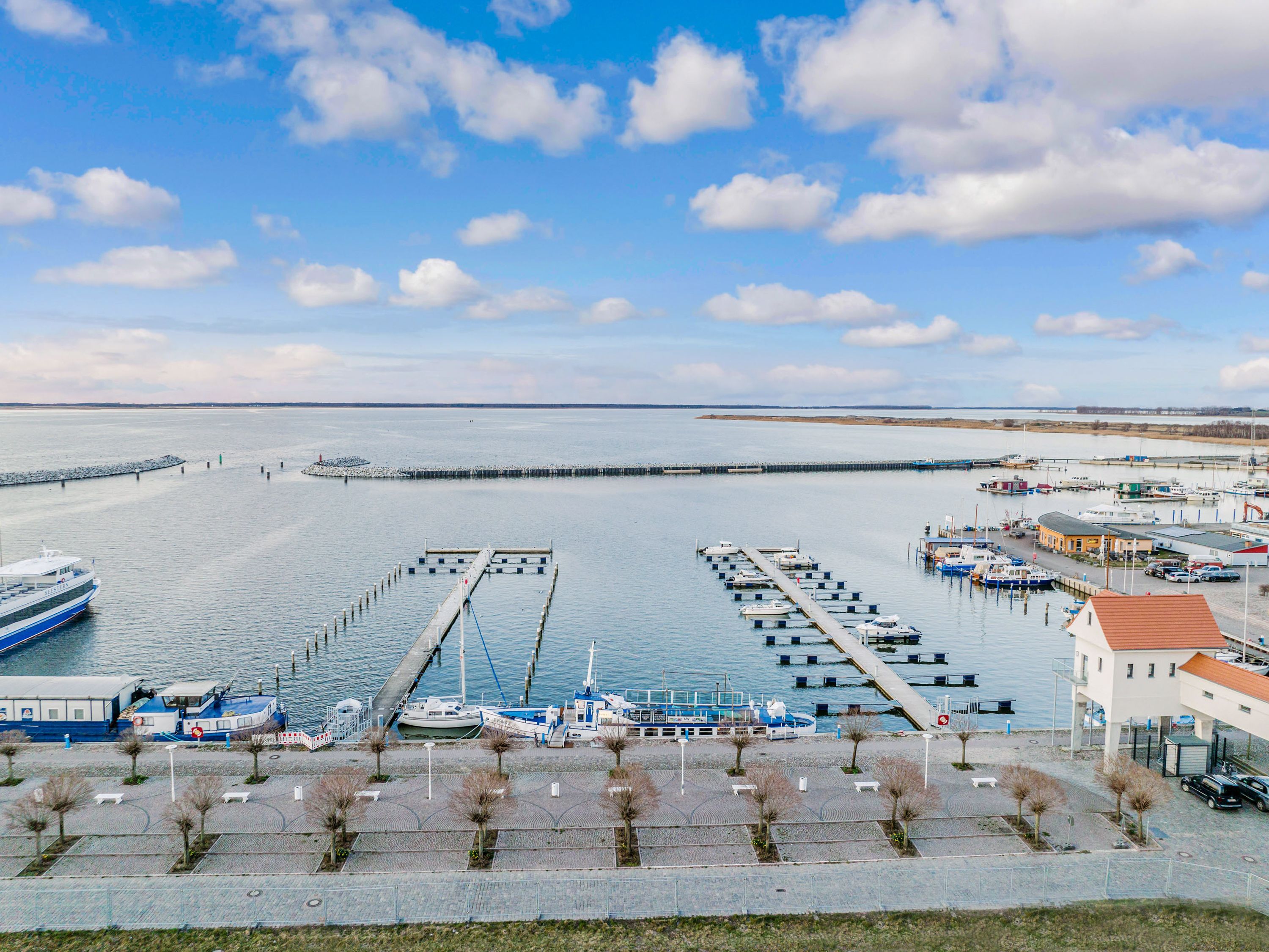 Auch der Außenbereich lässt keine Wünsche offen. Auf der großzügigen Terrasse erwarten dich ein beheizbarer Jacuzzi, bequeme Sonnenliegen und ein Gasgrill für genussvolle Stunden im Freien. Vier Fahrräder stehen im abschließbaren Fahrradraum bereit und laden zu spontanen Touren entlang des Hafens oder durch die Boddenlandschaft ein.