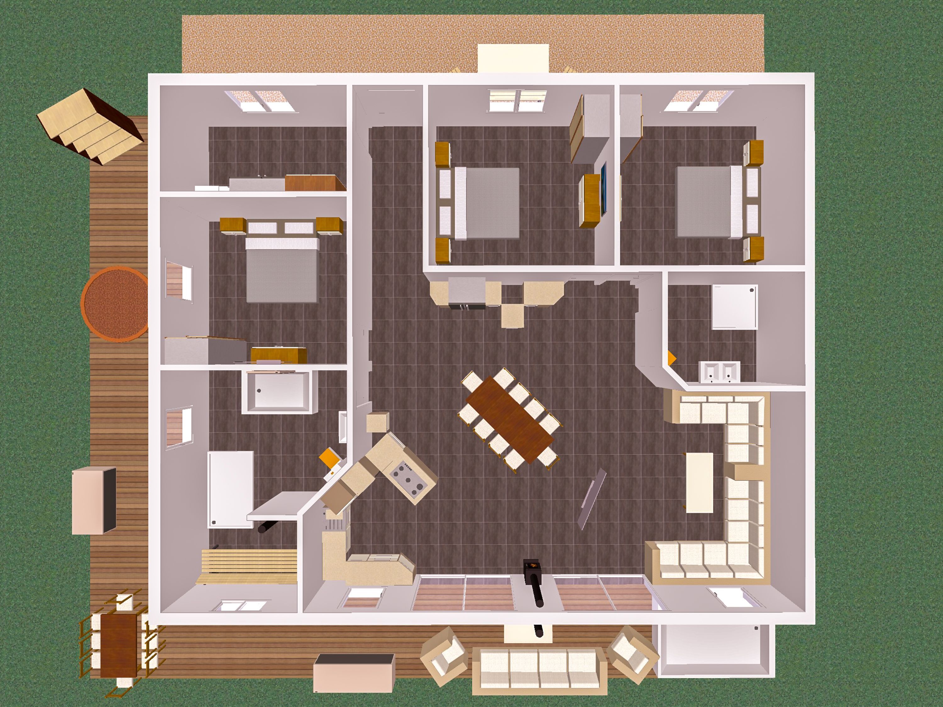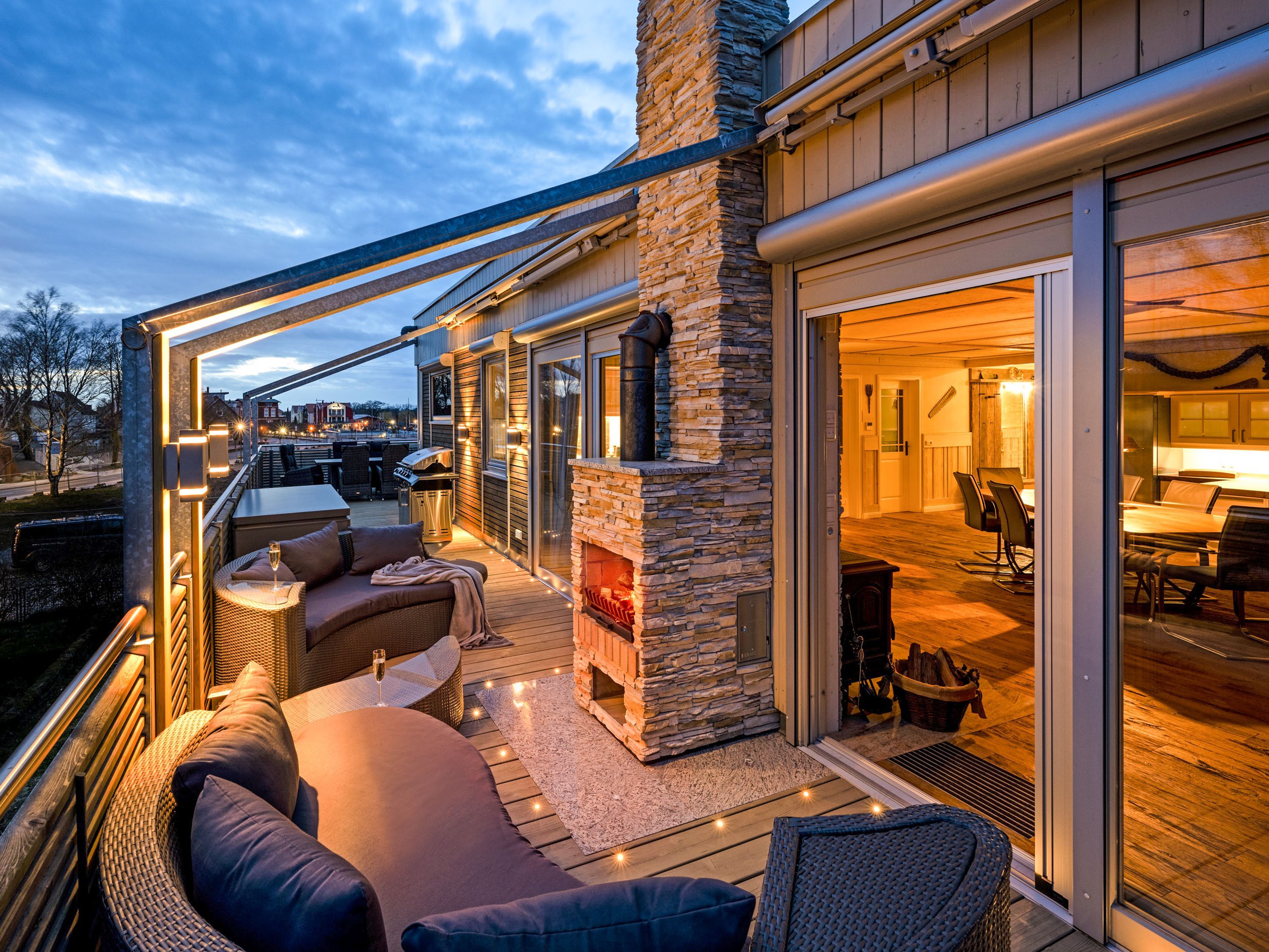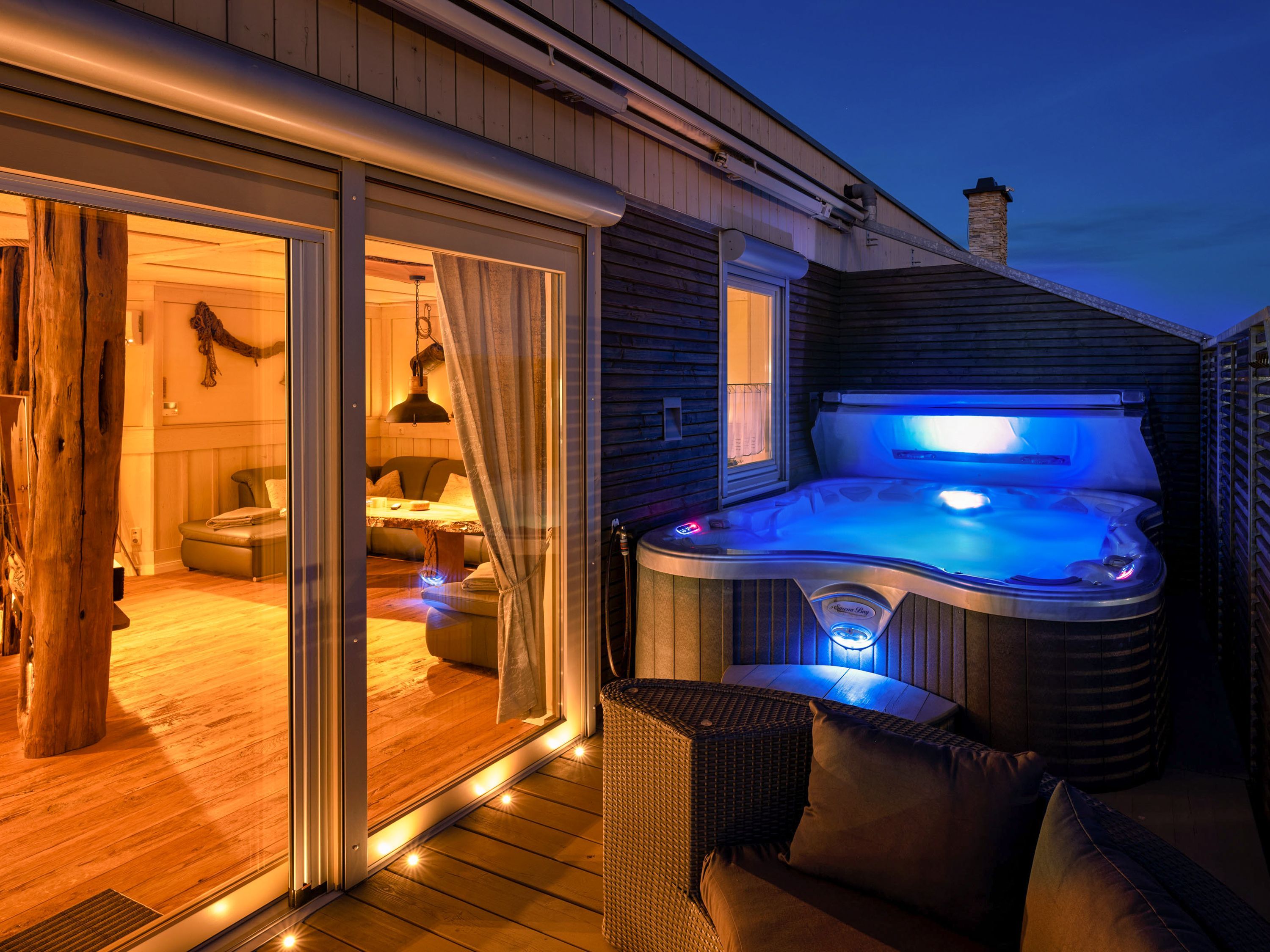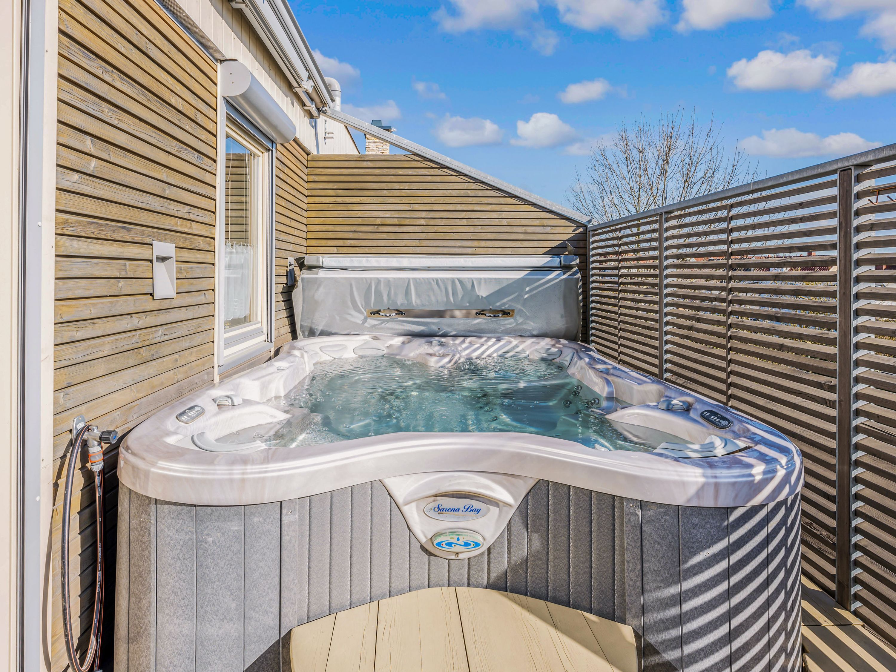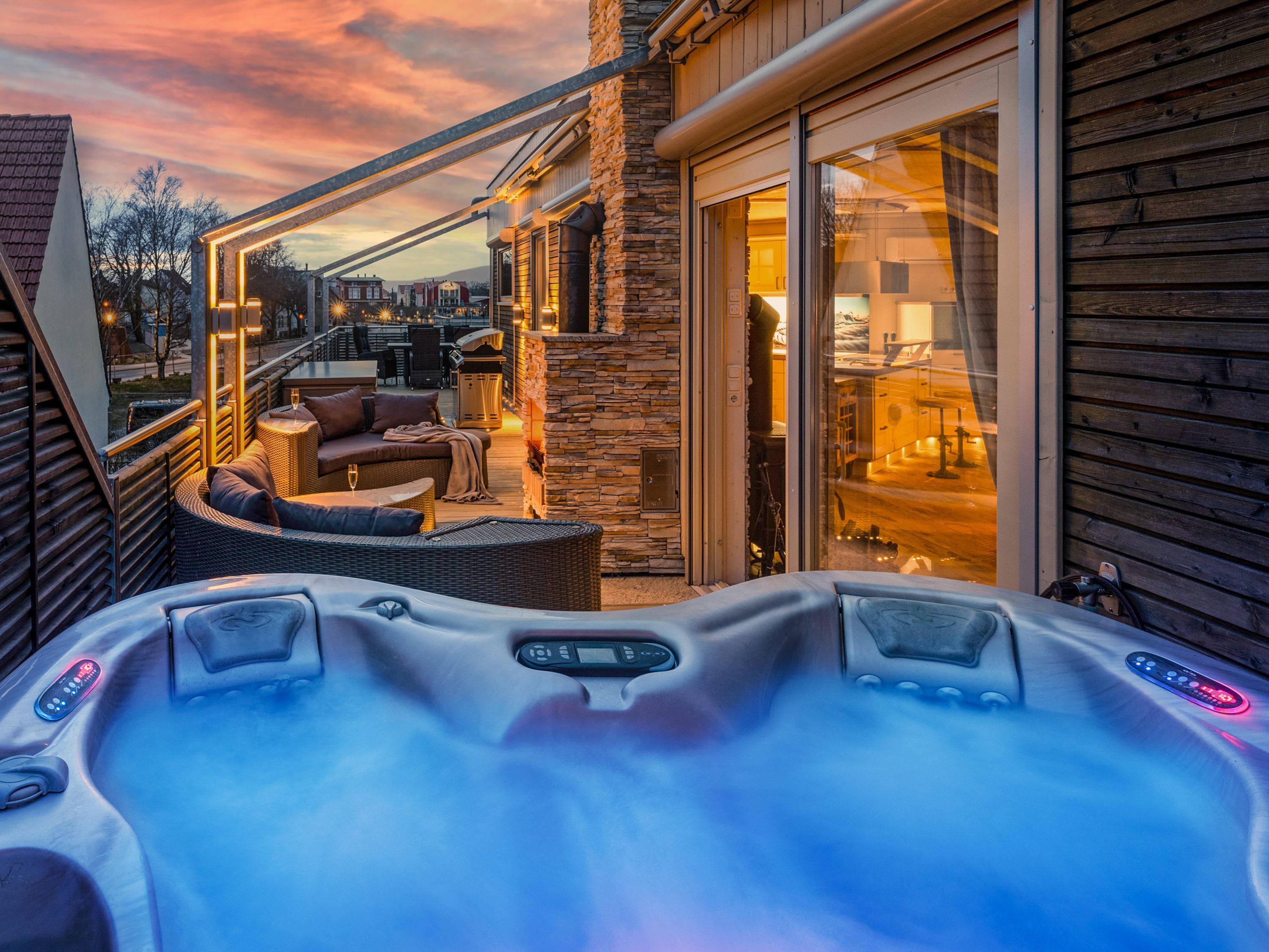 Ein echtes Highlight ist der großzügige Außenbereich: Die große Terrasse lädt mit beheizbarem Jacuzzi, Sonnenliegen und Gasgrill zu entspannten Stunden unter freiem Himmel ein. Ob ein ruhiger Morgen, ein geselliger Grillabend oder ein entspannter Ausklang des Tages im warmen Wasser - hier findest du den perfekten Ort zum Abschalten.